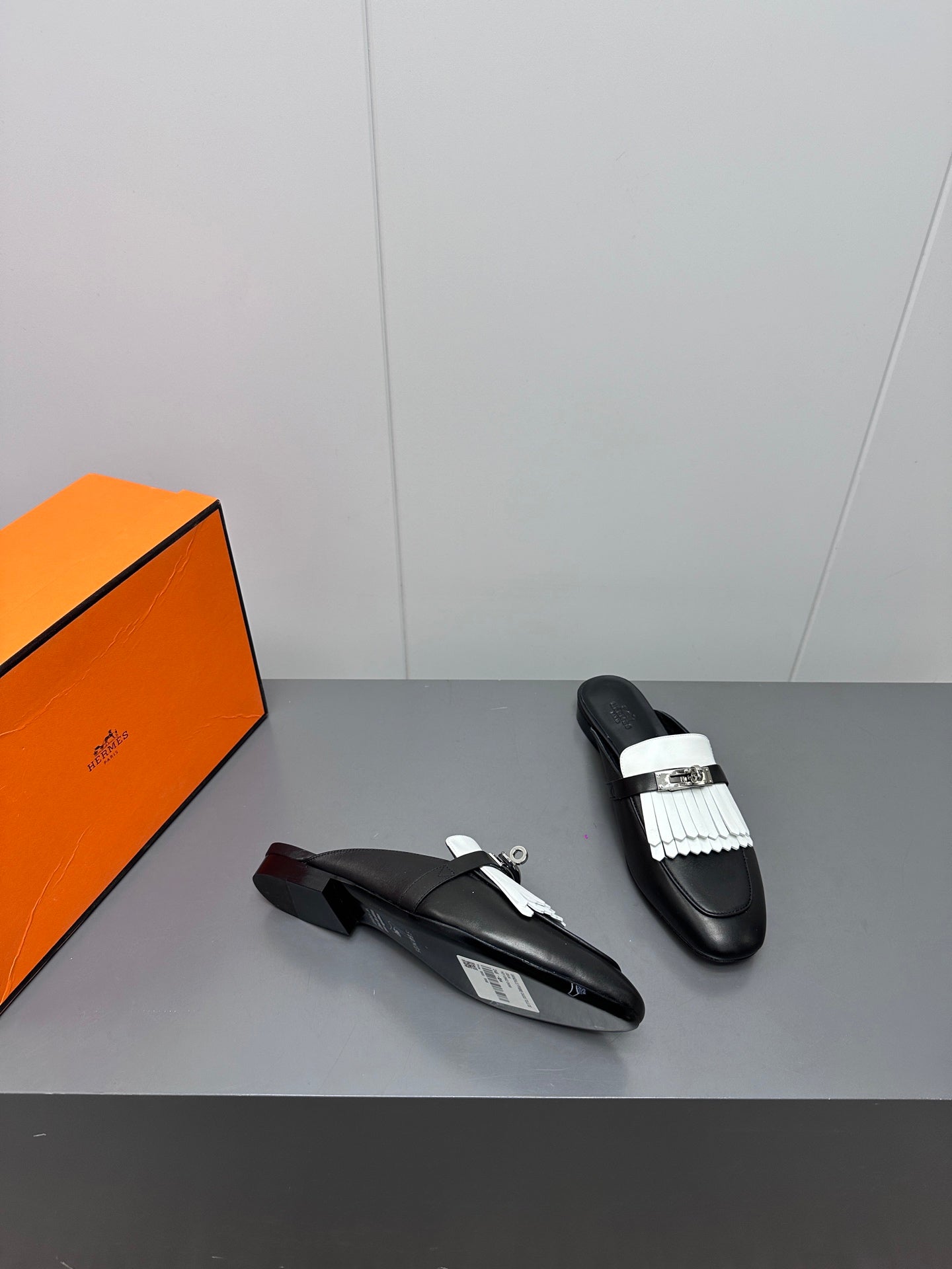 0Z MULE IN BLACK LAMBSKIN WITH WHITE FRINGE DETAIL