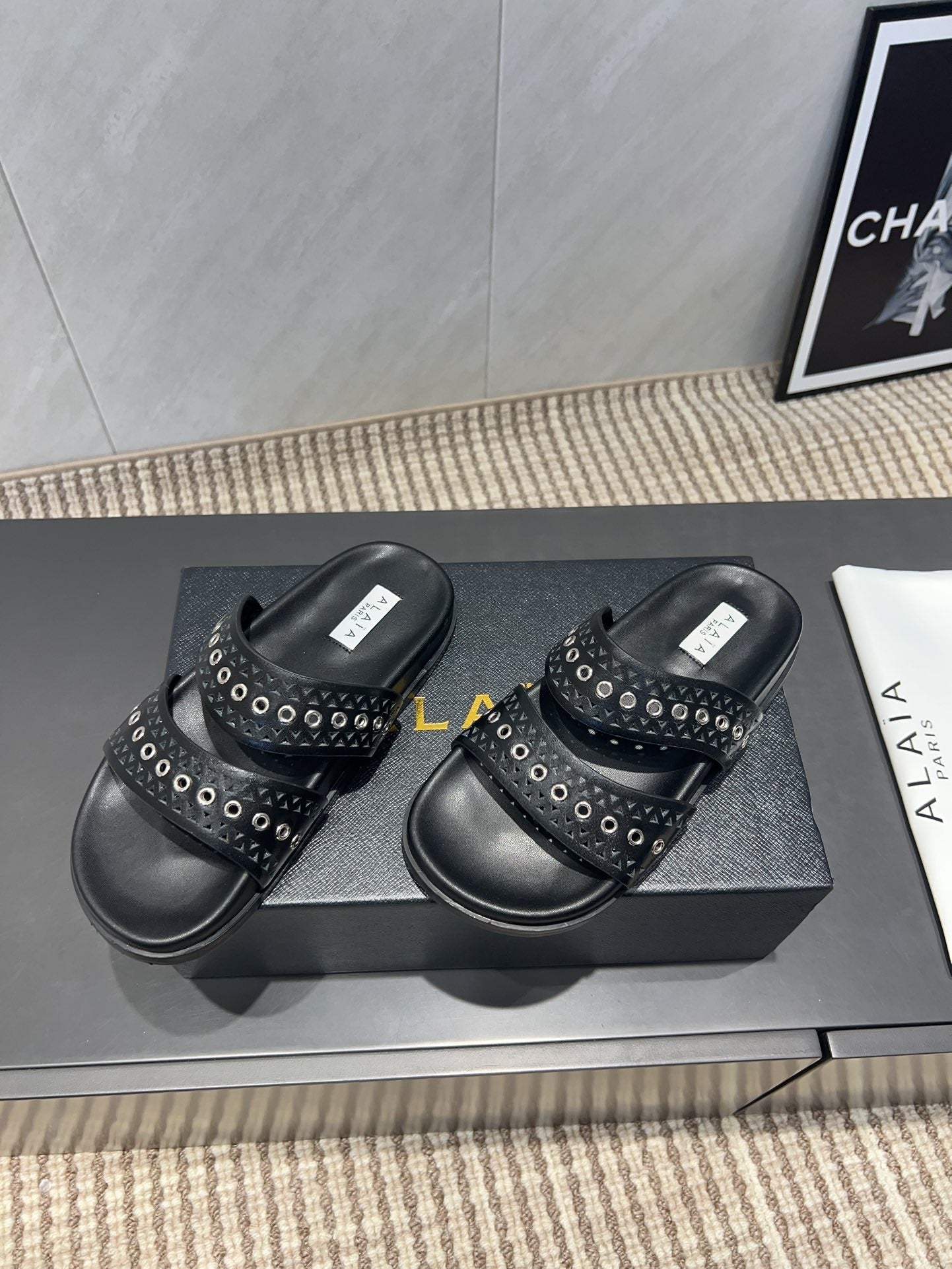 ALAIA DOUBLE-STRAP SANDALS 25S IN BLACK CALFSKIN