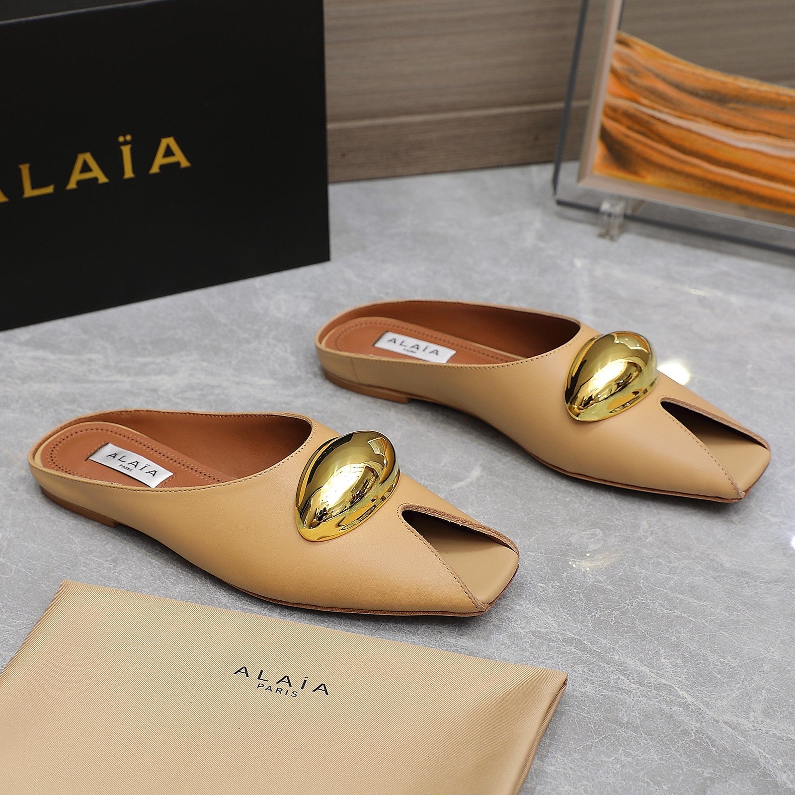 ALAIA FLAT MULE IN SEPIA TAN LAMBSKIN WITH GOLD HARDWARE