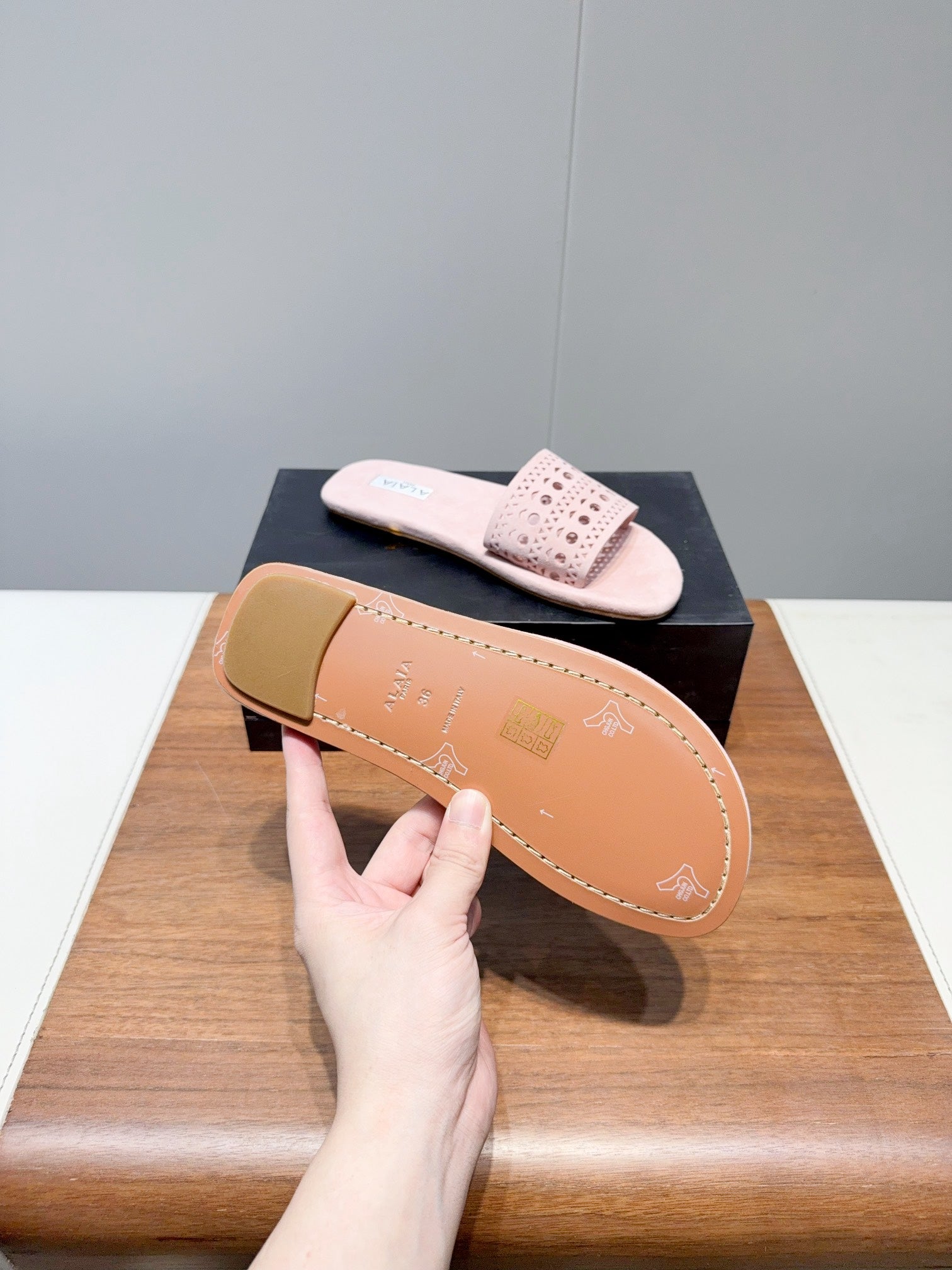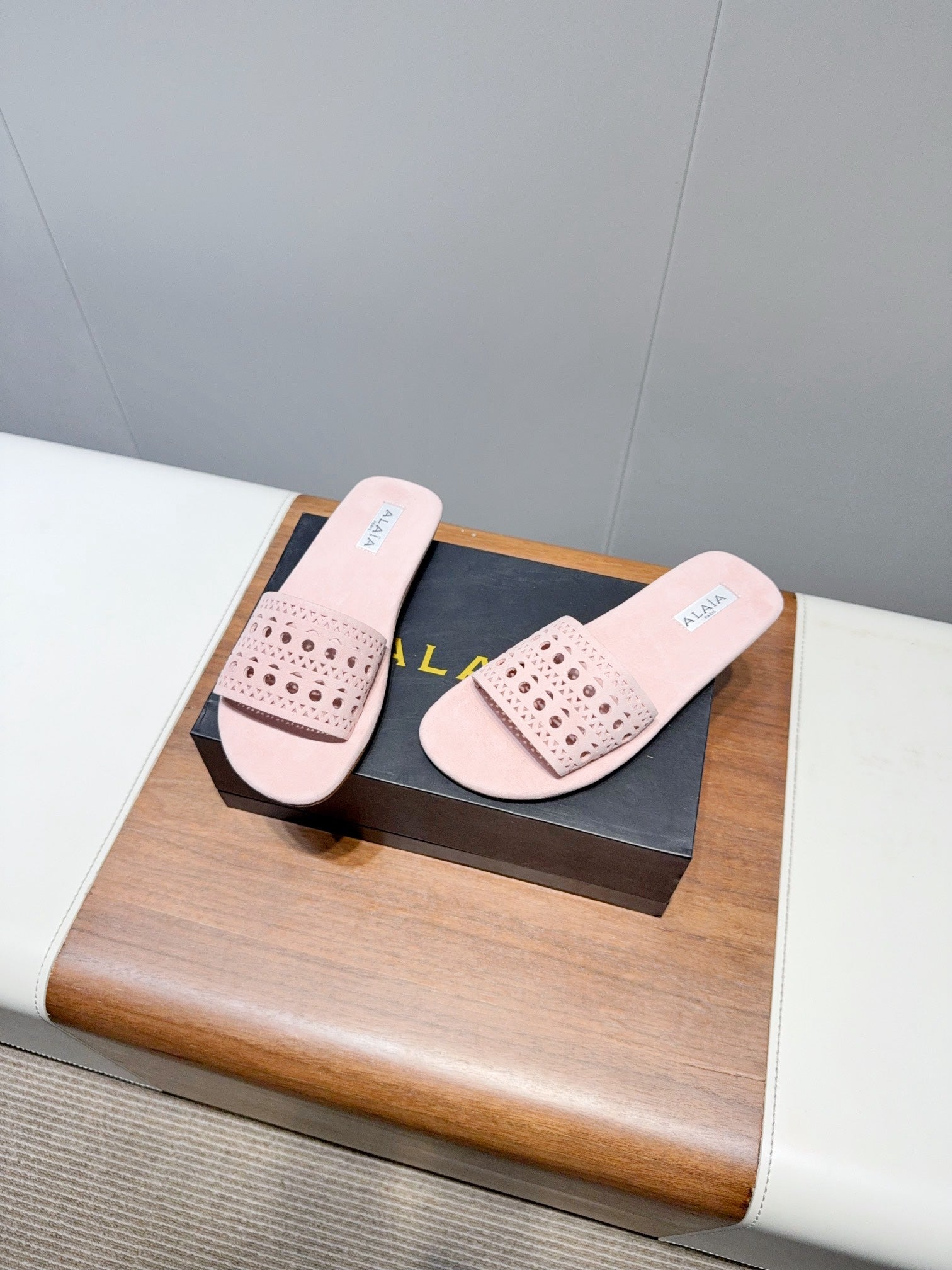 ALAIA FLAT SANDALS WITH PERFORATED STRAPS 25S IN LIGHT PINK SUEDE