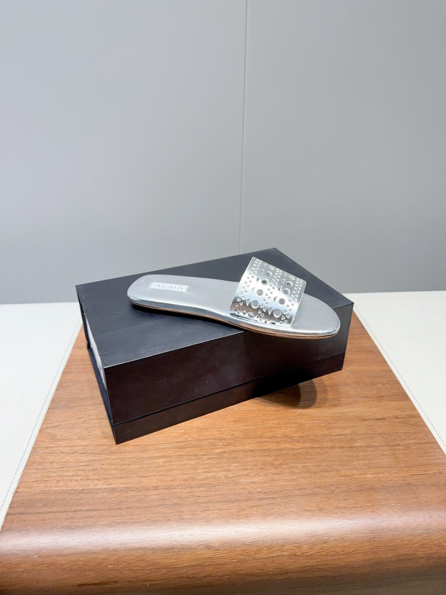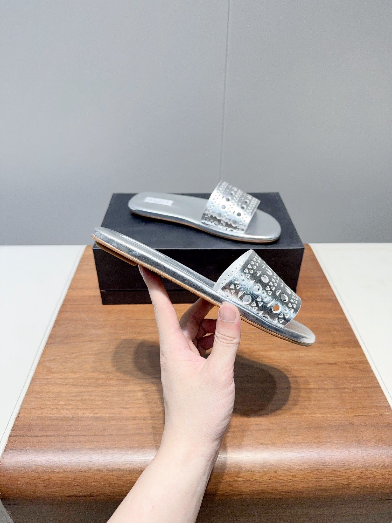 ALAIA FLAT SANDALS WITH PERFORATED STRAPS 25S IN SILVER LAMBSKIN