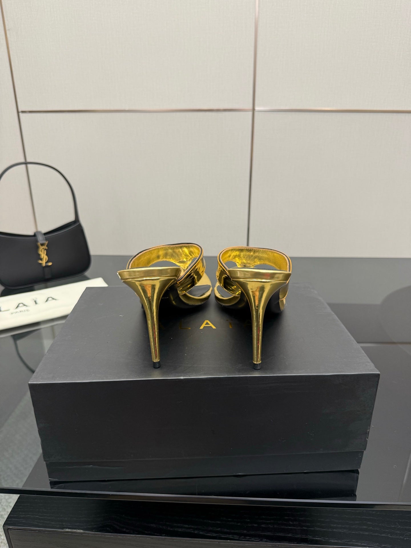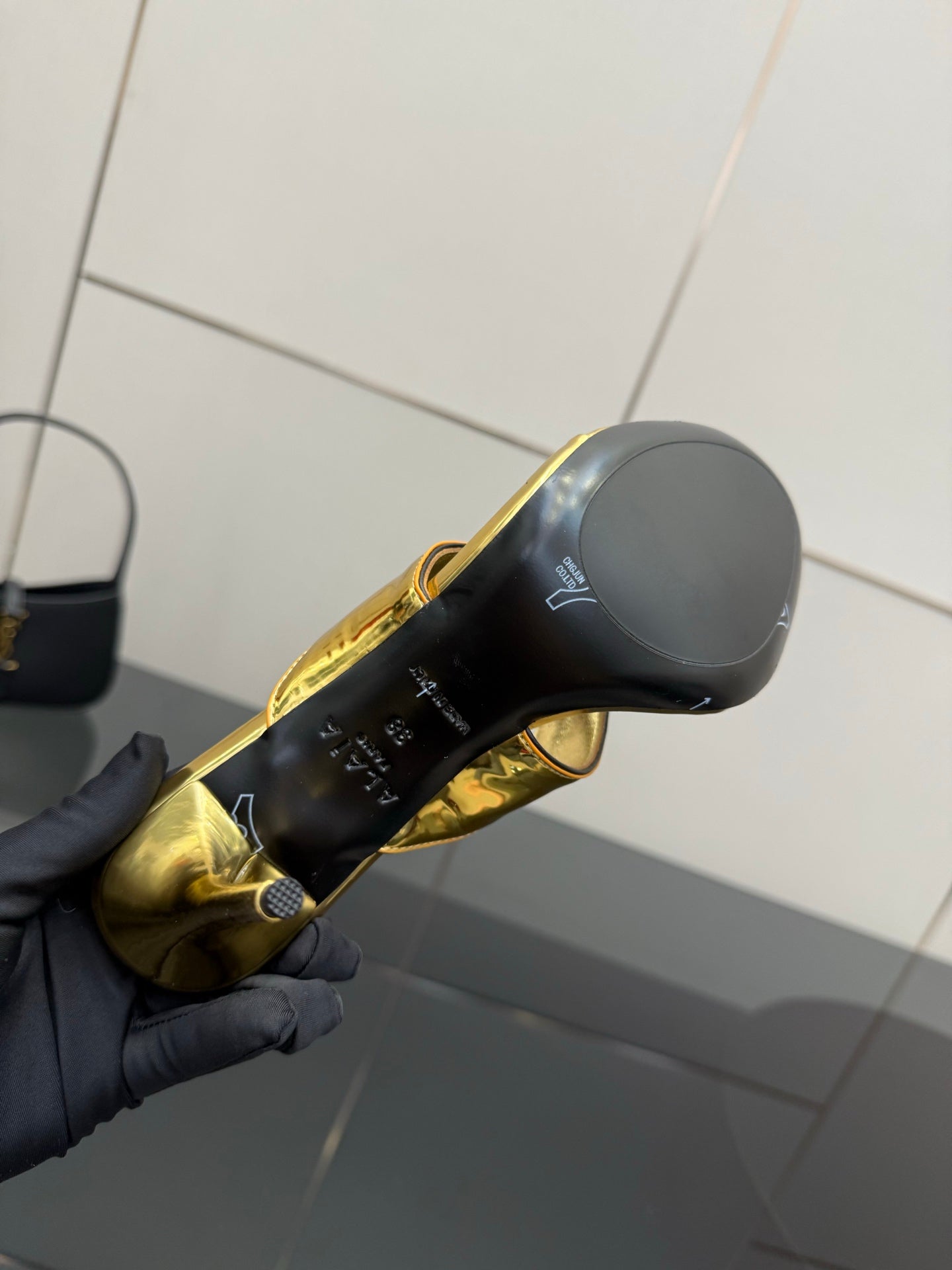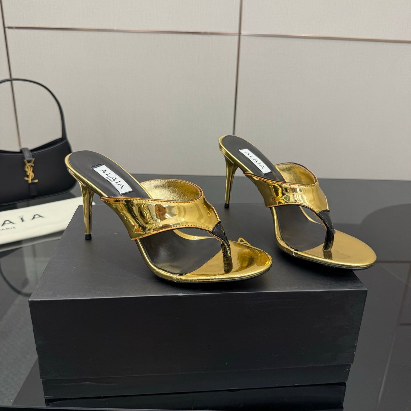 ALAIA HEELED THONG 25S IN GOLD PATENT LEATHER
