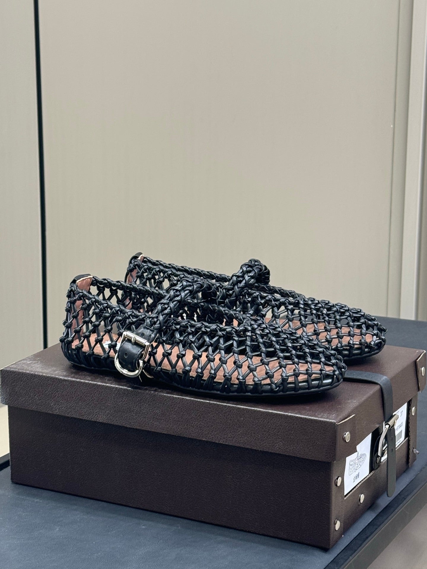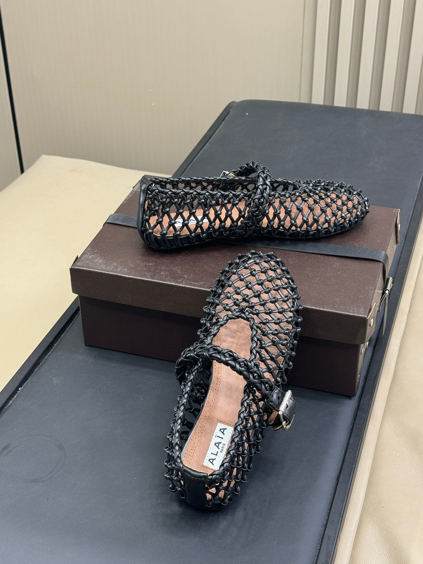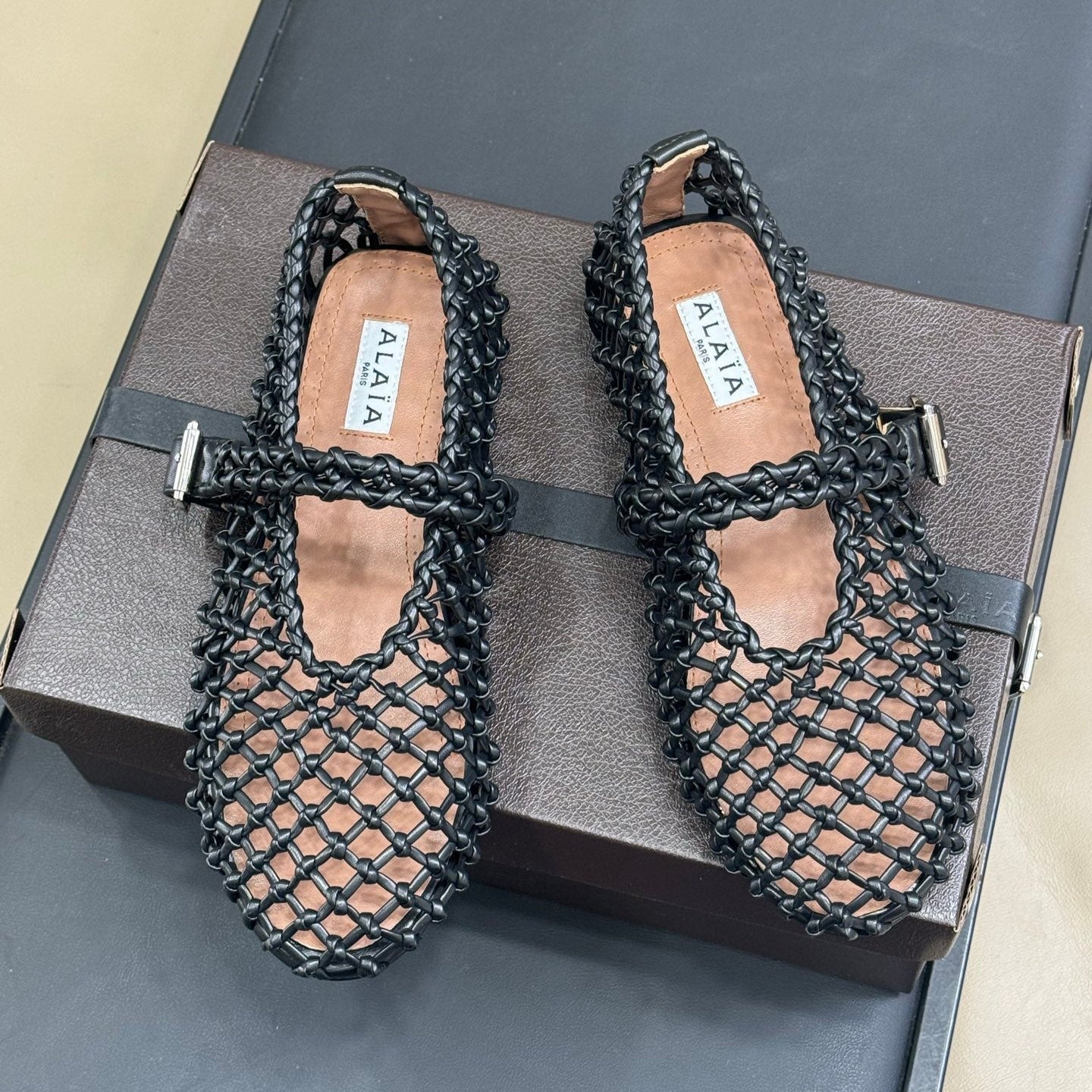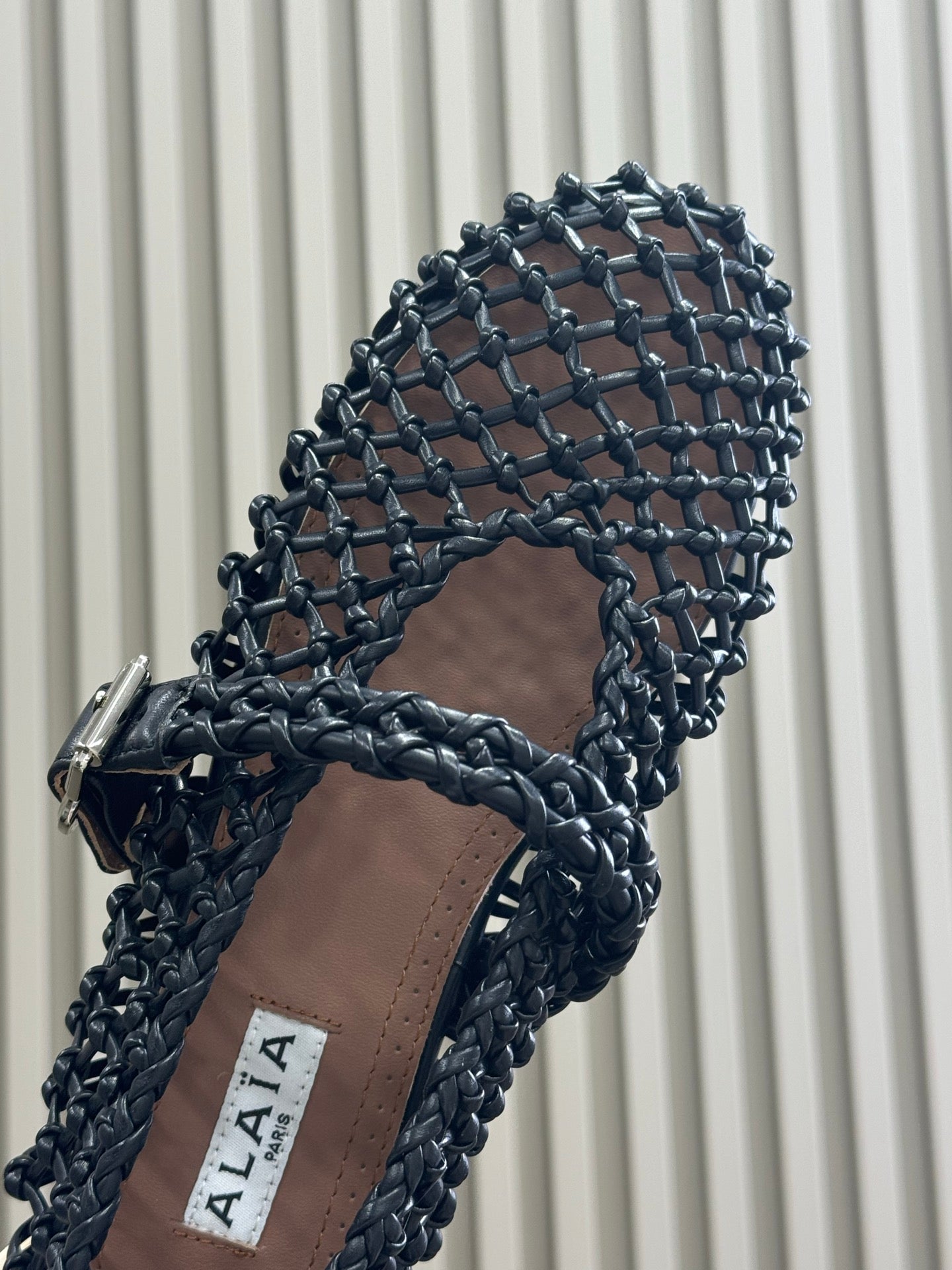 ALAIA MARY JANE FLATS 25S IN BLACK MESH CALSKIN WITH SILVER HARDWARE
