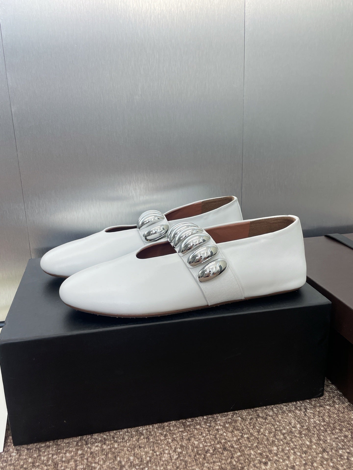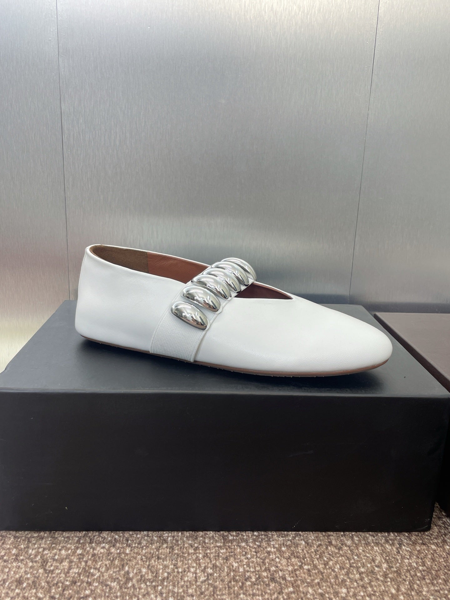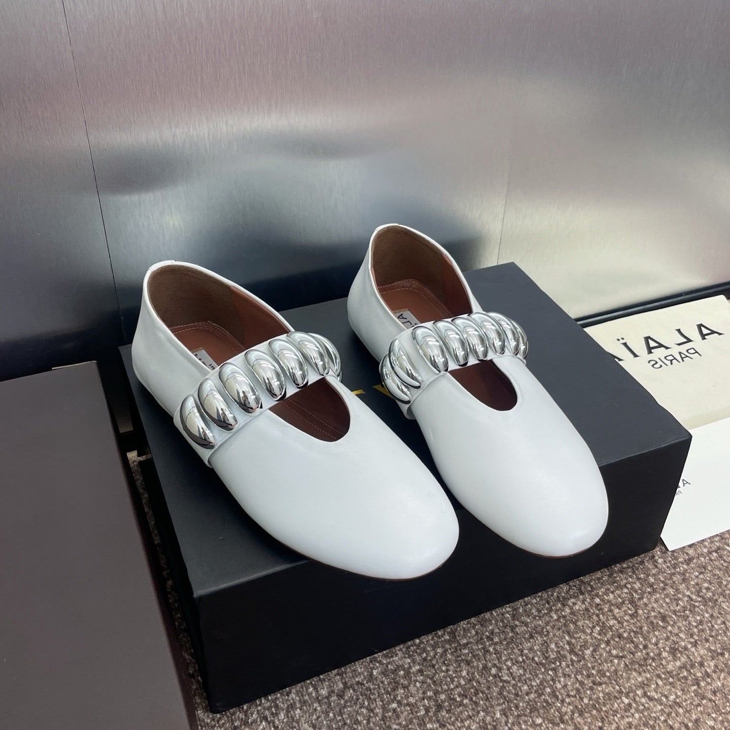 ALAIA MARY JANE FLATS 25S IN WHITE CALFSKIN WITH SILVER HARDWARE