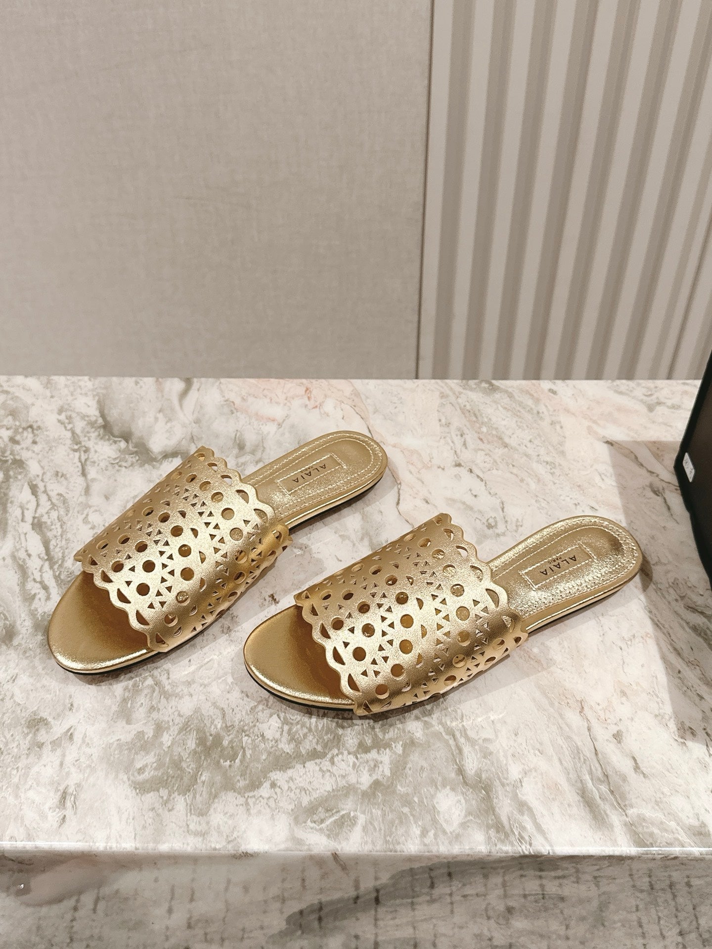 ALAIA PERFORATED SLIDE SANDALS 25S IN LIGHT GOLD LAMBSKIN