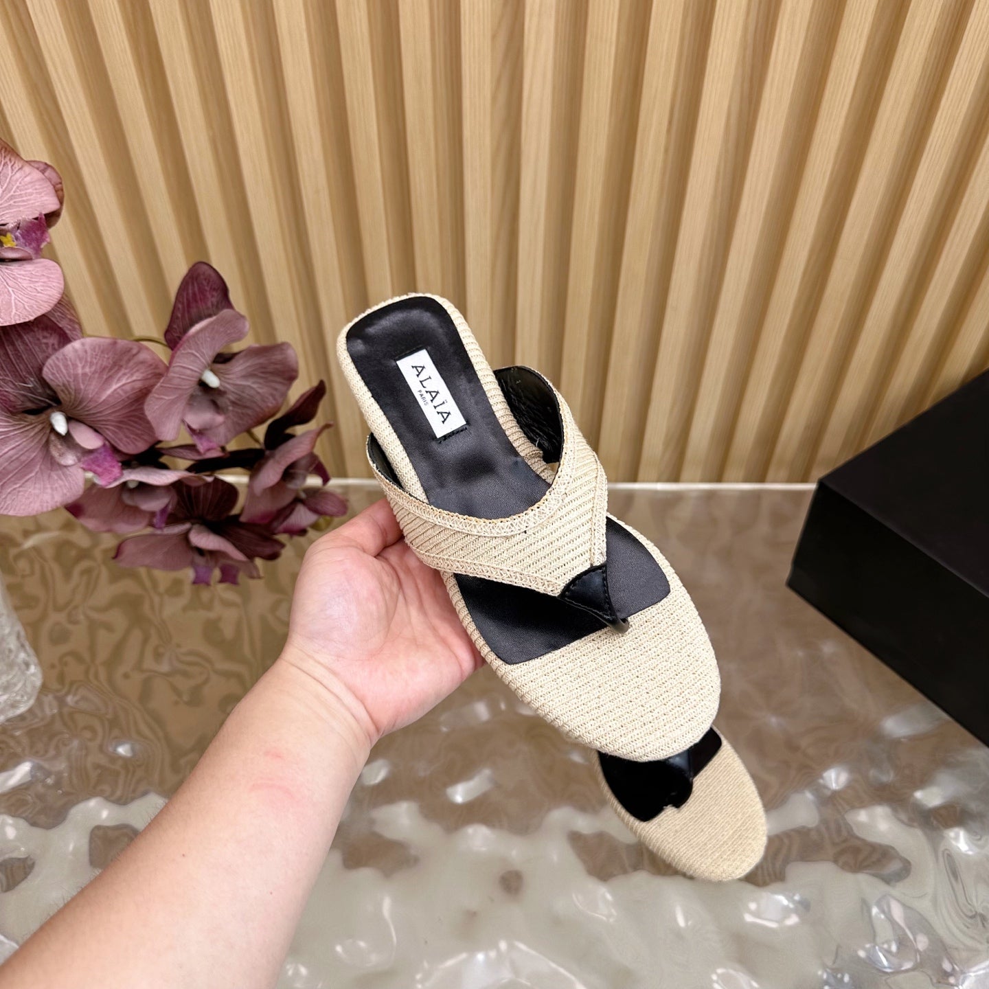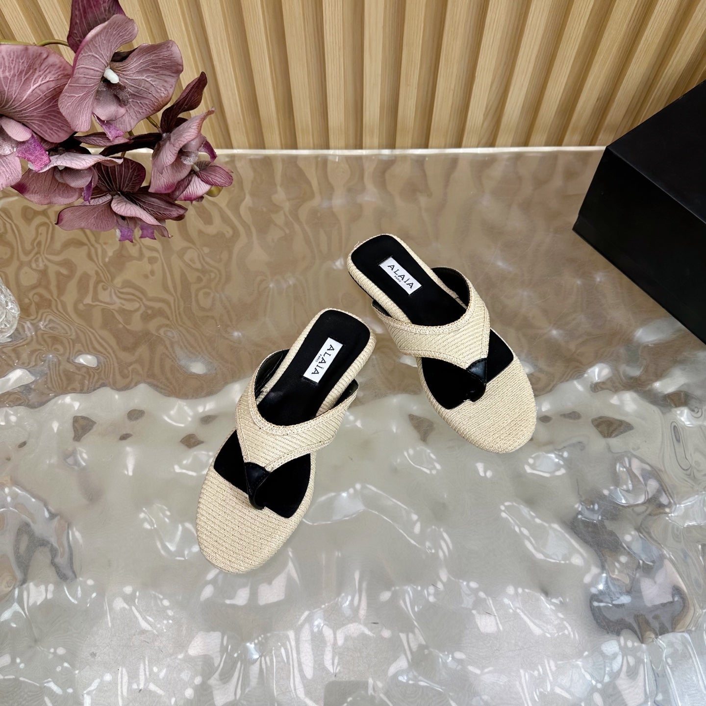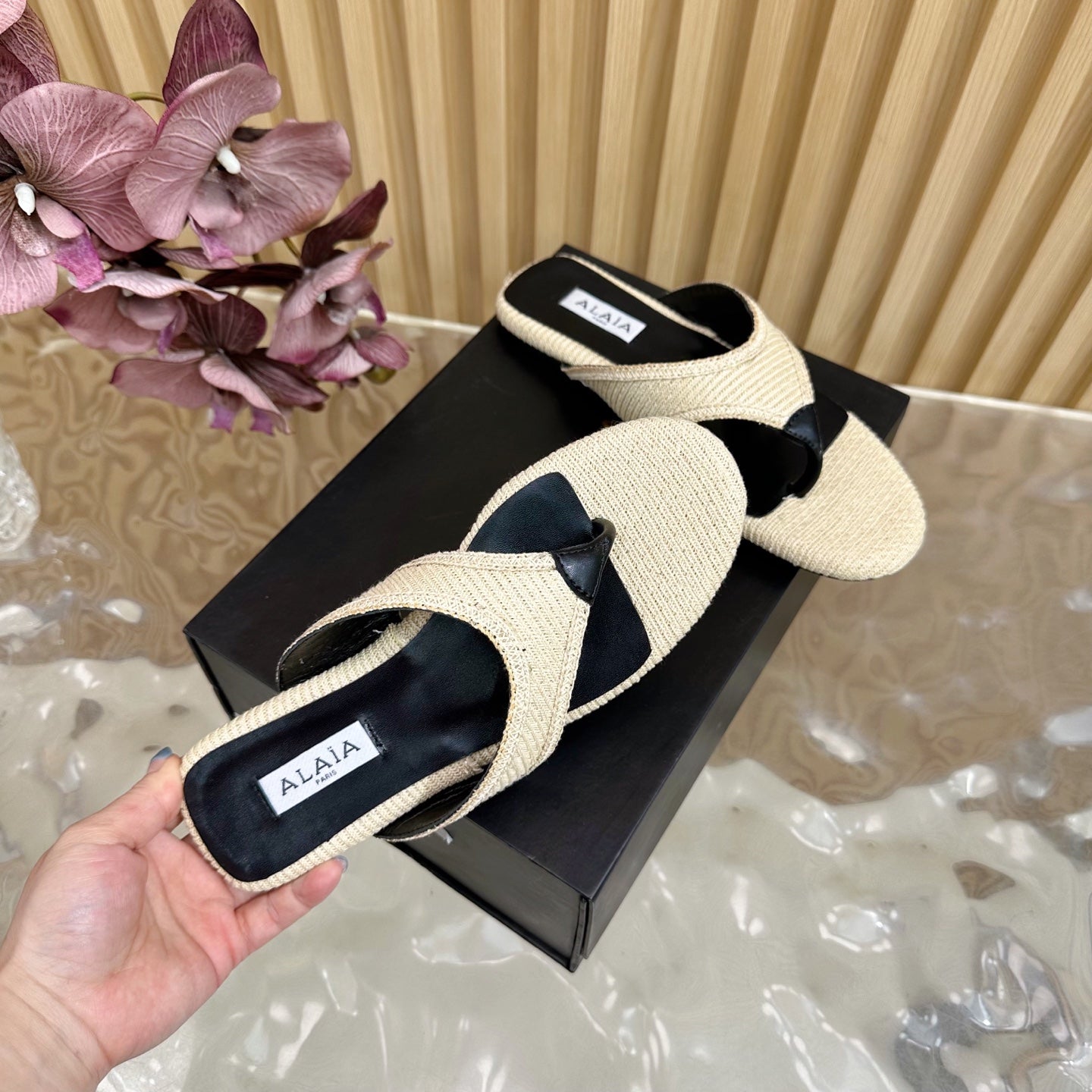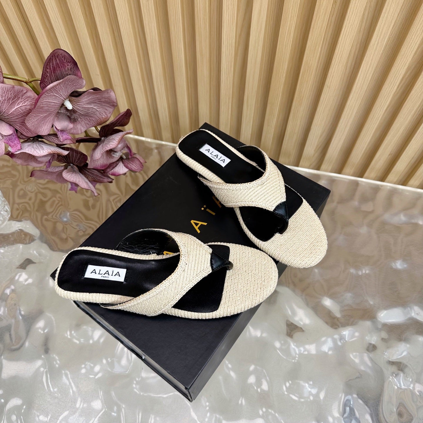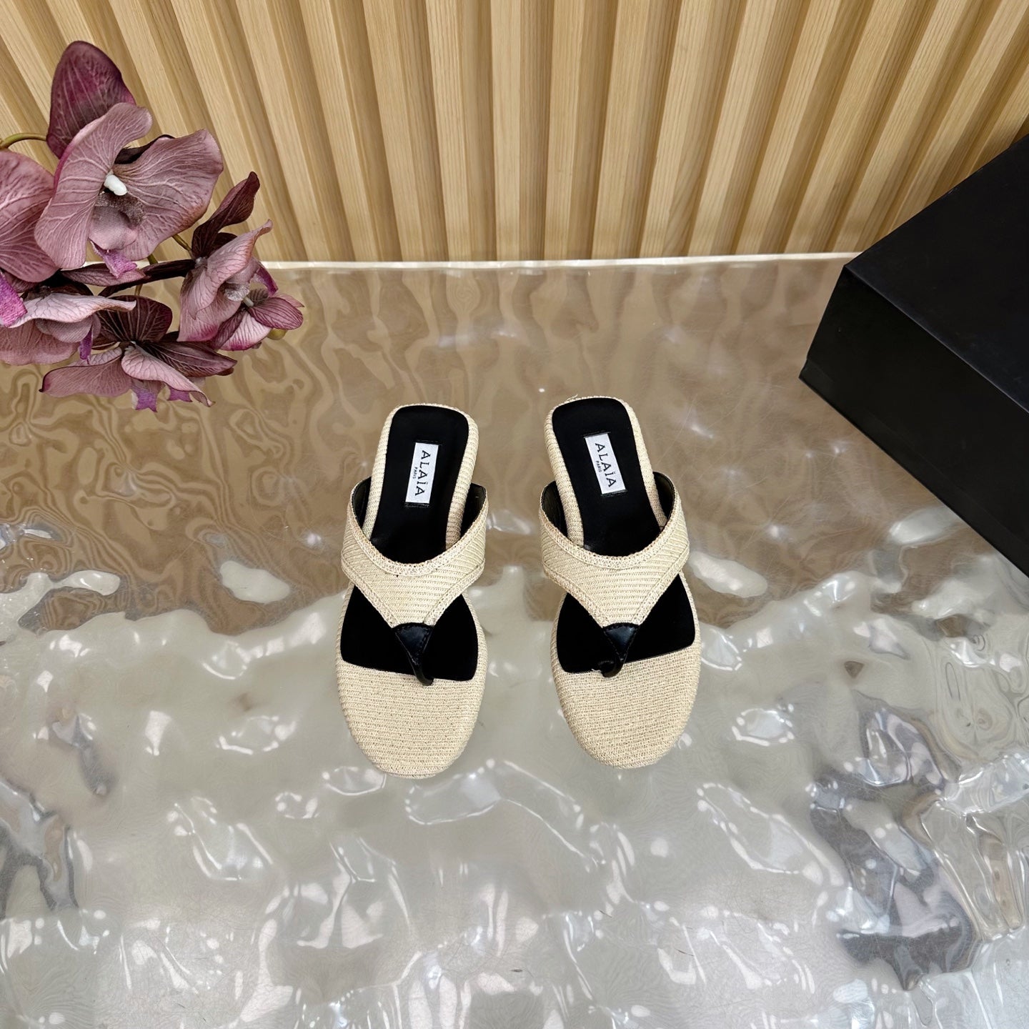 ALAIA PLATFORM THONG SANDALS 25S IN LIGHT BEIGE RAFFIA AND CALFSKIN