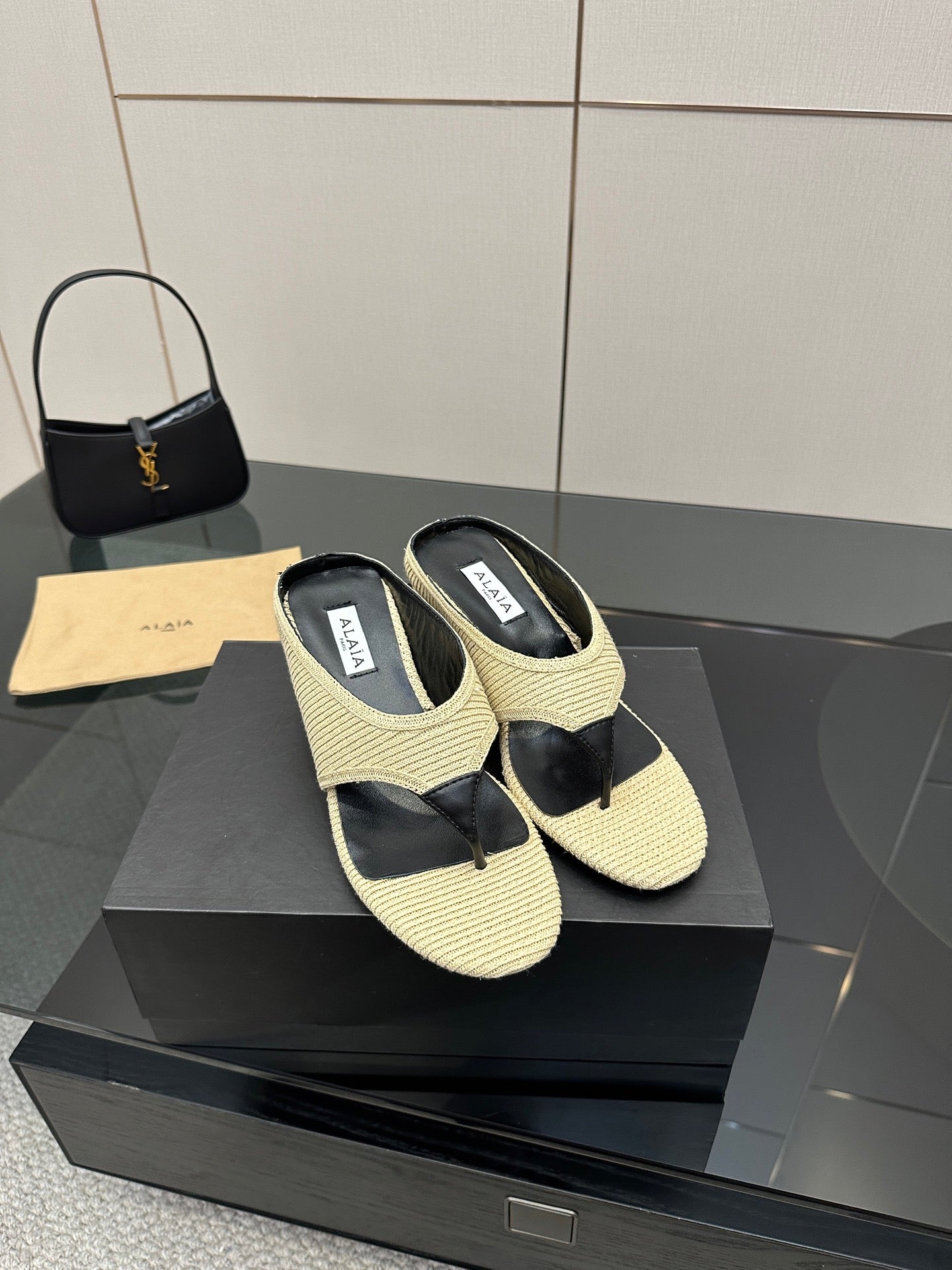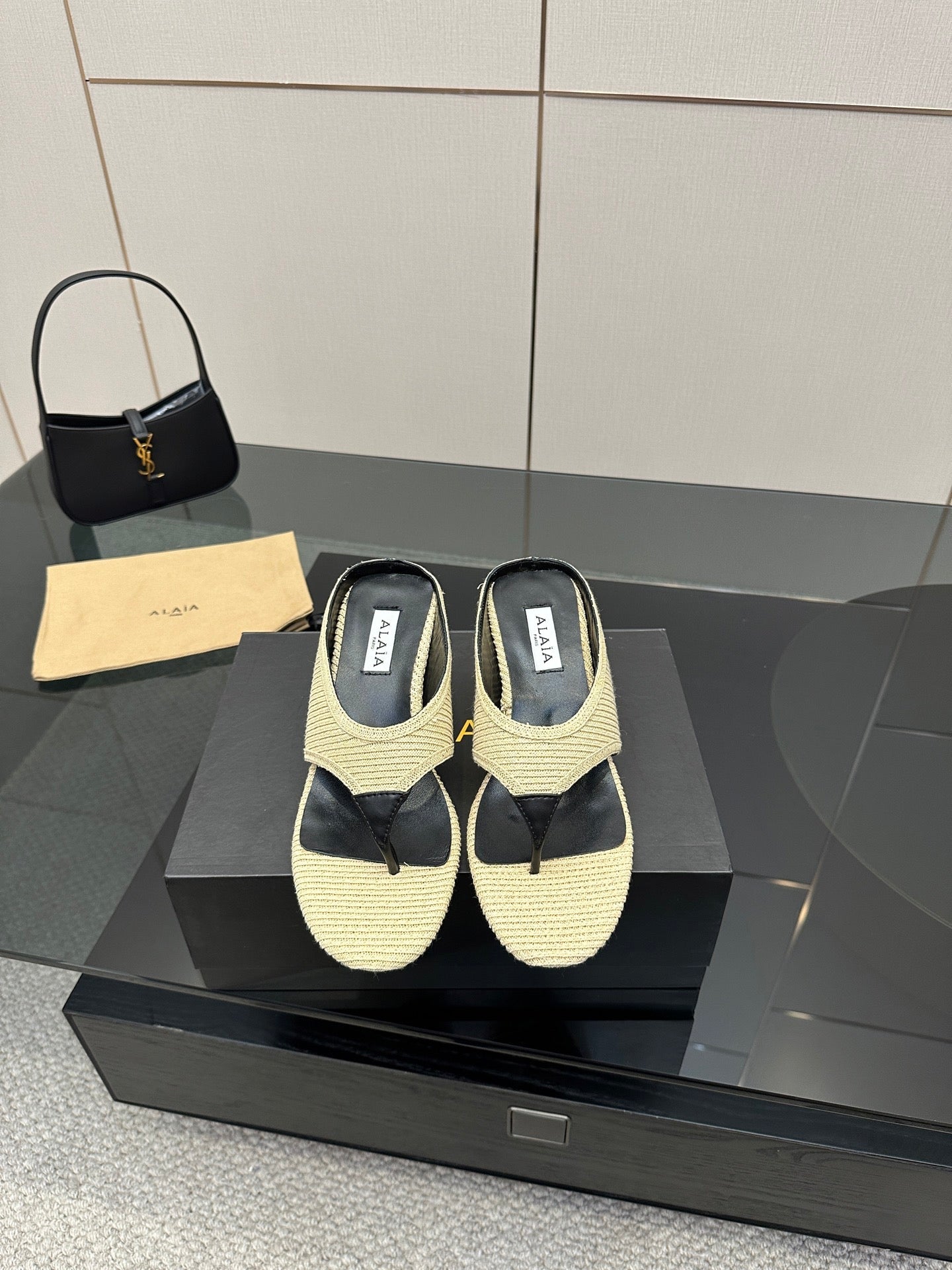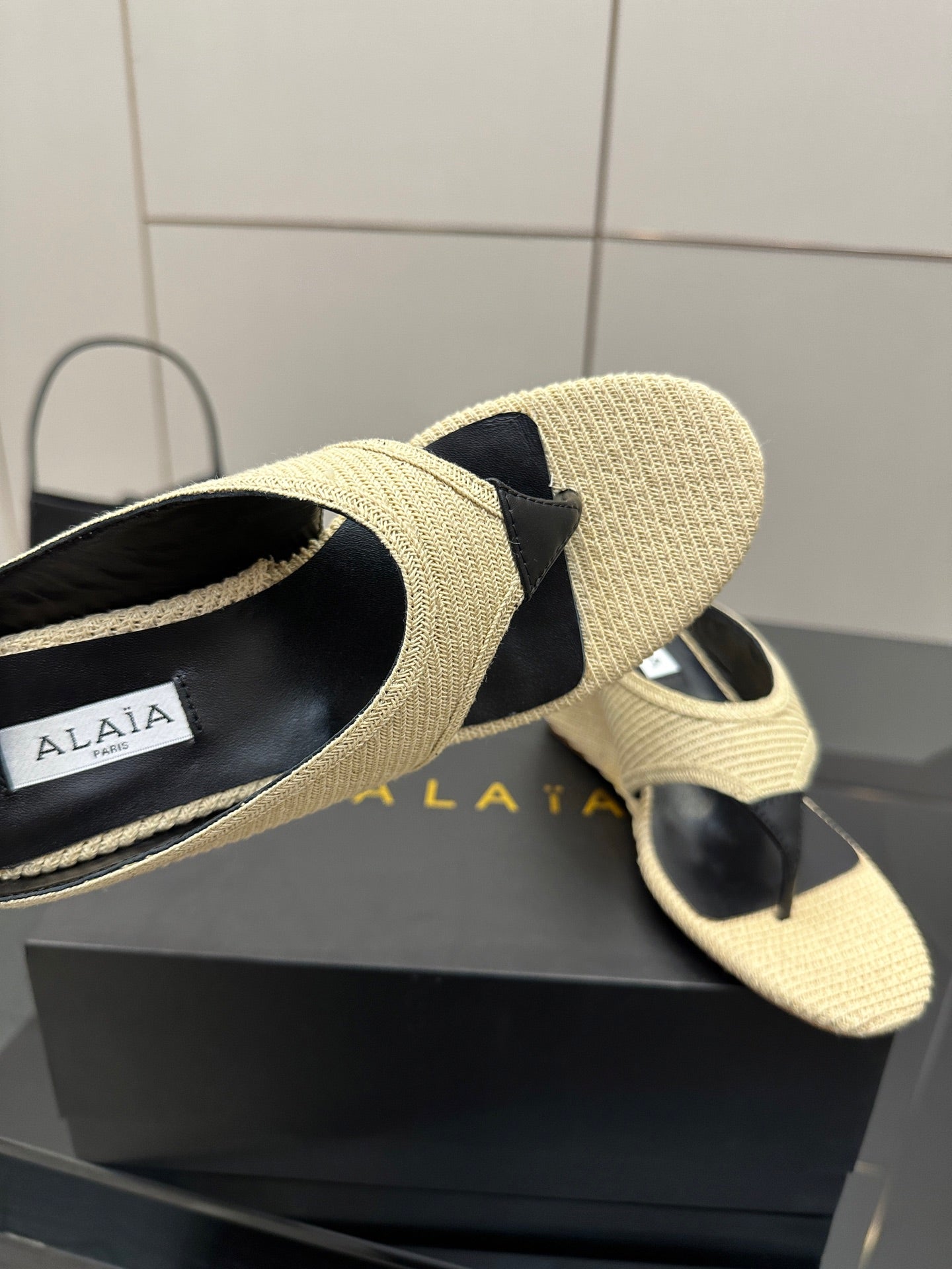 ALAIA WEDGE THONG SANDALS 25S IN LIGHT BEIGE RAFFIA