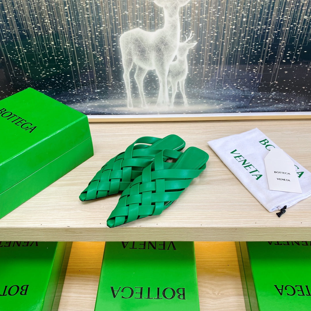 ALFIE LEATHER FLAT MULES IN EMERALD GREEN PATENT CALFSKIN WITH WOVEN DESIGN