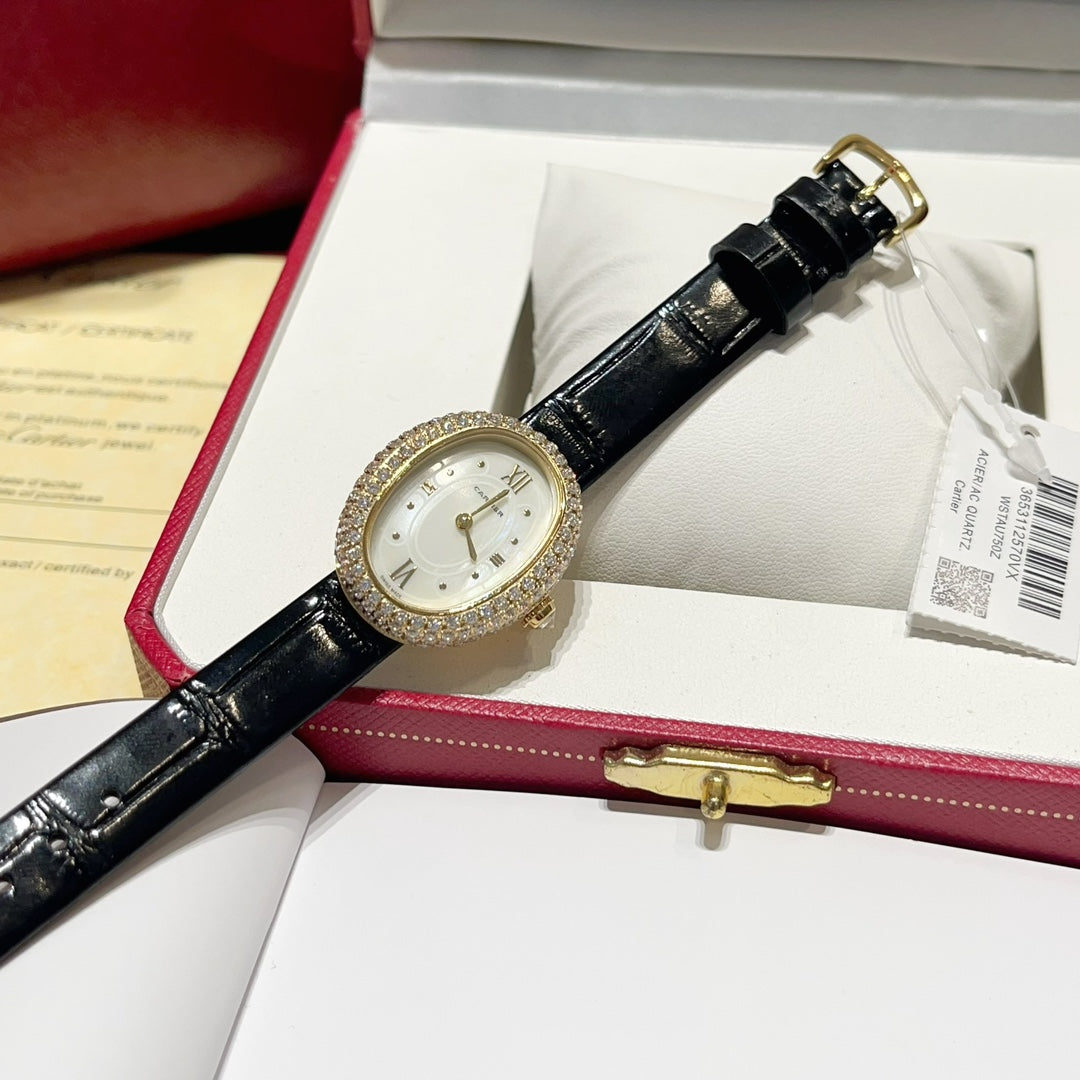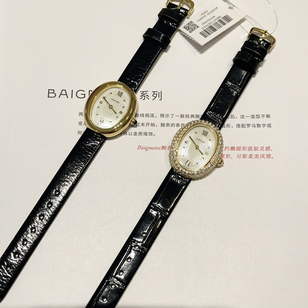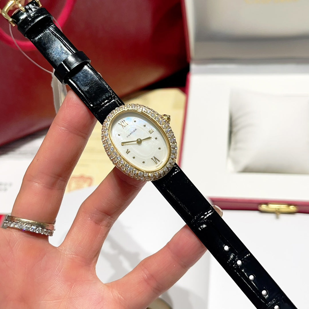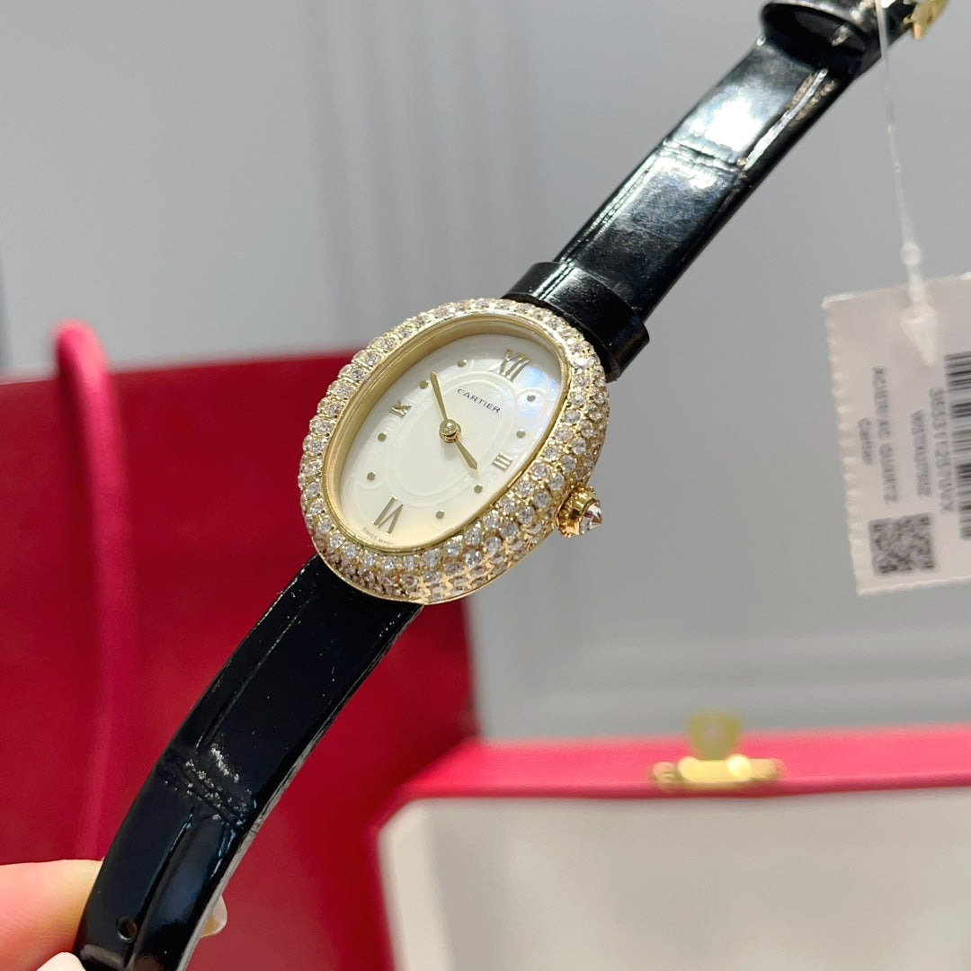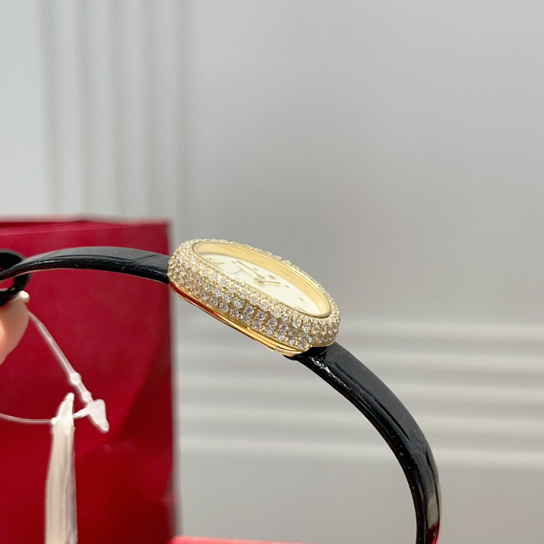 BAIGNOIRE WATCH GOLD CASE AND BLACK LEATHER STRAP WITH CRYSTAL