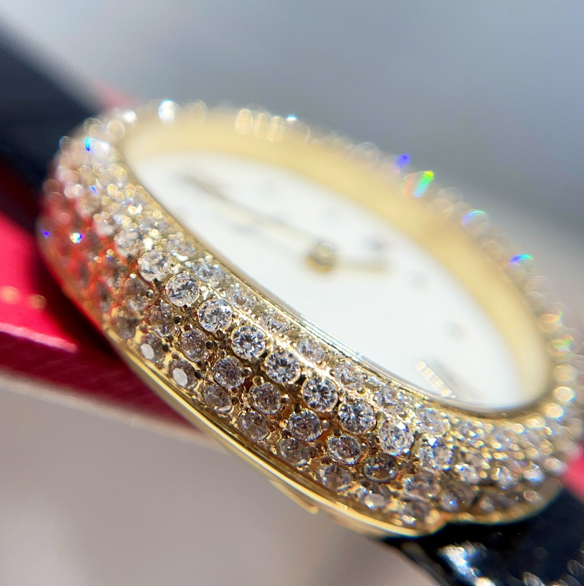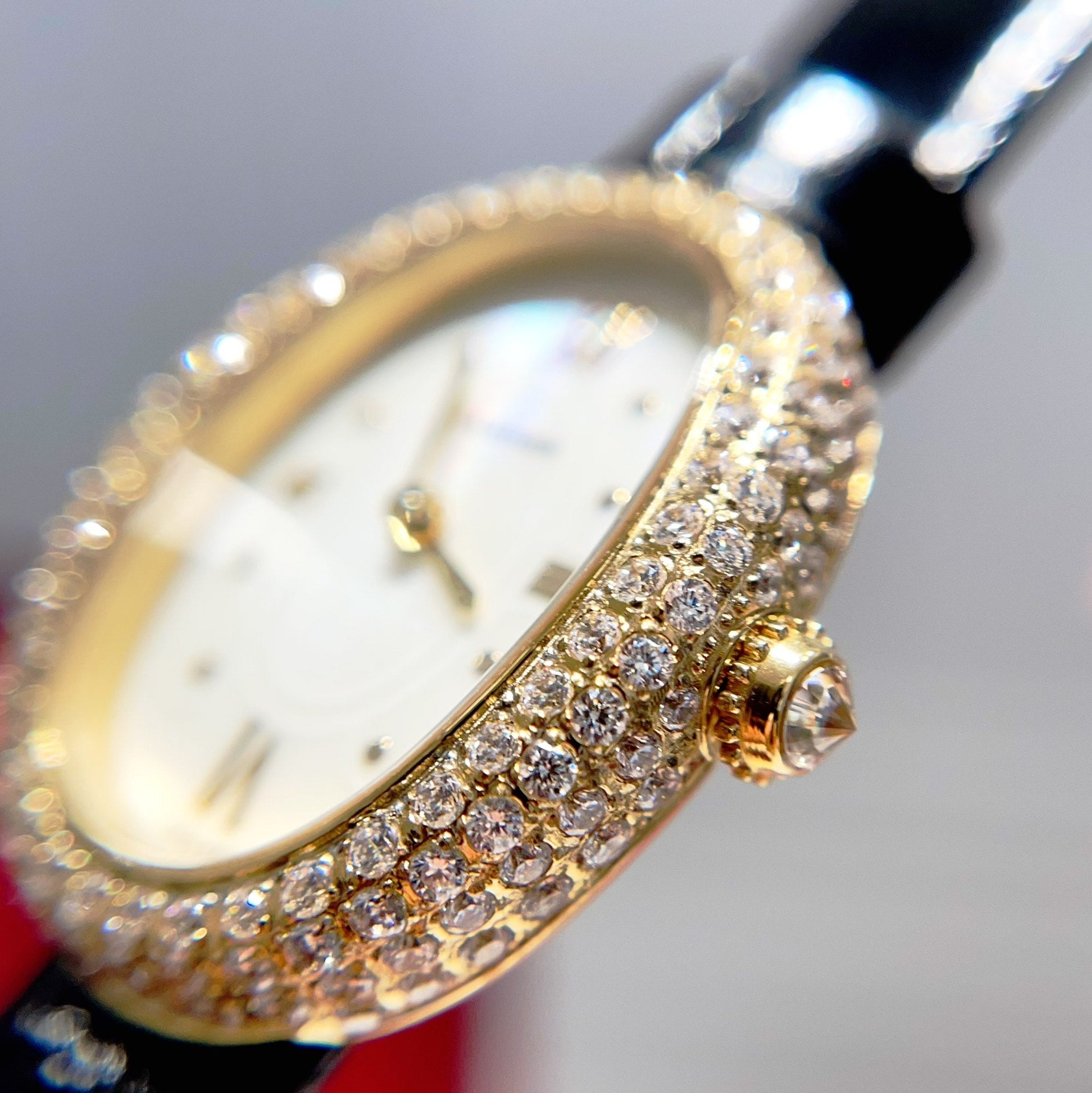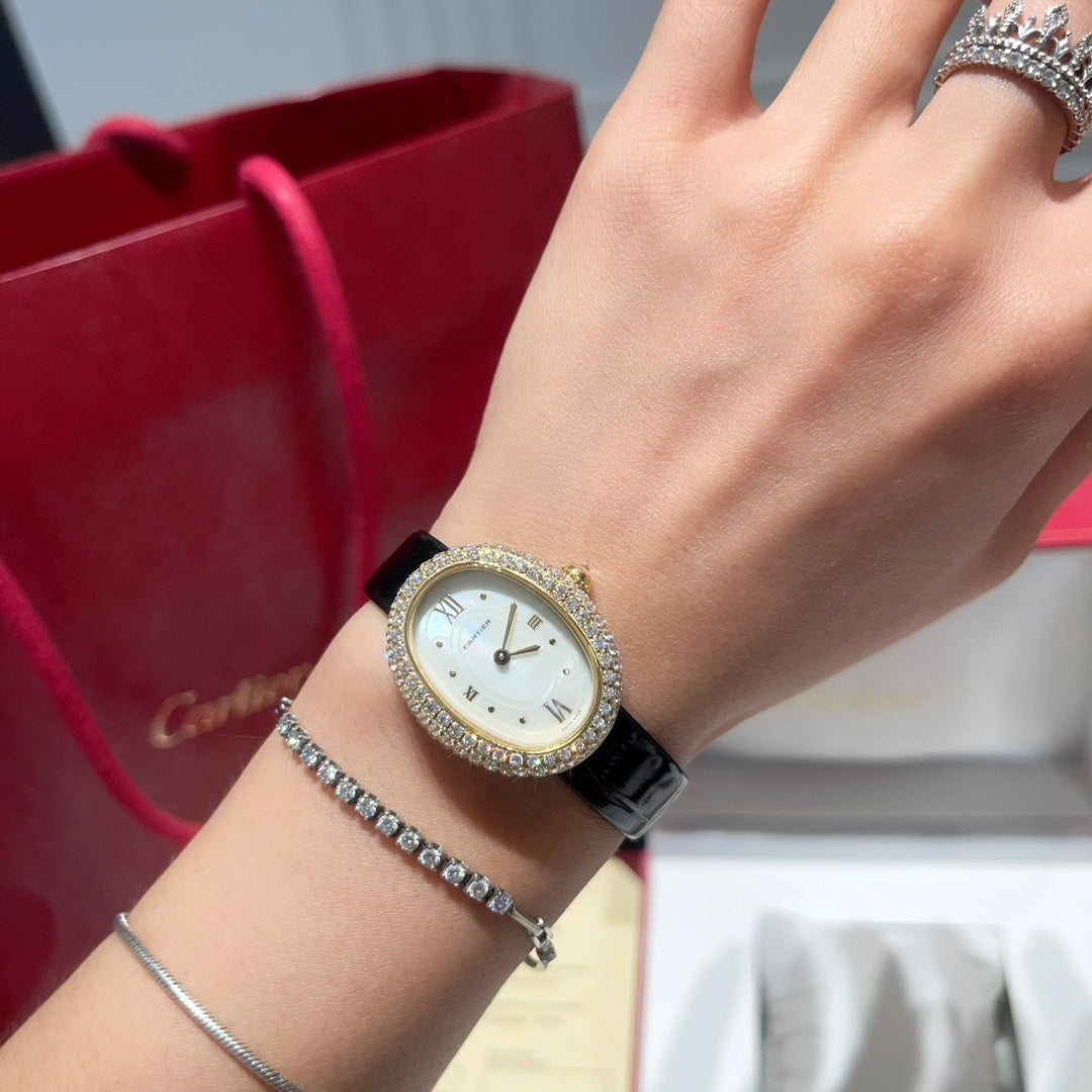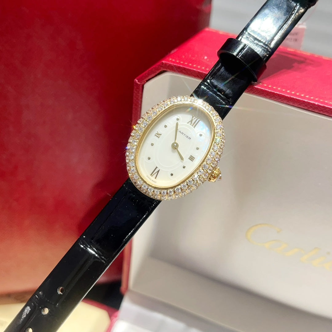BAIGNOIRE WATCH GOLD CASE AND BLACK LEATHER STRAP WITH CRYSTAL
