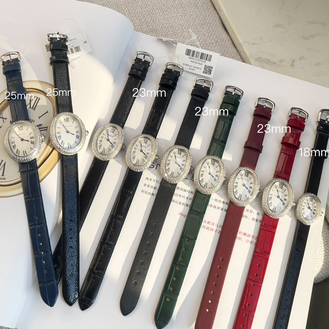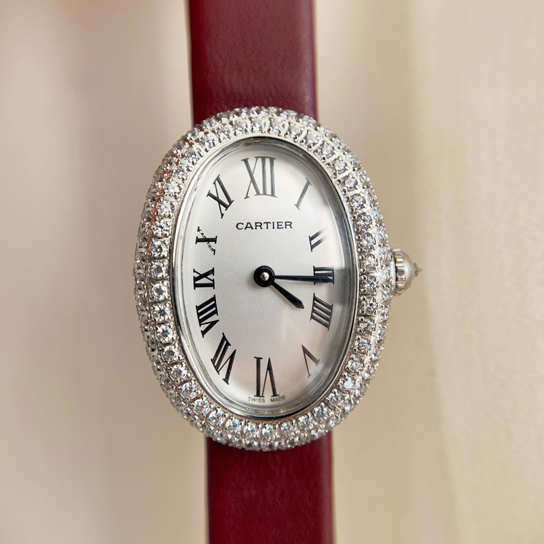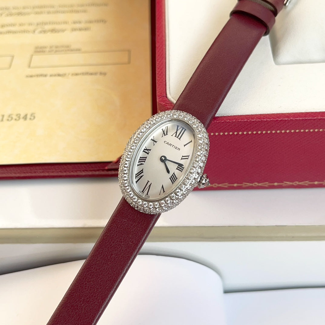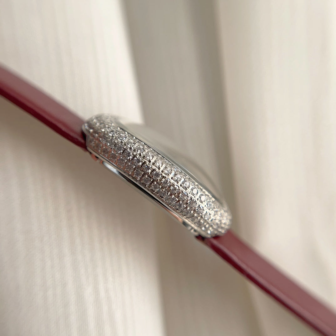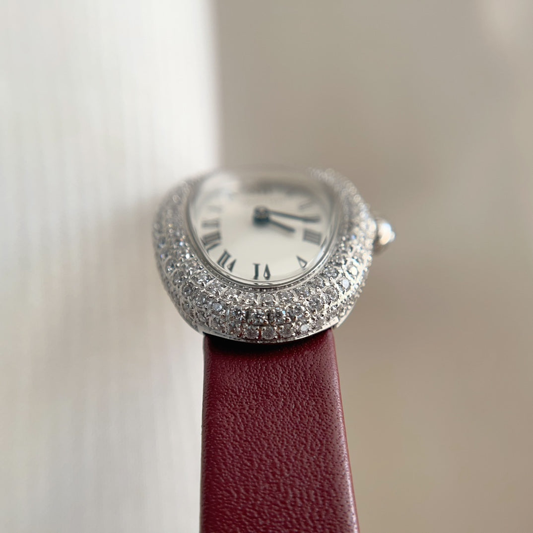 BAIGNOIRE WATCH SILVER CASE WITH CRYSTALS AND JAM RED LEATHER