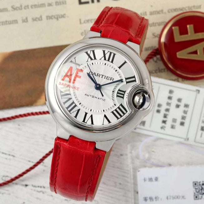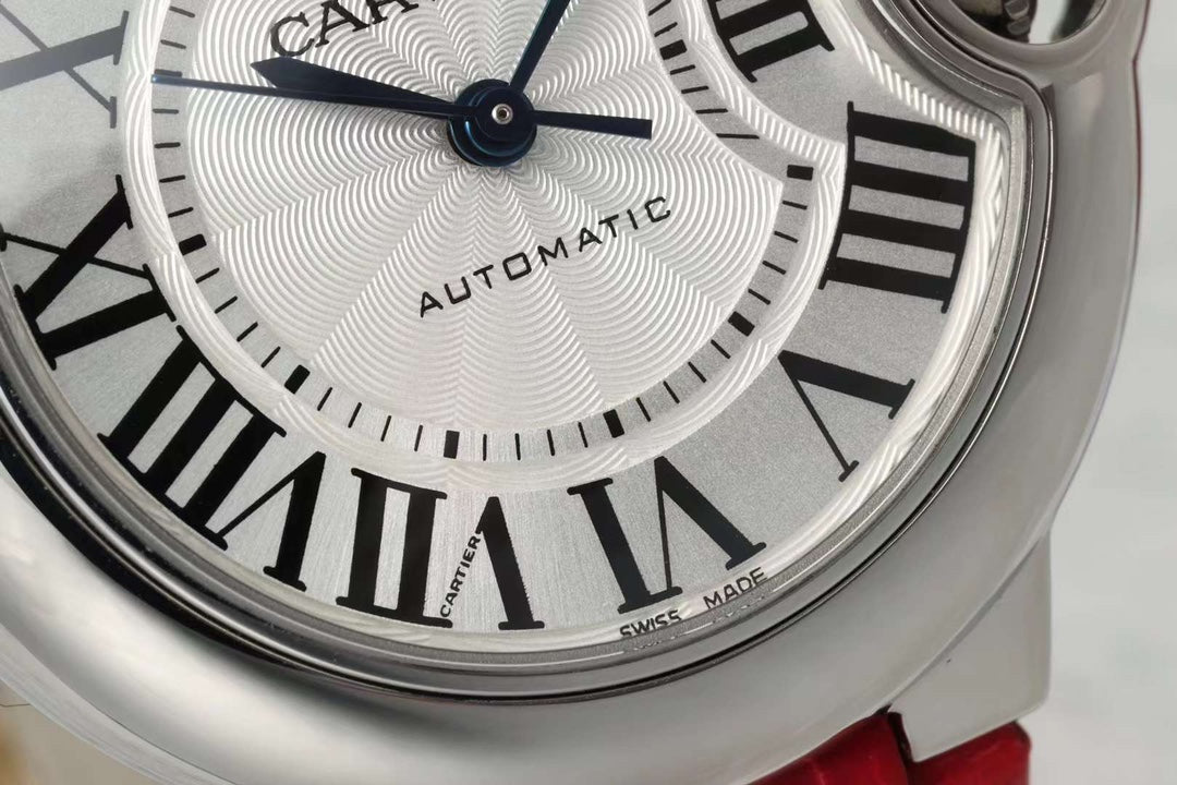 BALLON BLEU DE CARTIER 33 MM WATCH SILVER CASE WITH CRIMSON RED LEATHER STRAP