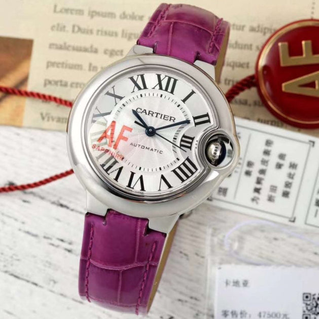 BALLON BLEU DE CARTIER 33 MM WATCH SILVER CASE WITH MAGENTA PURPLE LEATHER STRAP
