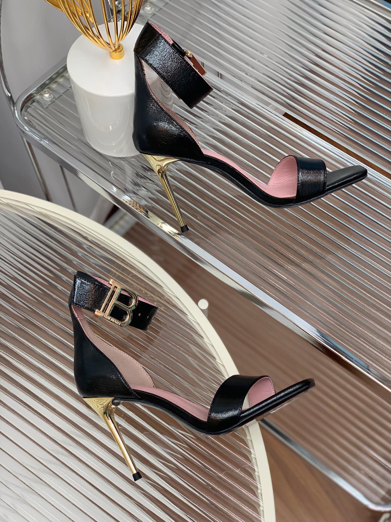 BALMAIN 25S B STRAP HIGH HEEL SANDALS 95MM IN BLACK GLOSSY CALFSKIN