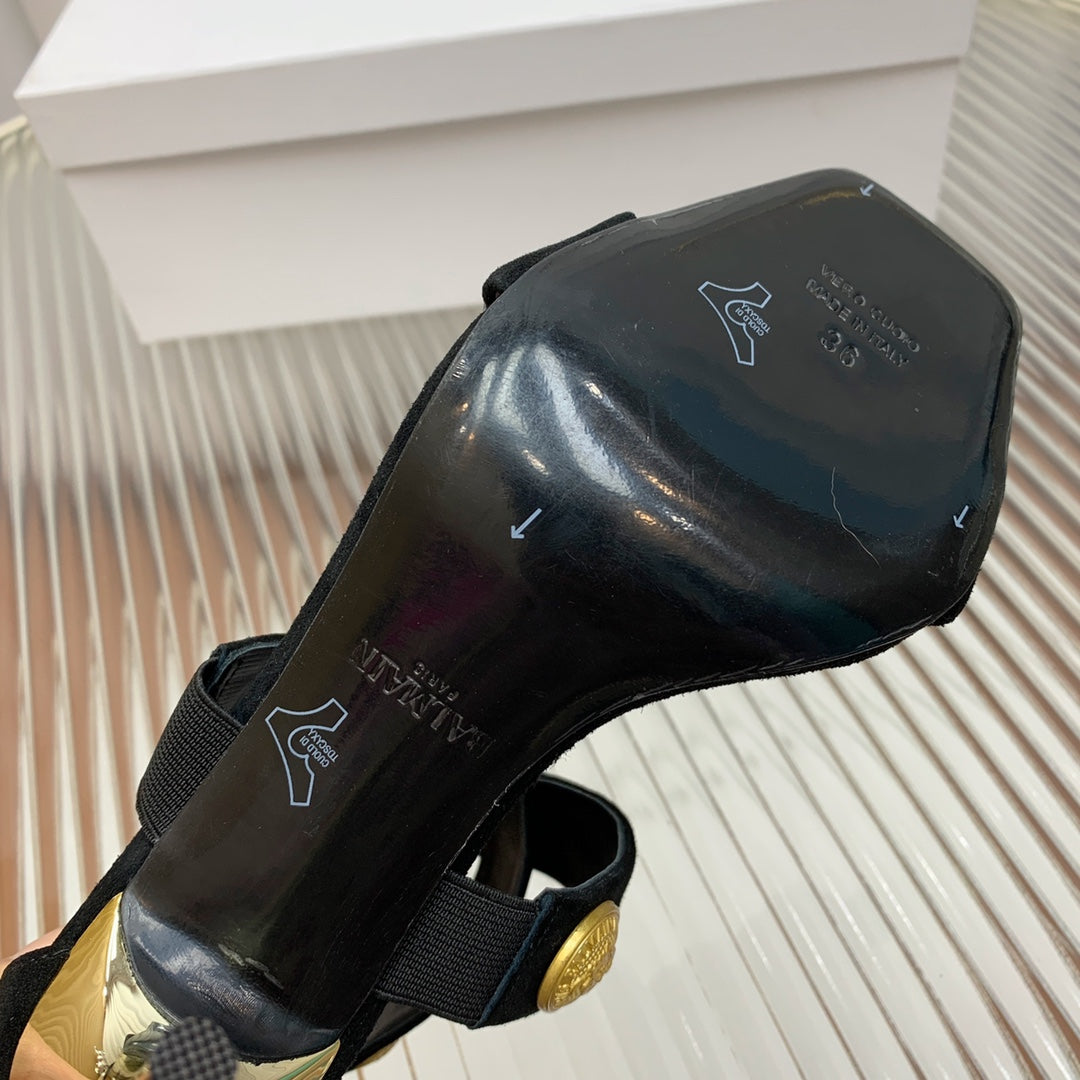 BALMAIN 25S CROSSOVER STRAP HIGH HEELS 95MM IN BLACK SUEDE