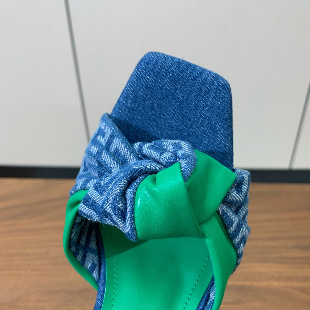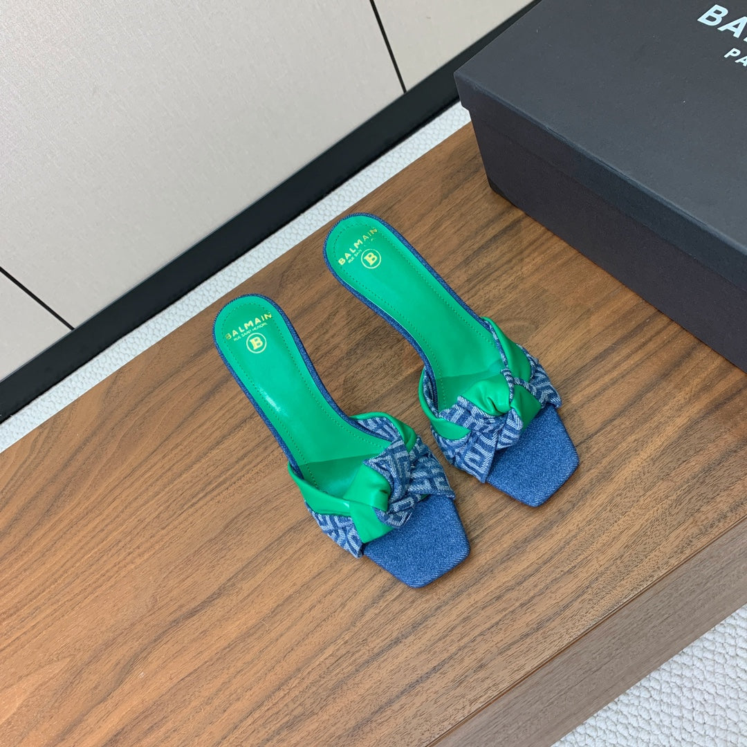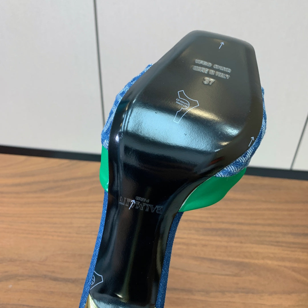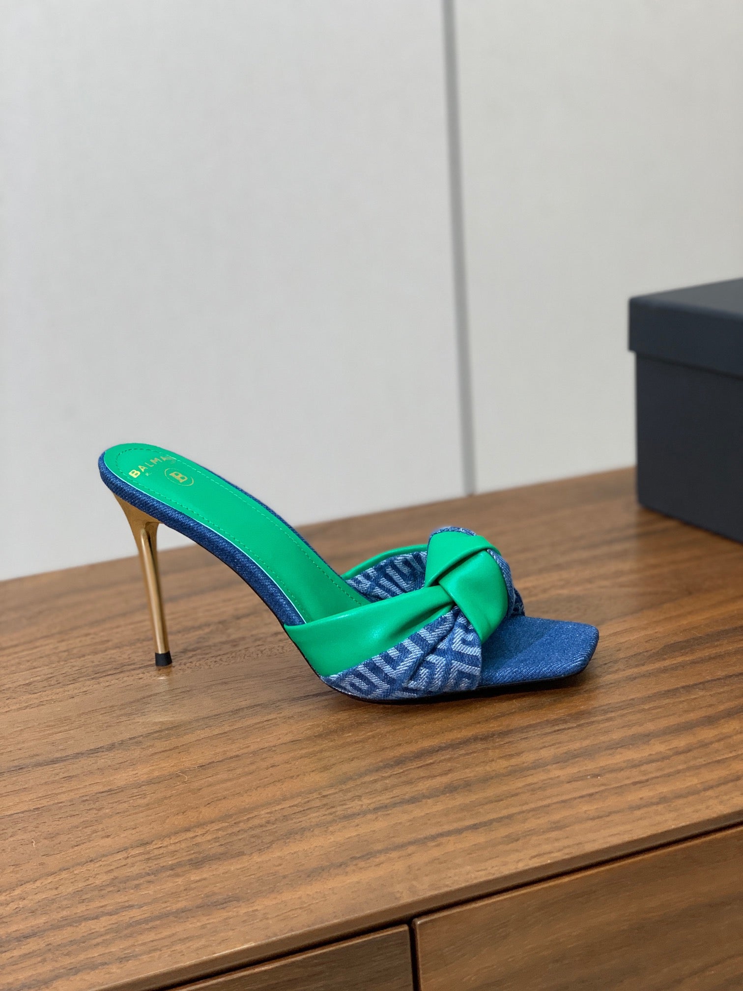 BALMAIN 25S HIGH HEEL MULES 95MM IN EMERALD GREEN DENIM AND CALFSKIN