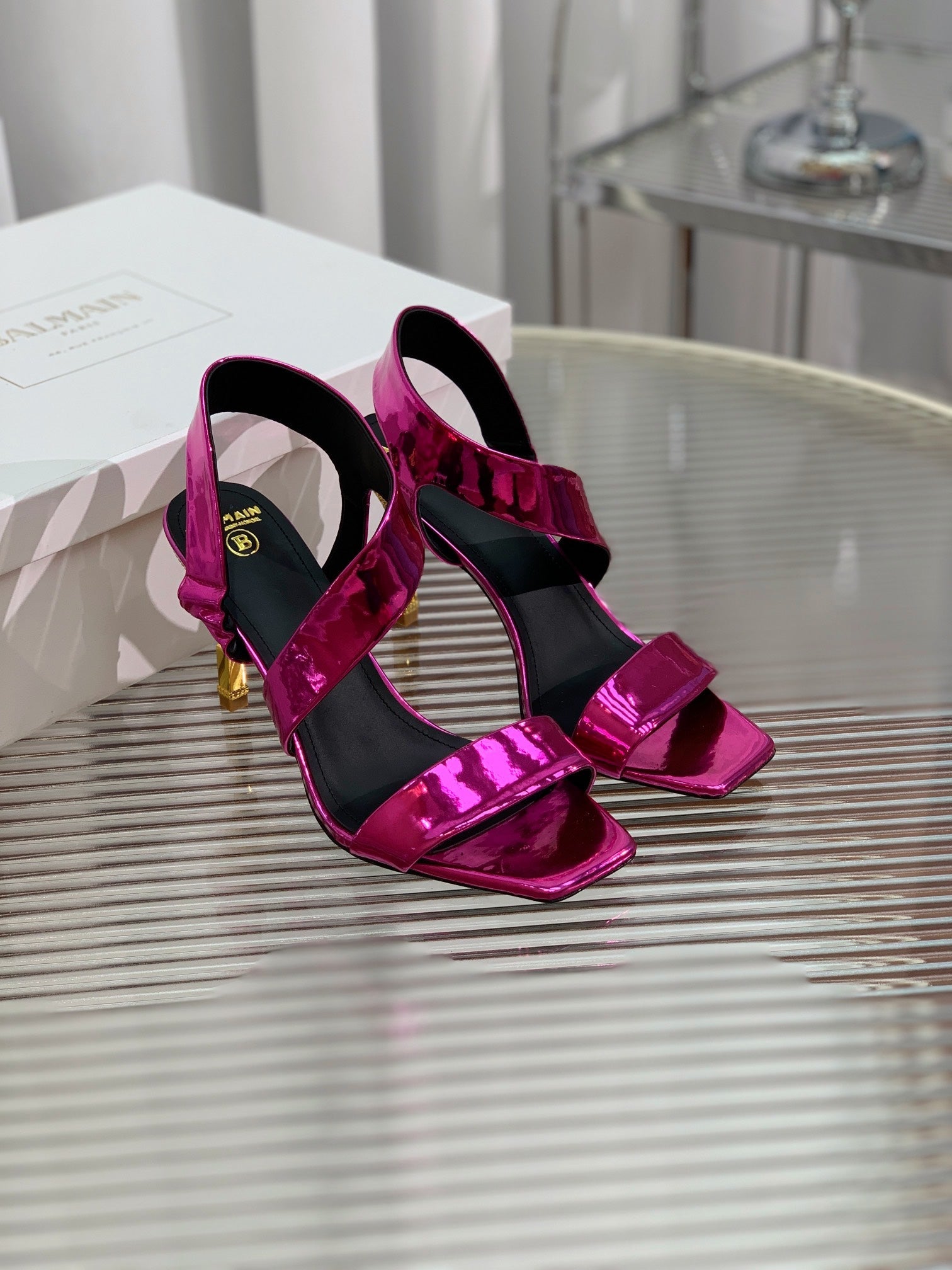 BALMAIN 25S HIGH HEEL SANDALS 95MM IN MAGENTA GLOSSY CALFSKIN