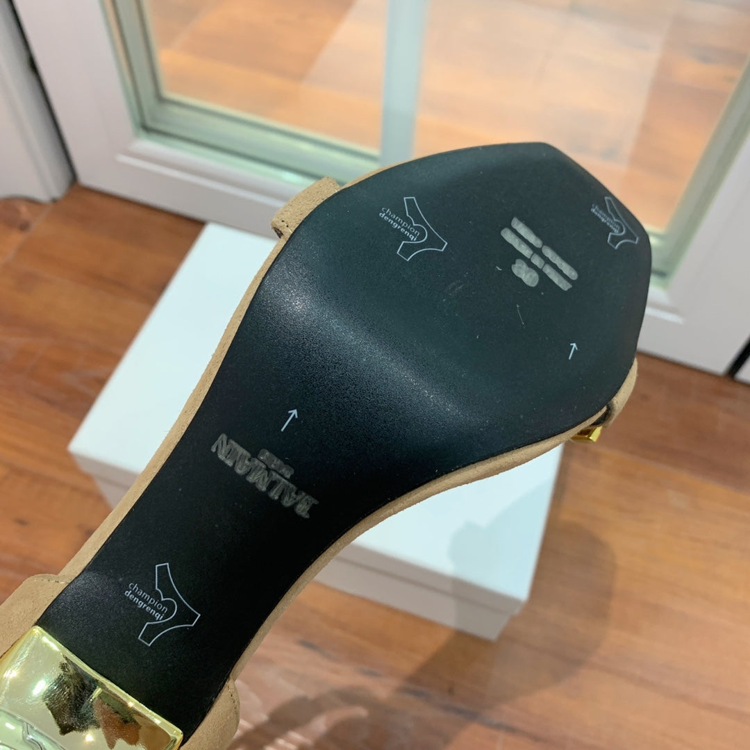 BALMAIN 25S METAL STRAP HIGH HEELS 95MM IN LIGHT BROWN SUEDE GOLD HARDWARE