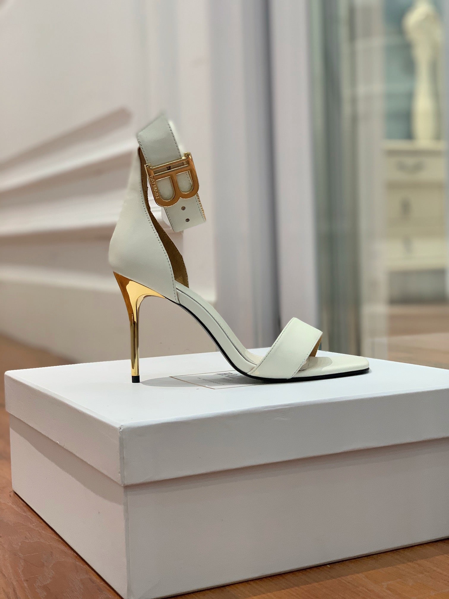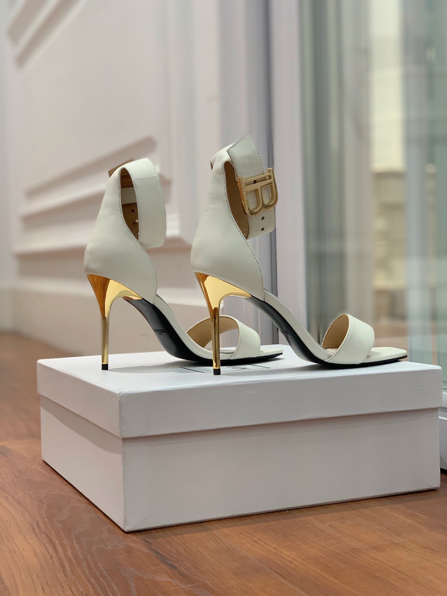 BALMAIN 25S THIN STRAP HIGH HEELS 105MM IN IVORY CALFSKIN GOLD HARDWARE