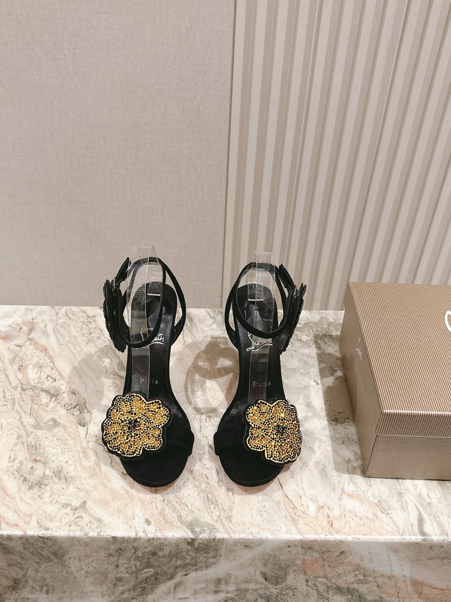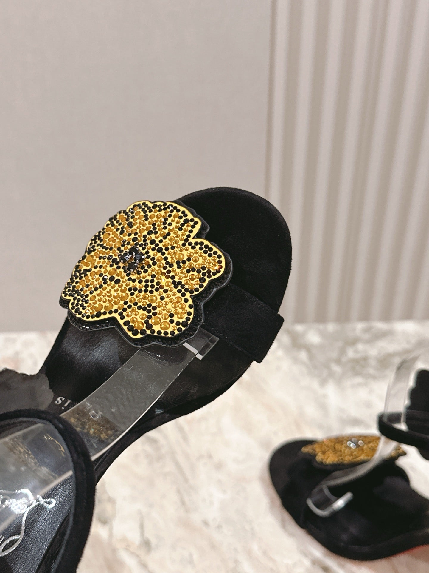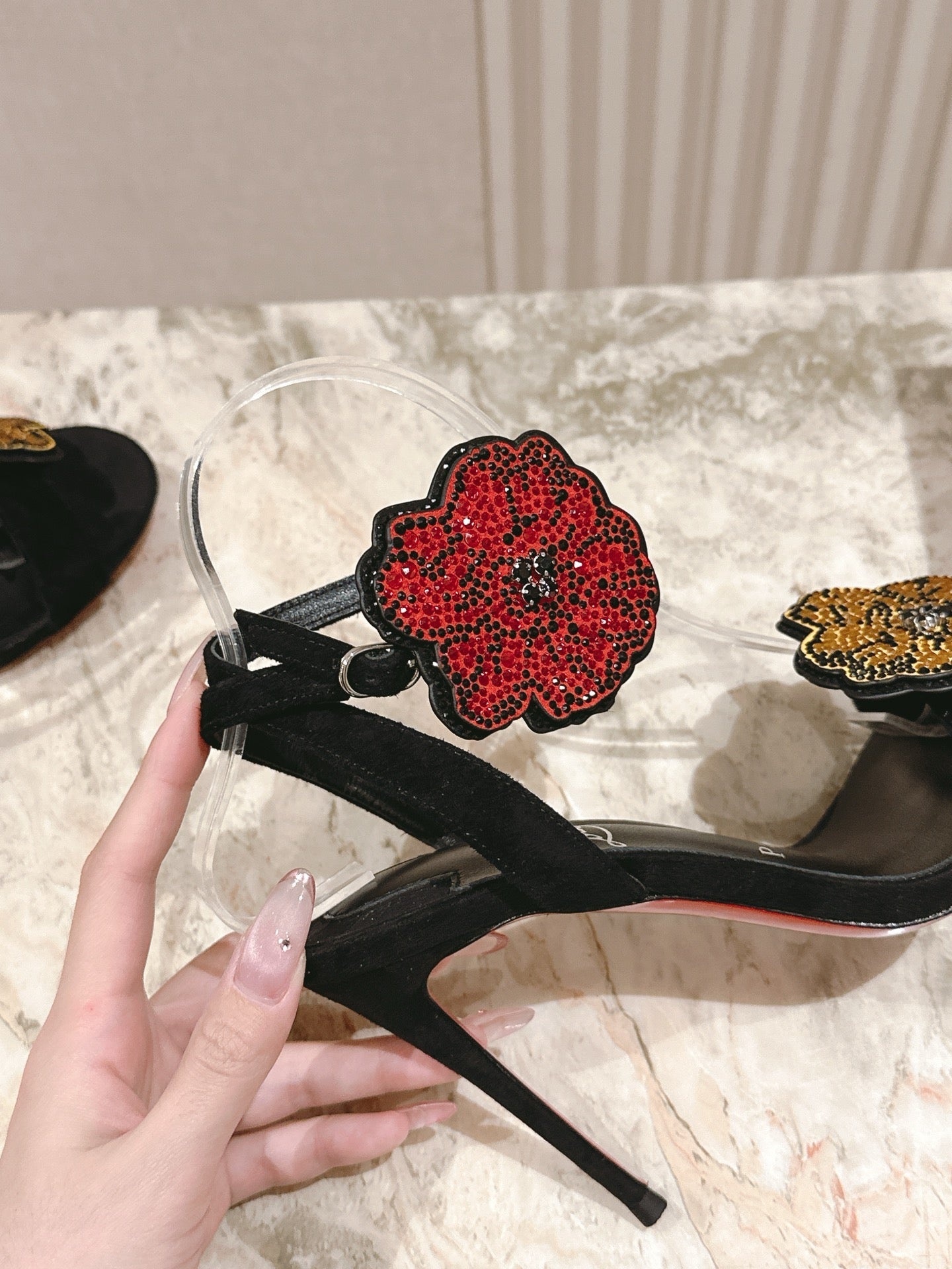 BEADED FLORAL EMBELLISHED SANDALS 135MM IN BLACK VELVET MIX CALFSKIN