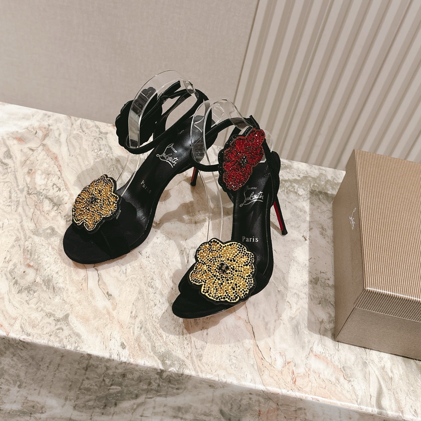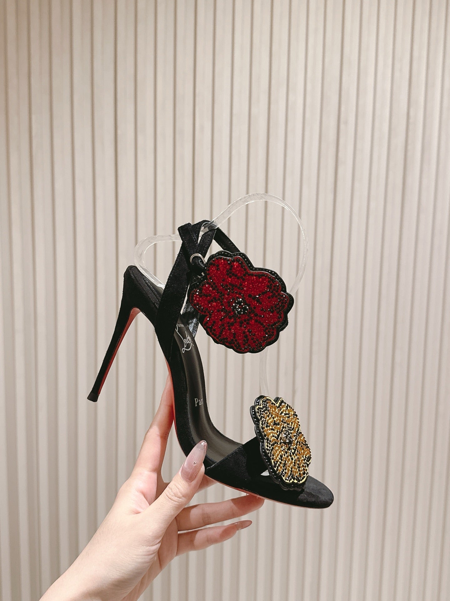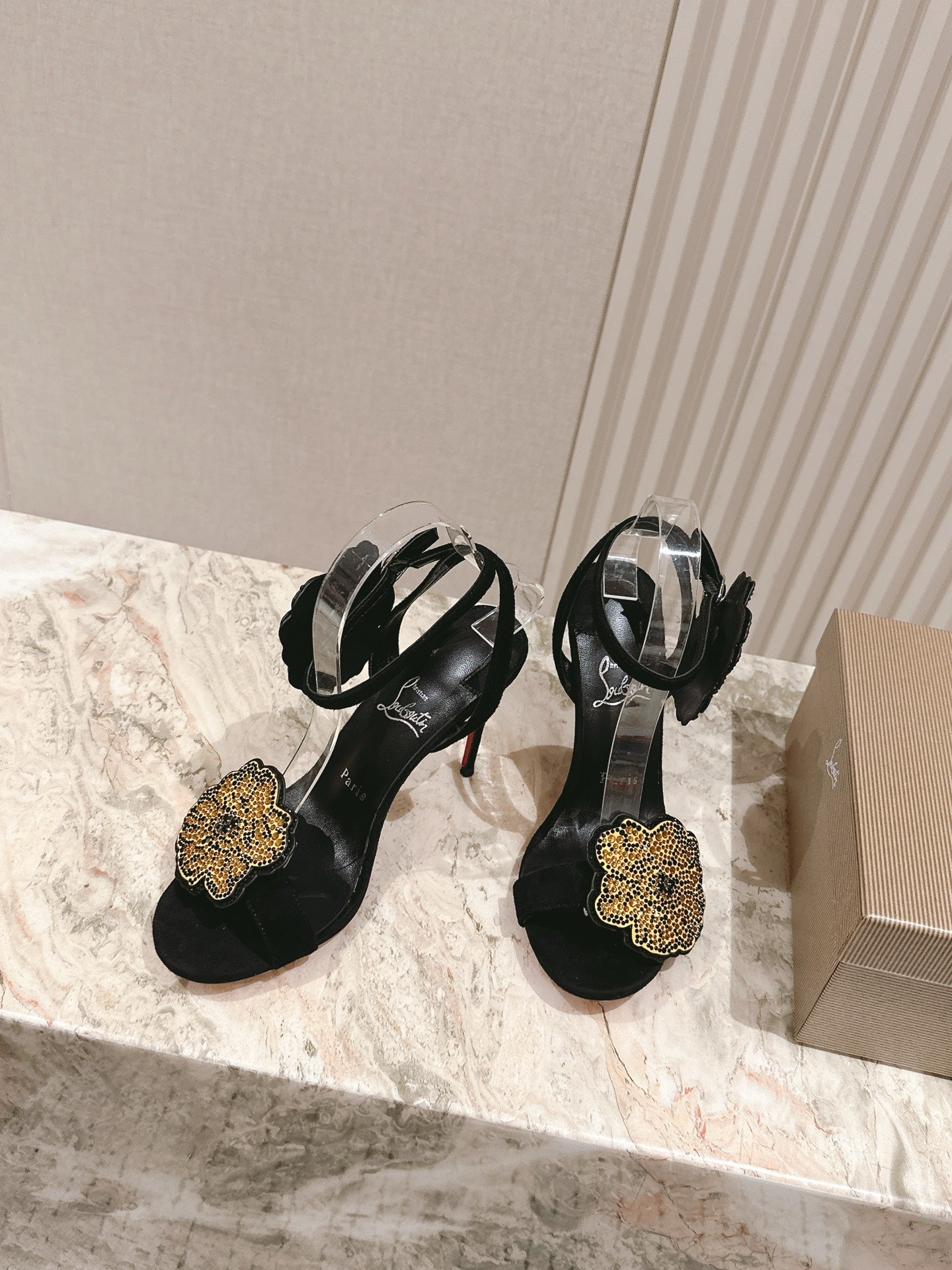 BEADED FLORAL EMBELLISHED SANDALS 135MM IN BLACK VELVET MIX CALFSKIN