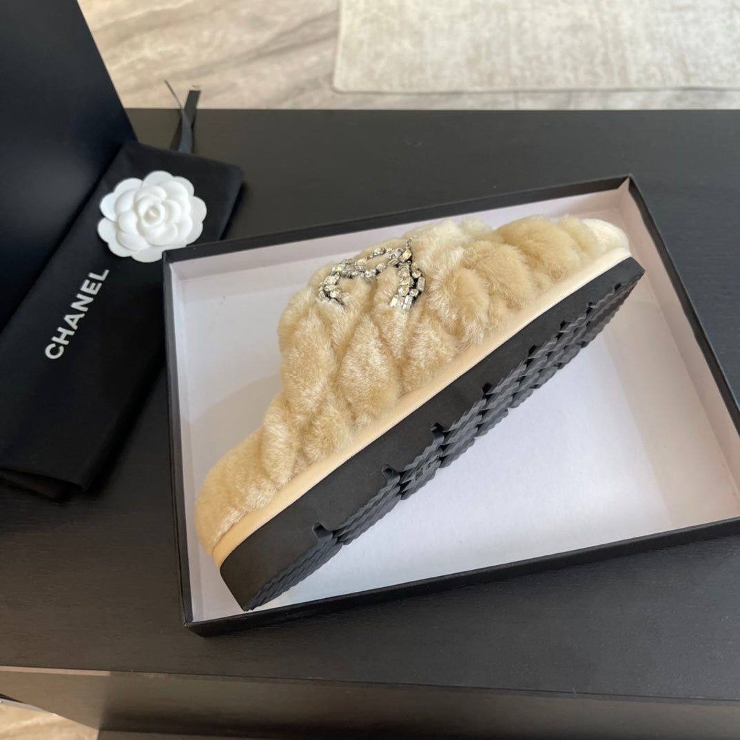 BEIGE CREAM FUR CROSS STRAP SLIPPERS