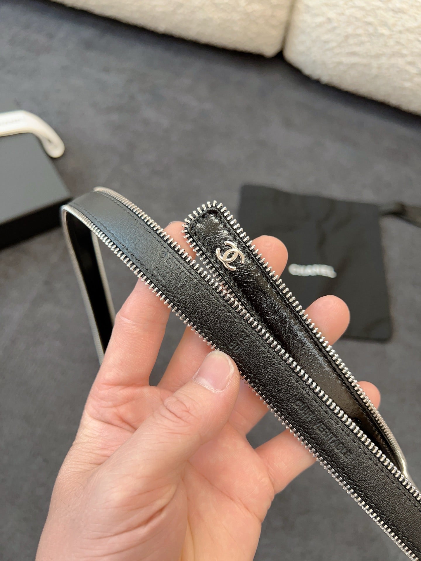 BELT 20MM IN BLACK CALFSKIN WITH INTERWOVEN CHAIN BUCKLE ZIPPER IN TRIM