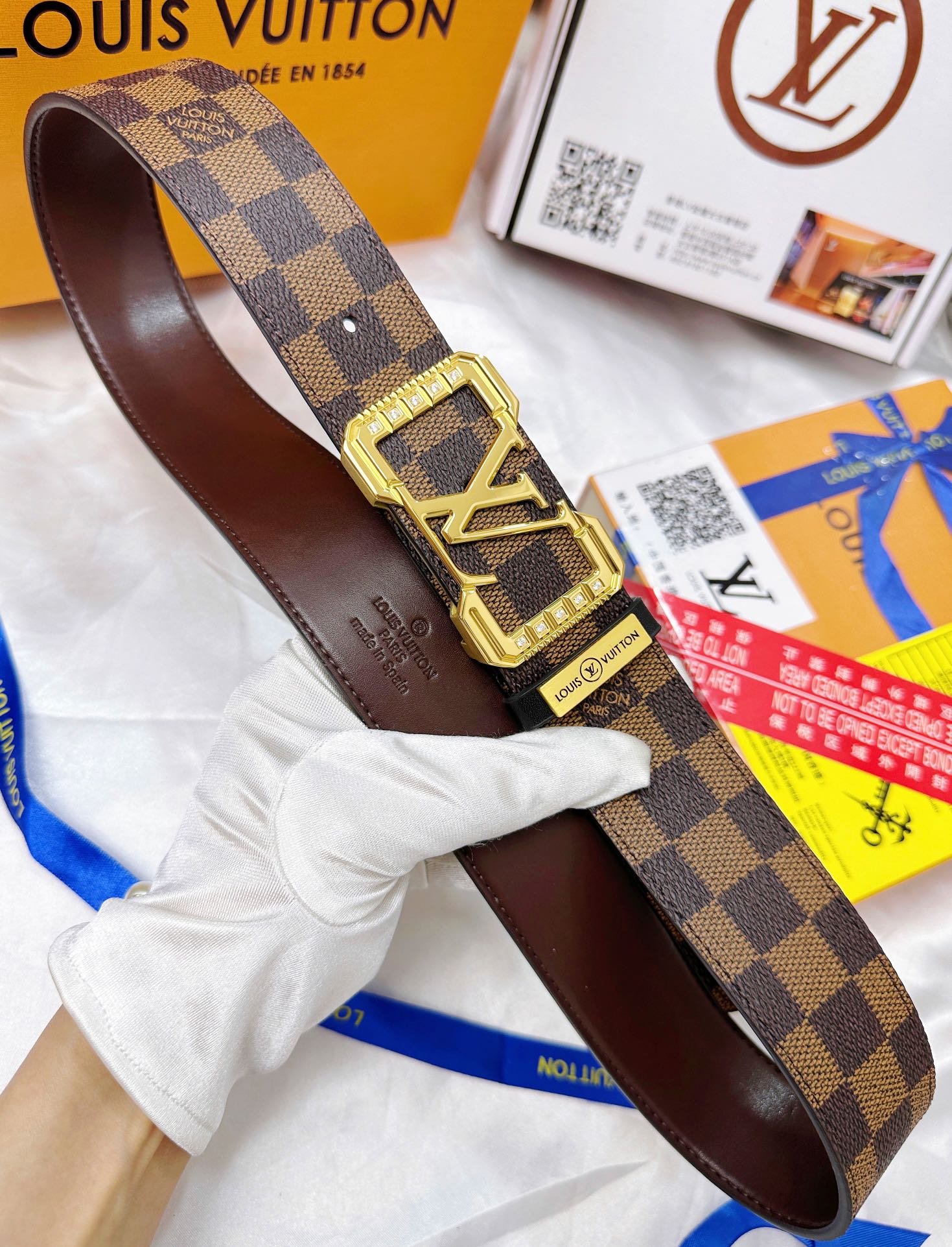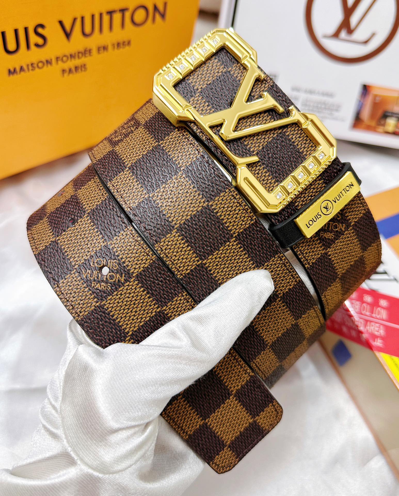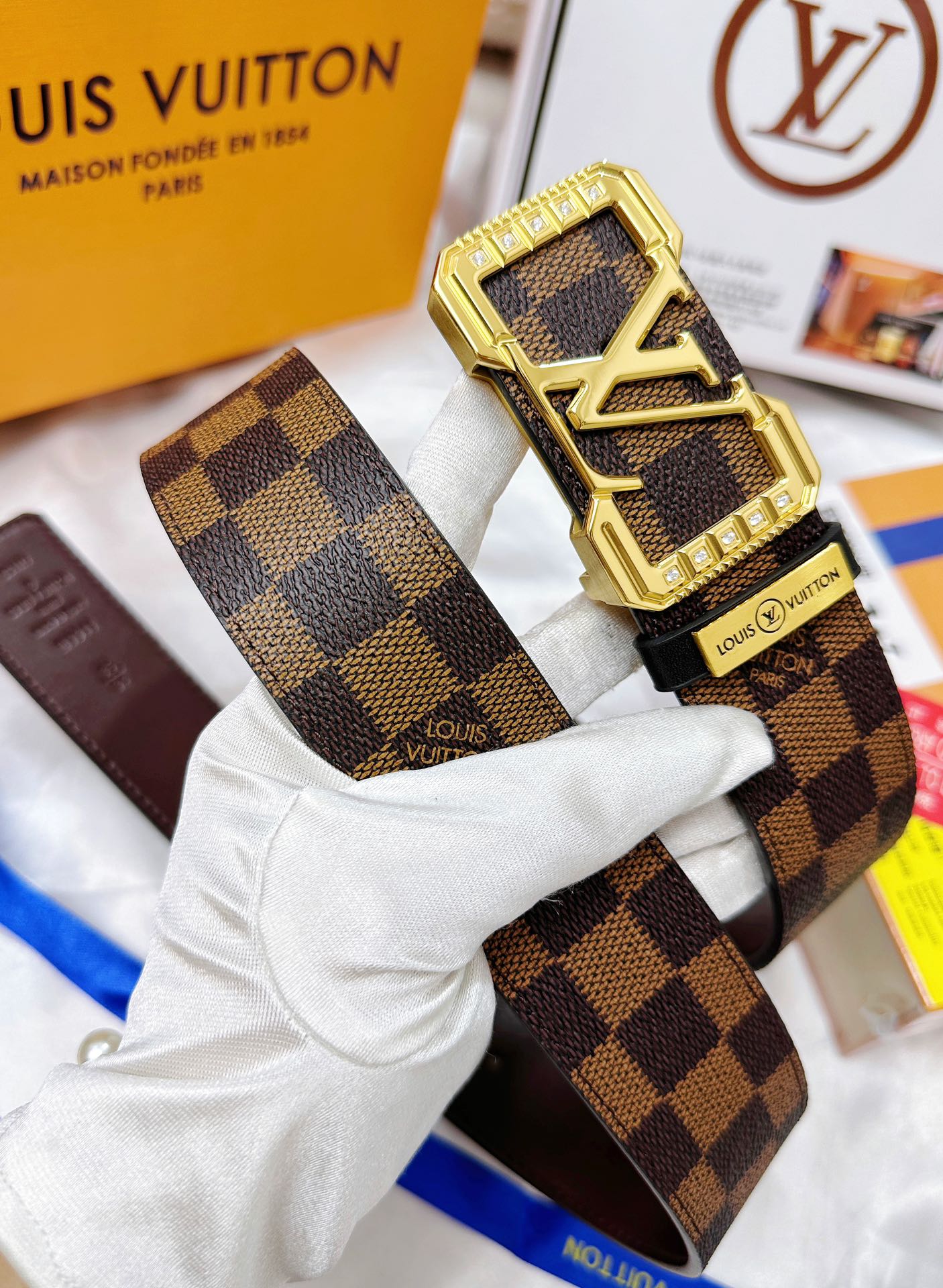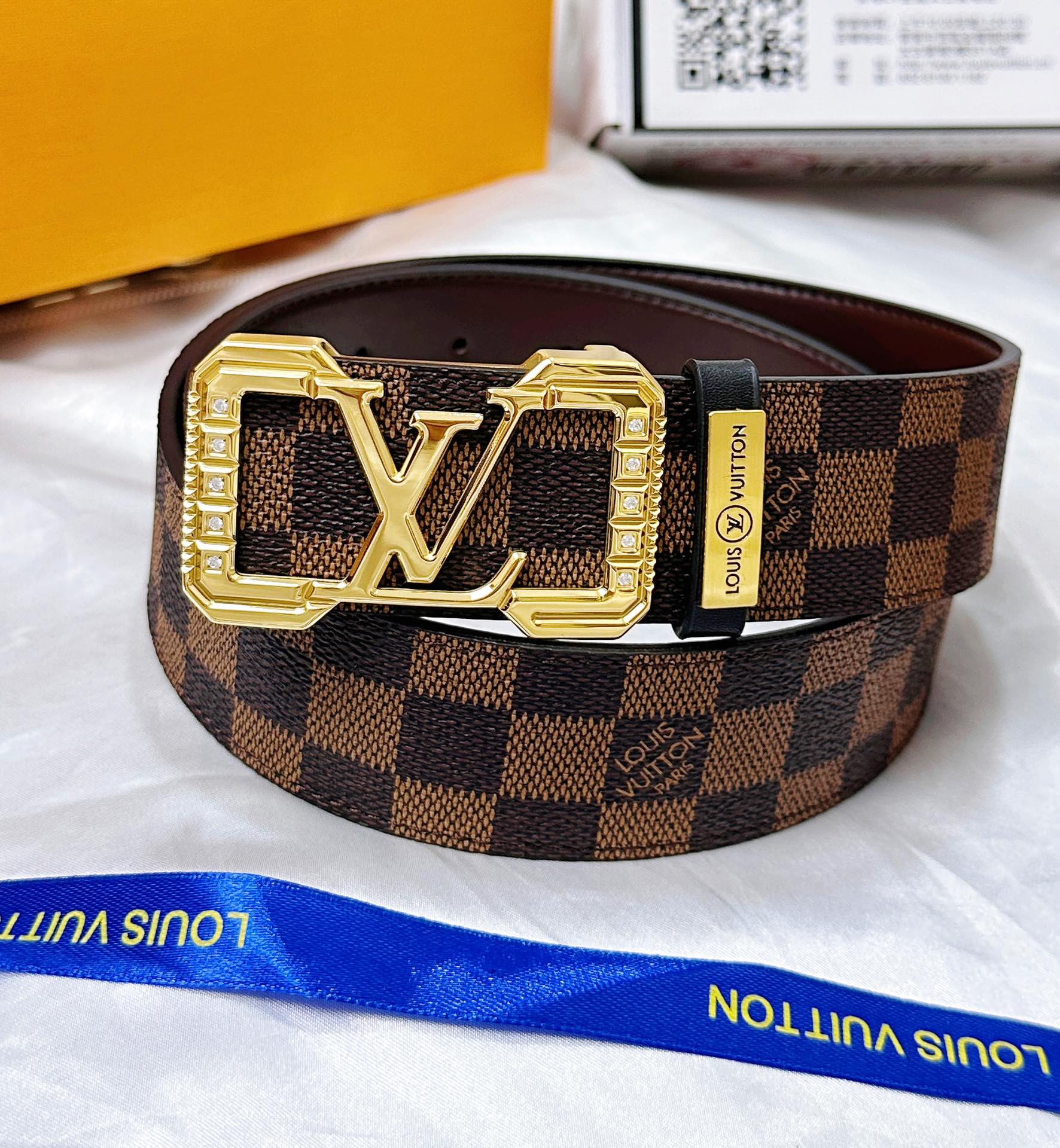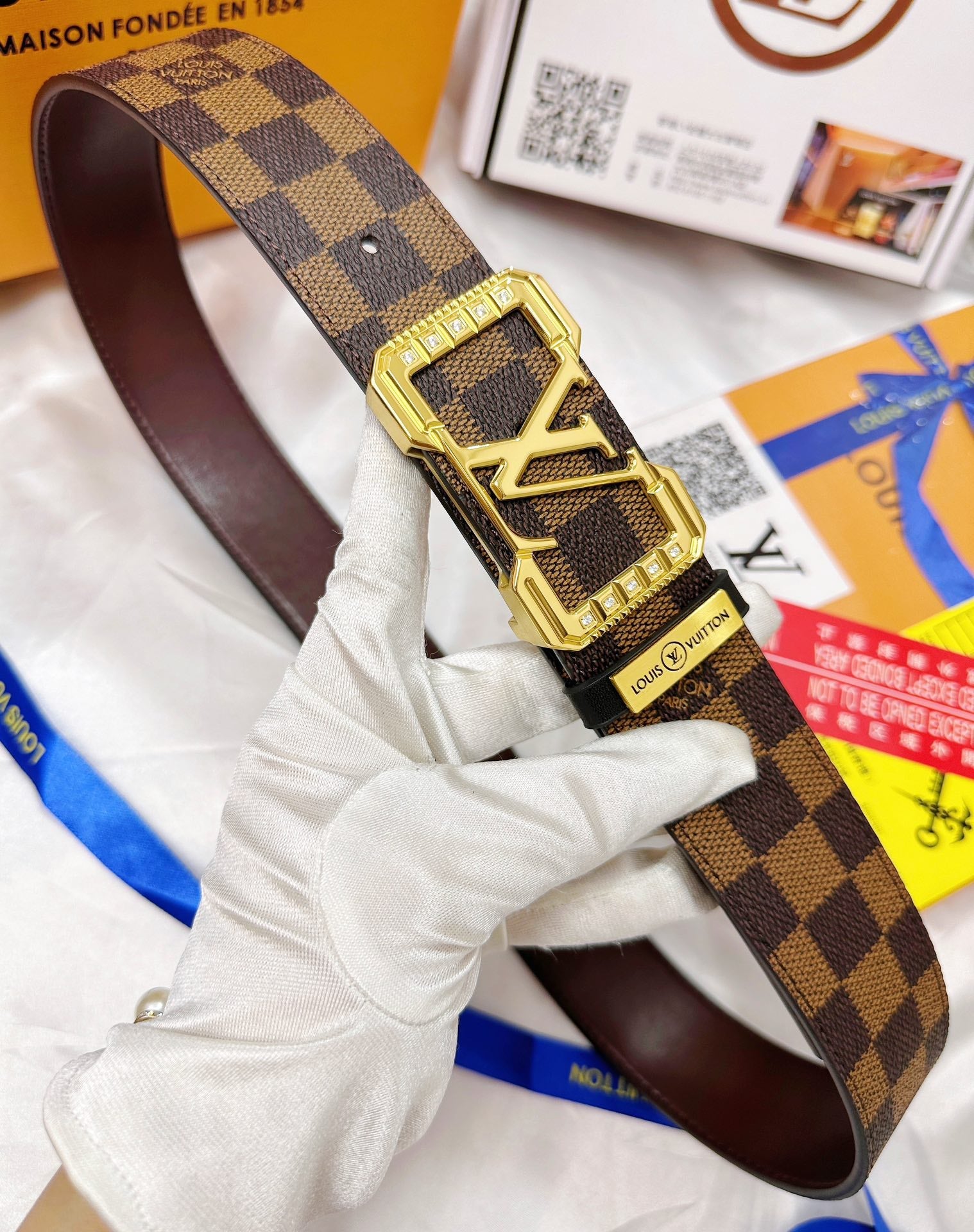 BELT 38MM REVERSIBLE IN BROWN CHECKERED PATTERN WITH GOLD PAVE BUCKLE