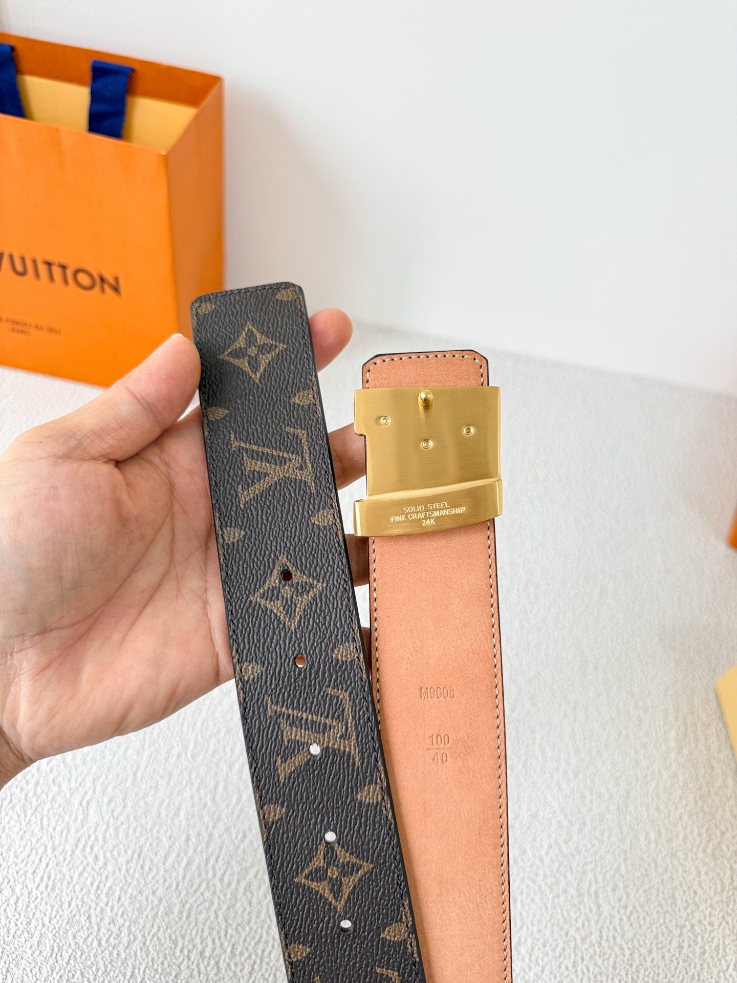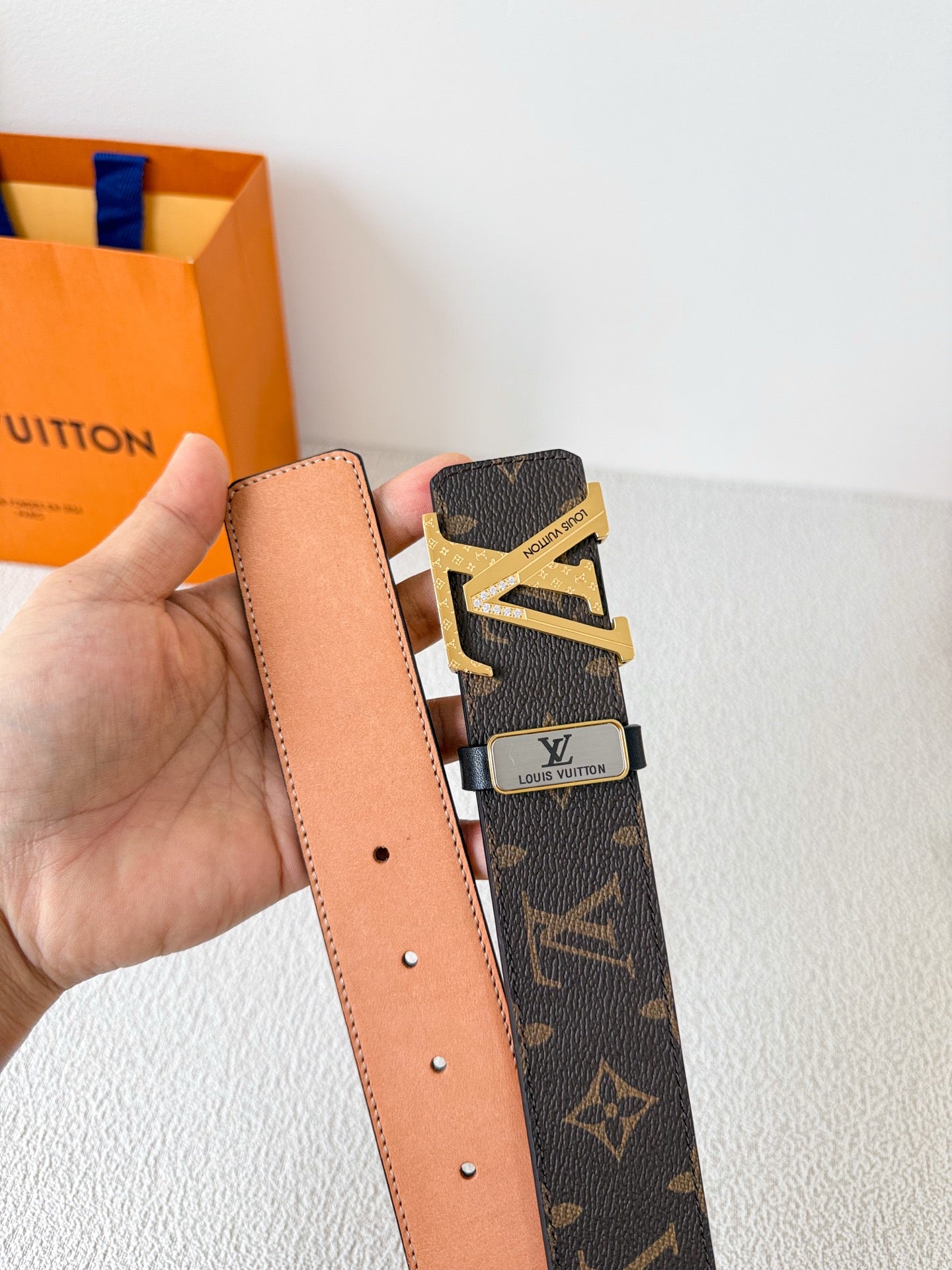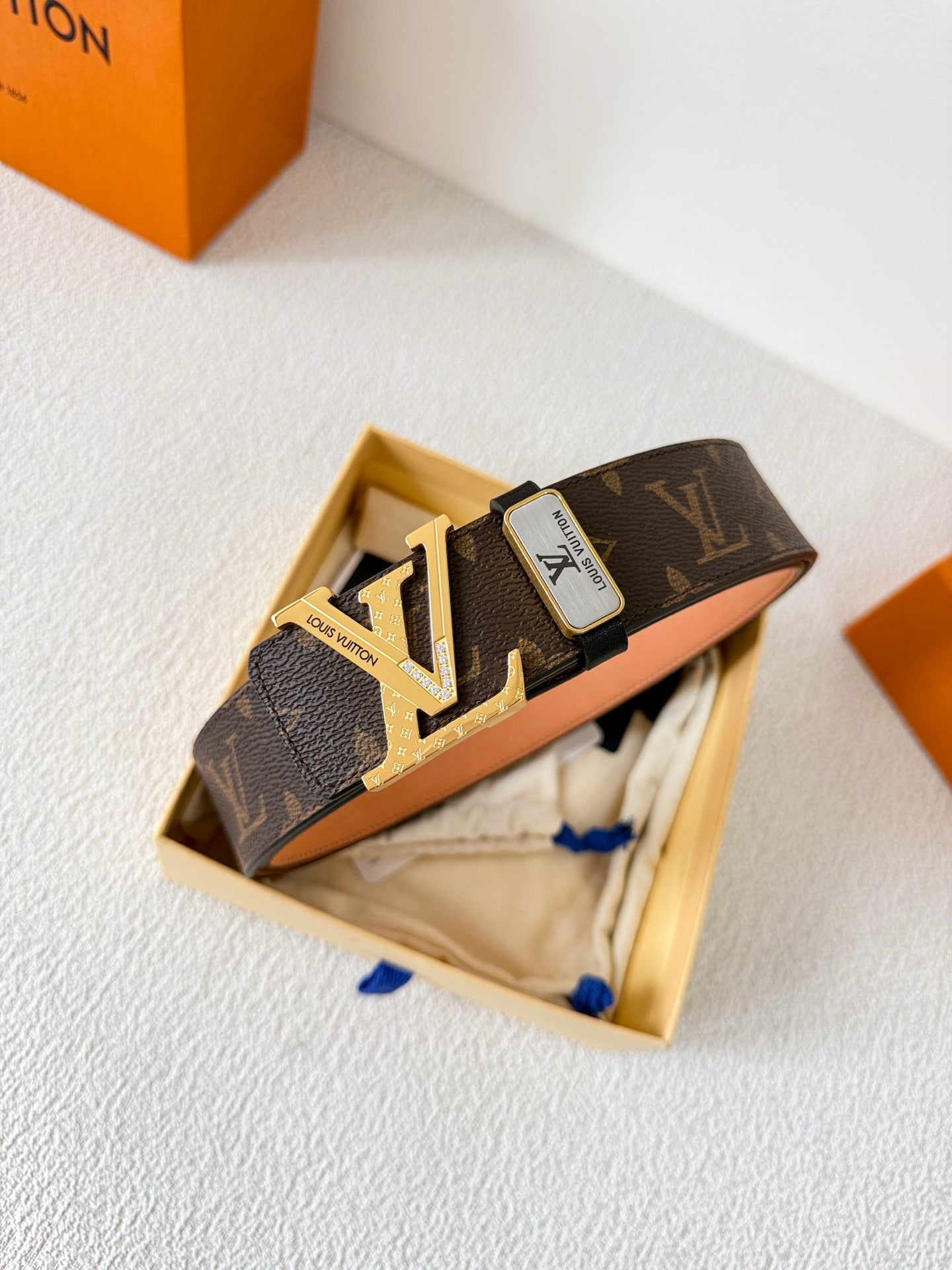 BELT 38MM REVERSIBLE IN BROWN MONOGRAM CALFSKIN WITH GOLD DIAMOND EMBELLISHED BUCKLE