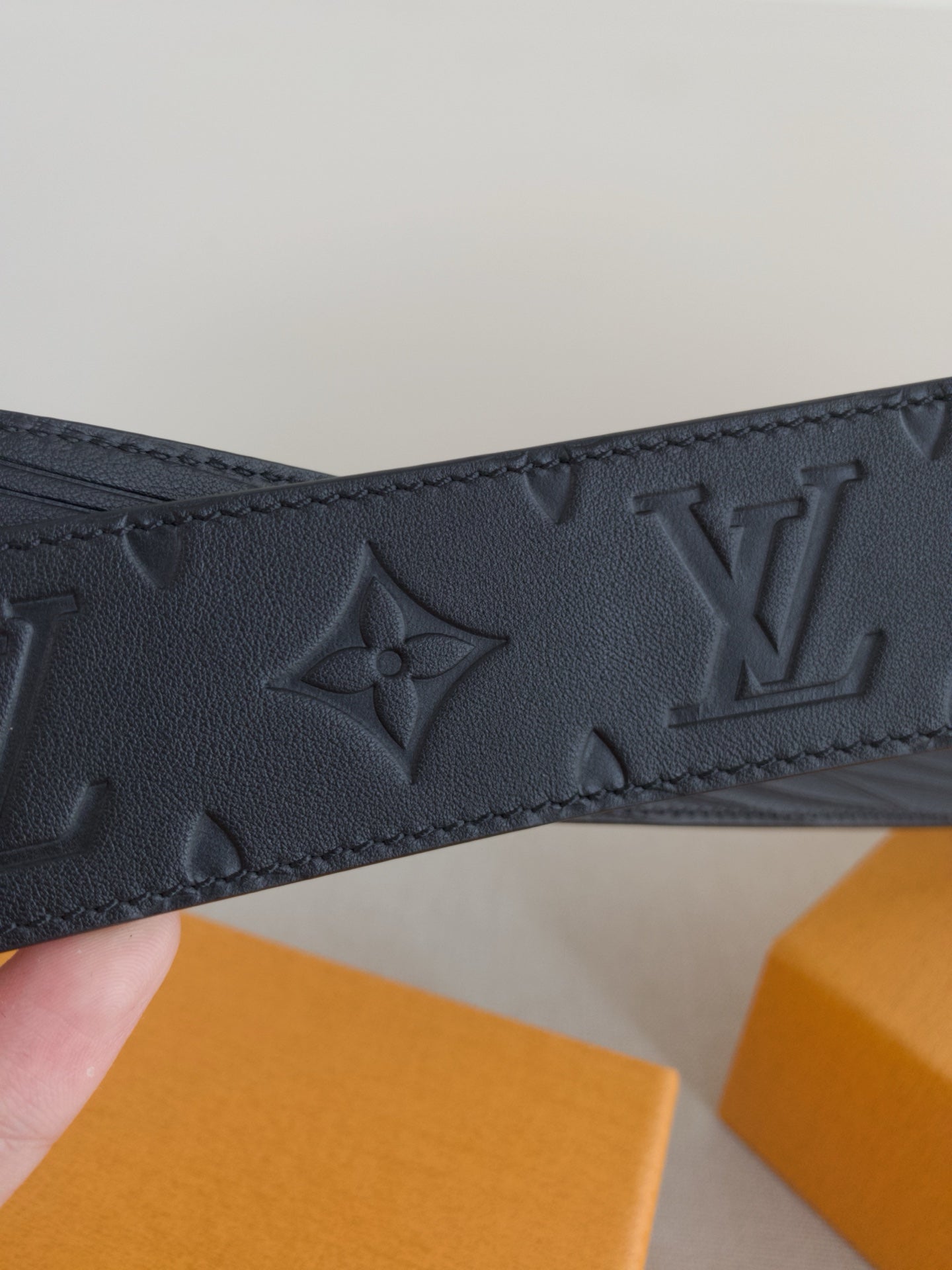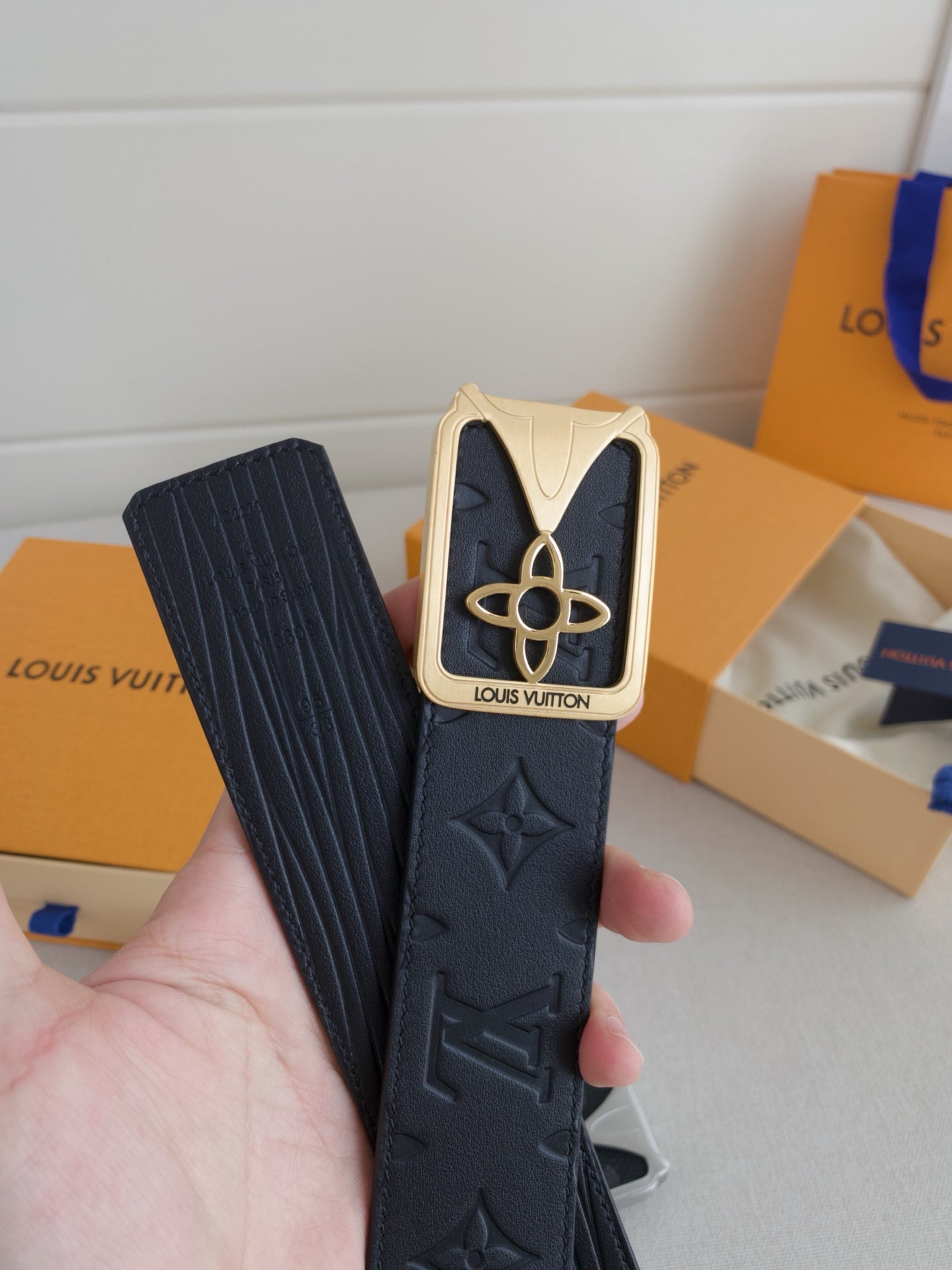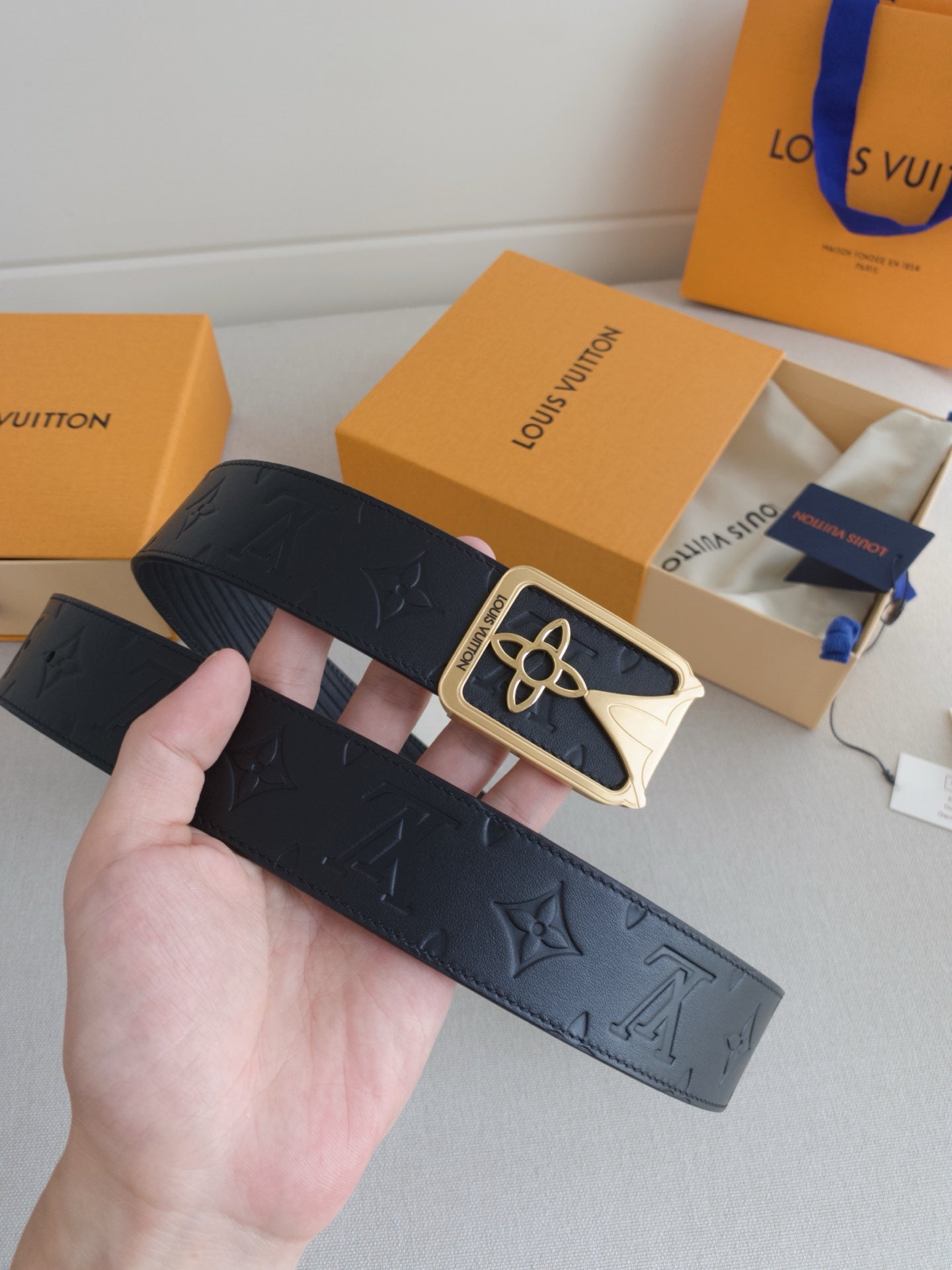 BELT 40MM REVERSIBLE IN BLACK TAURILLON CALFSKIN EMBOSSED LOGO AND GOLD LV BUCKLE
