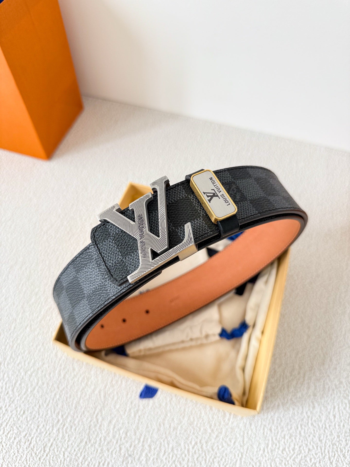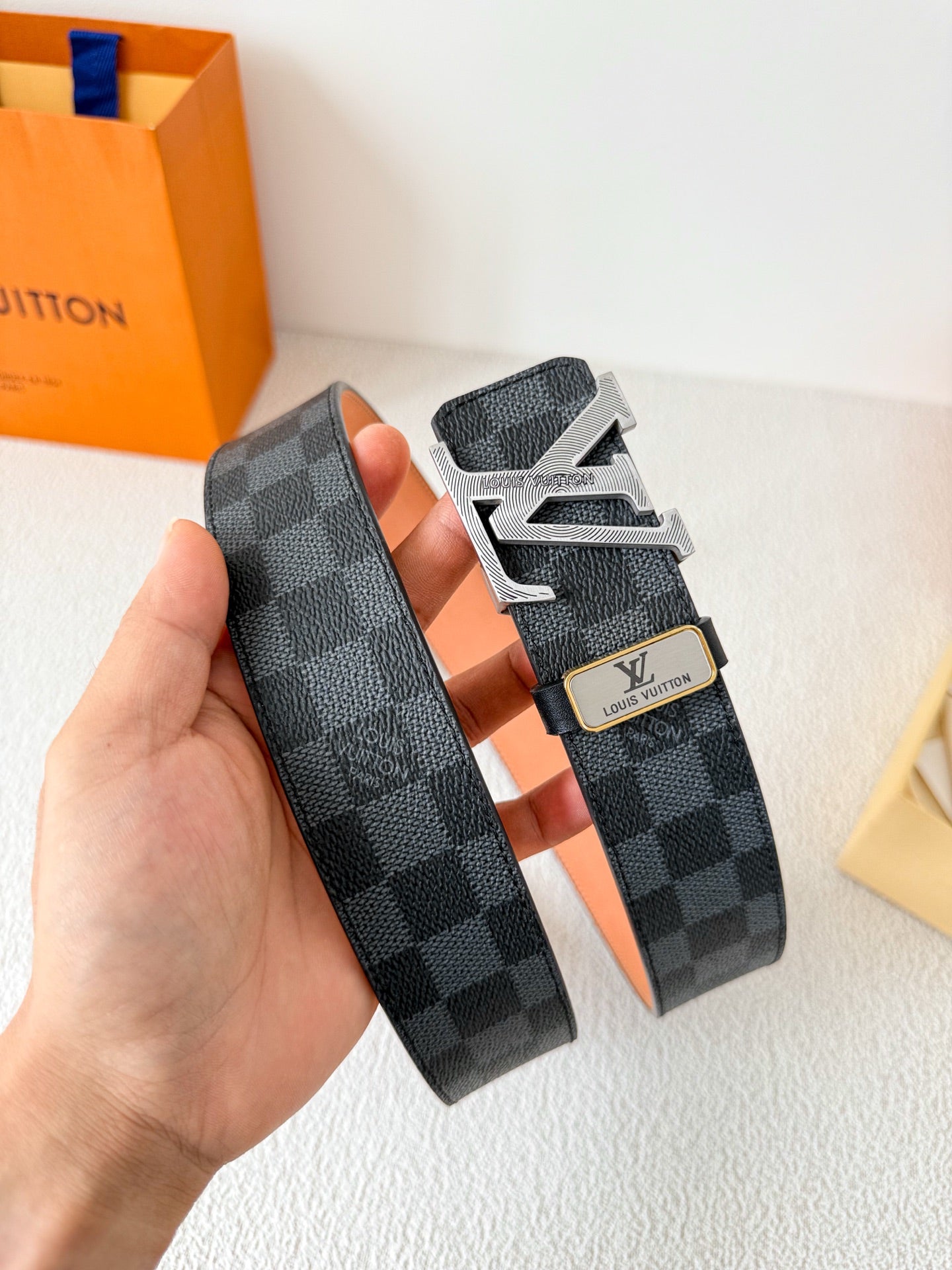 BELT SQUARE BUCKLE 38MM REVERSIBLE IN BLACK AND GREY CHECKERED CALFSKIN SILVER PLATED BUCKLE