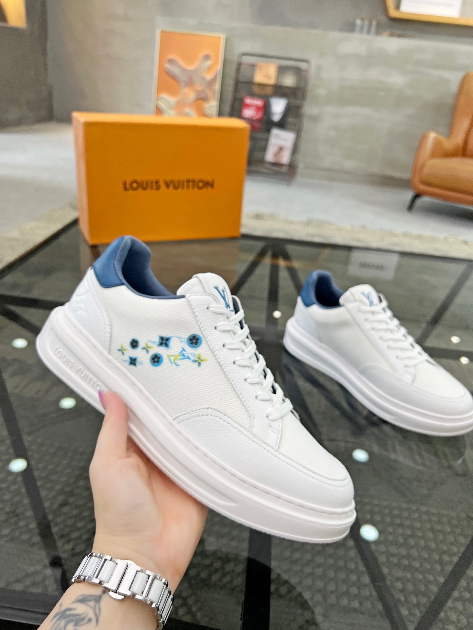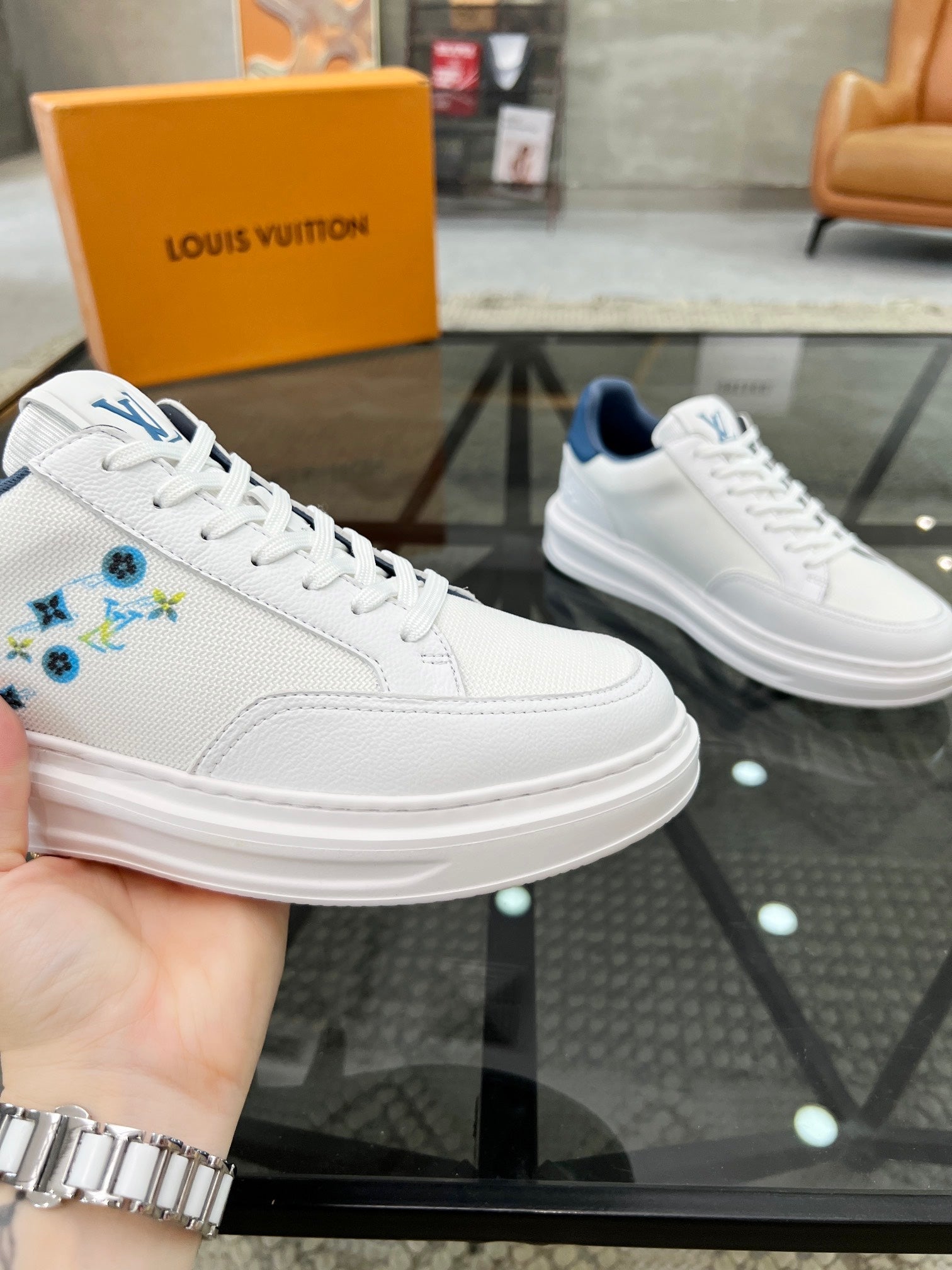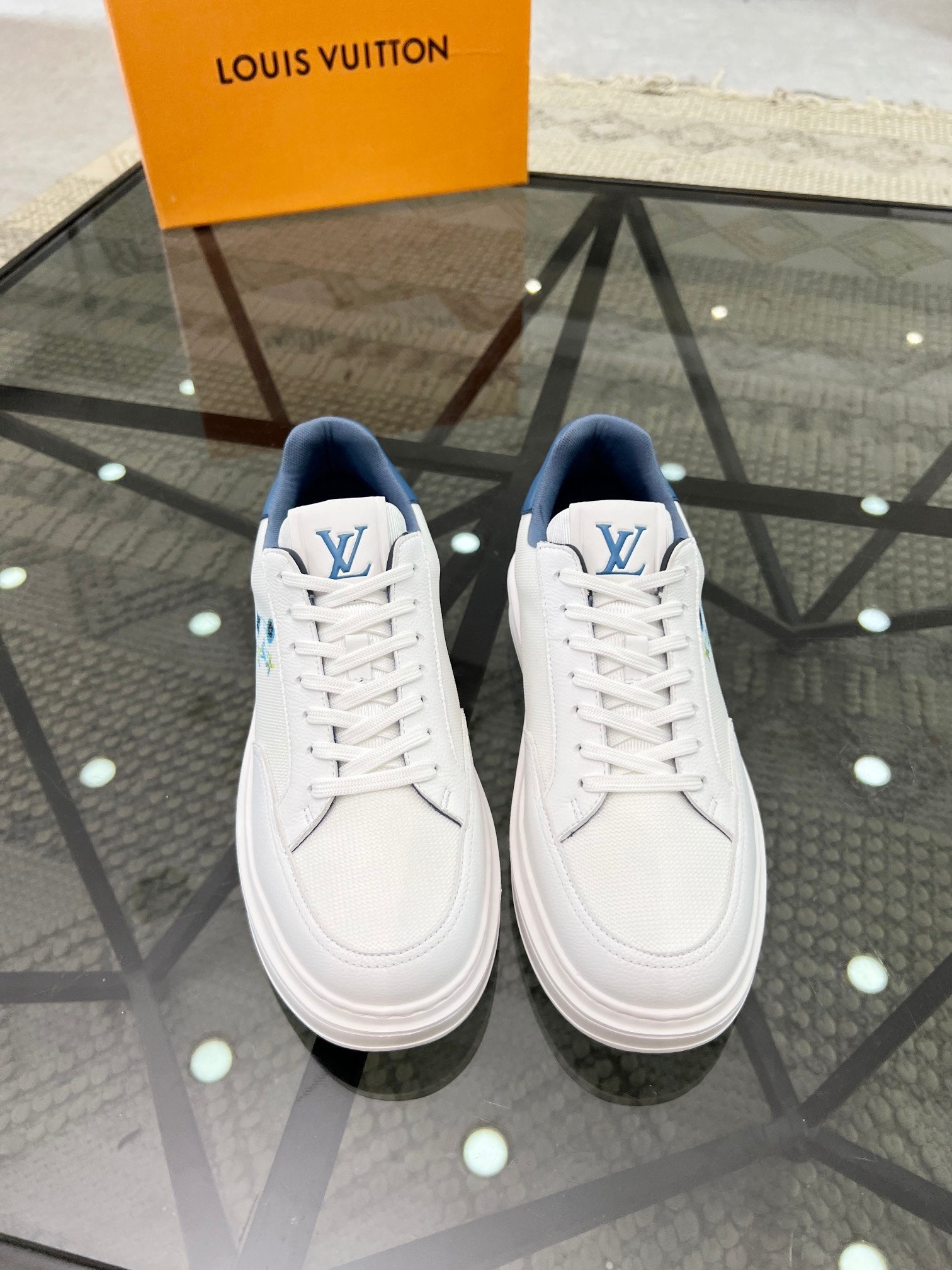 BEVERLY HILLS TRAINERS WHITE MIX DENIM BLUE CALFSKIN AND MESH FABRIC