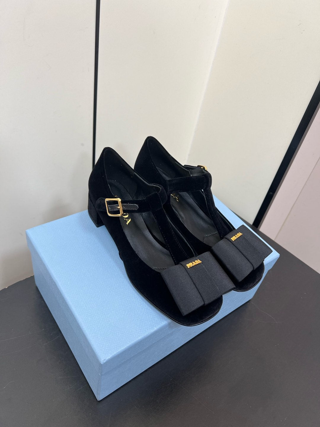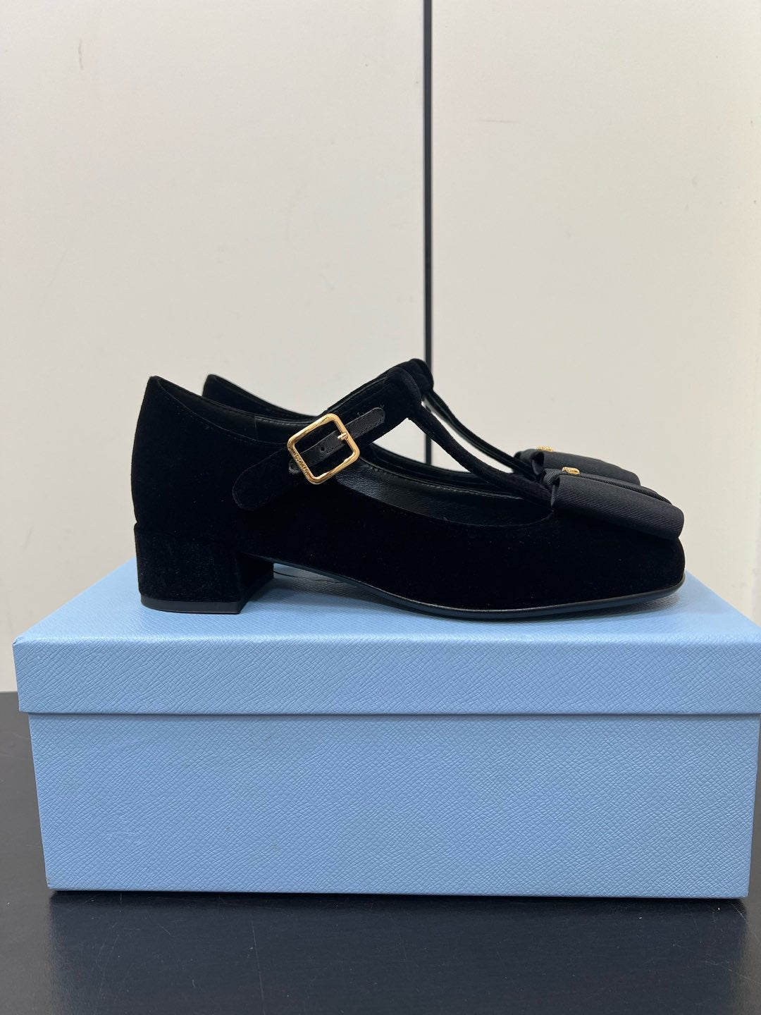 BOW MARY JANE PUMPS WITH T-STRAP IN BLACK VELVET