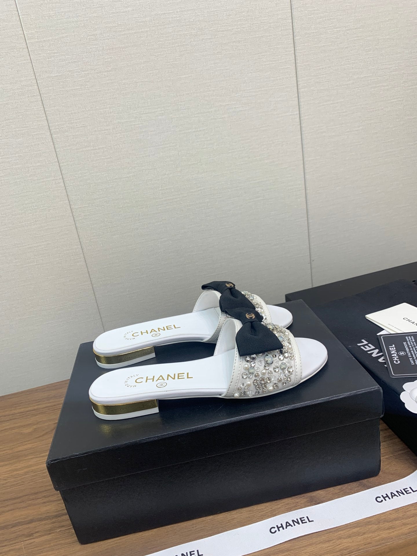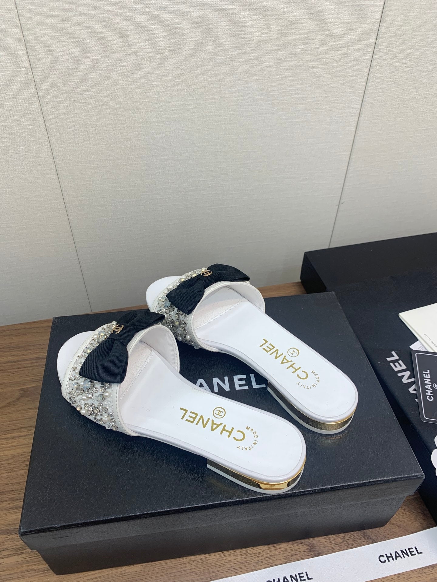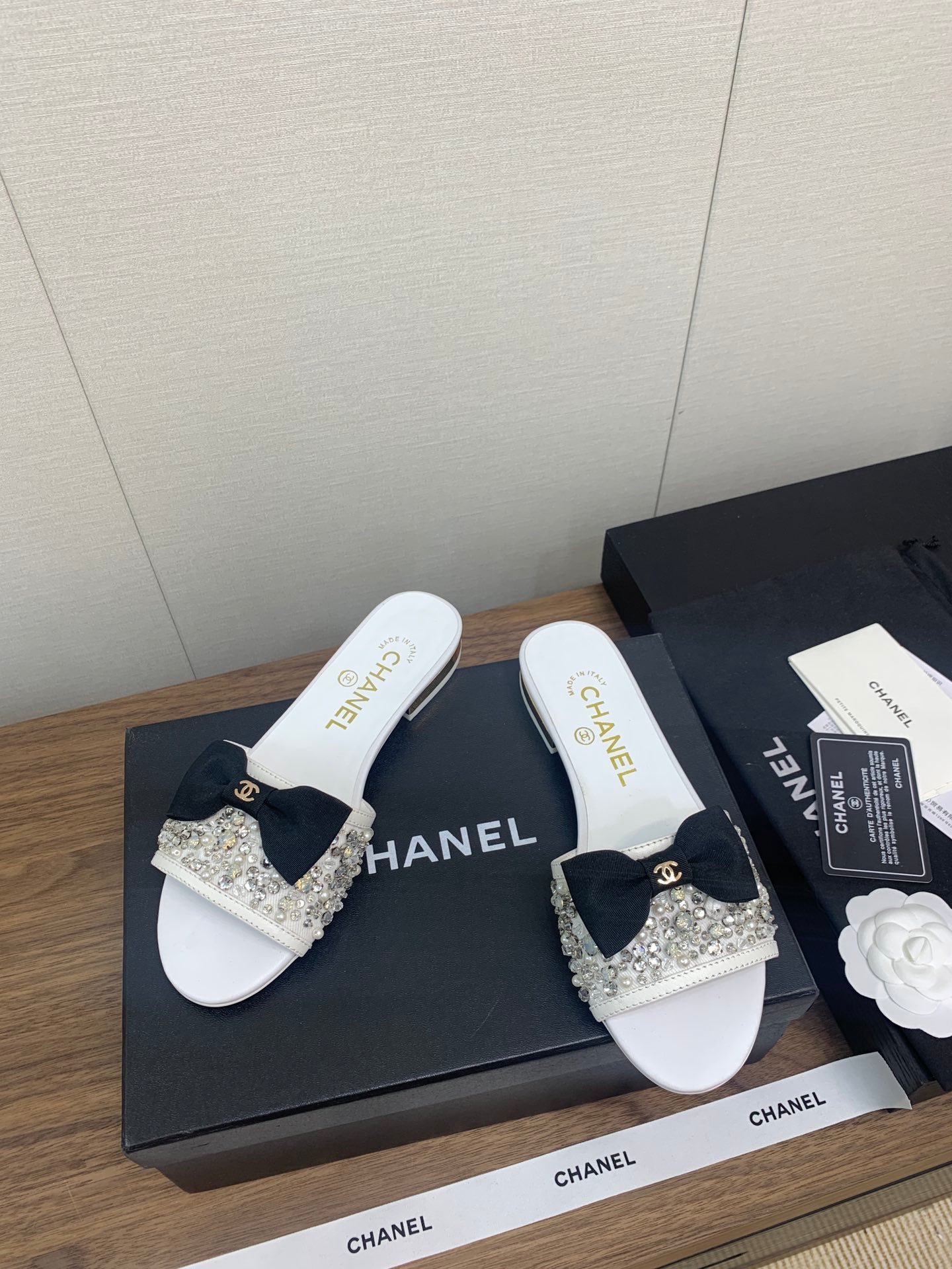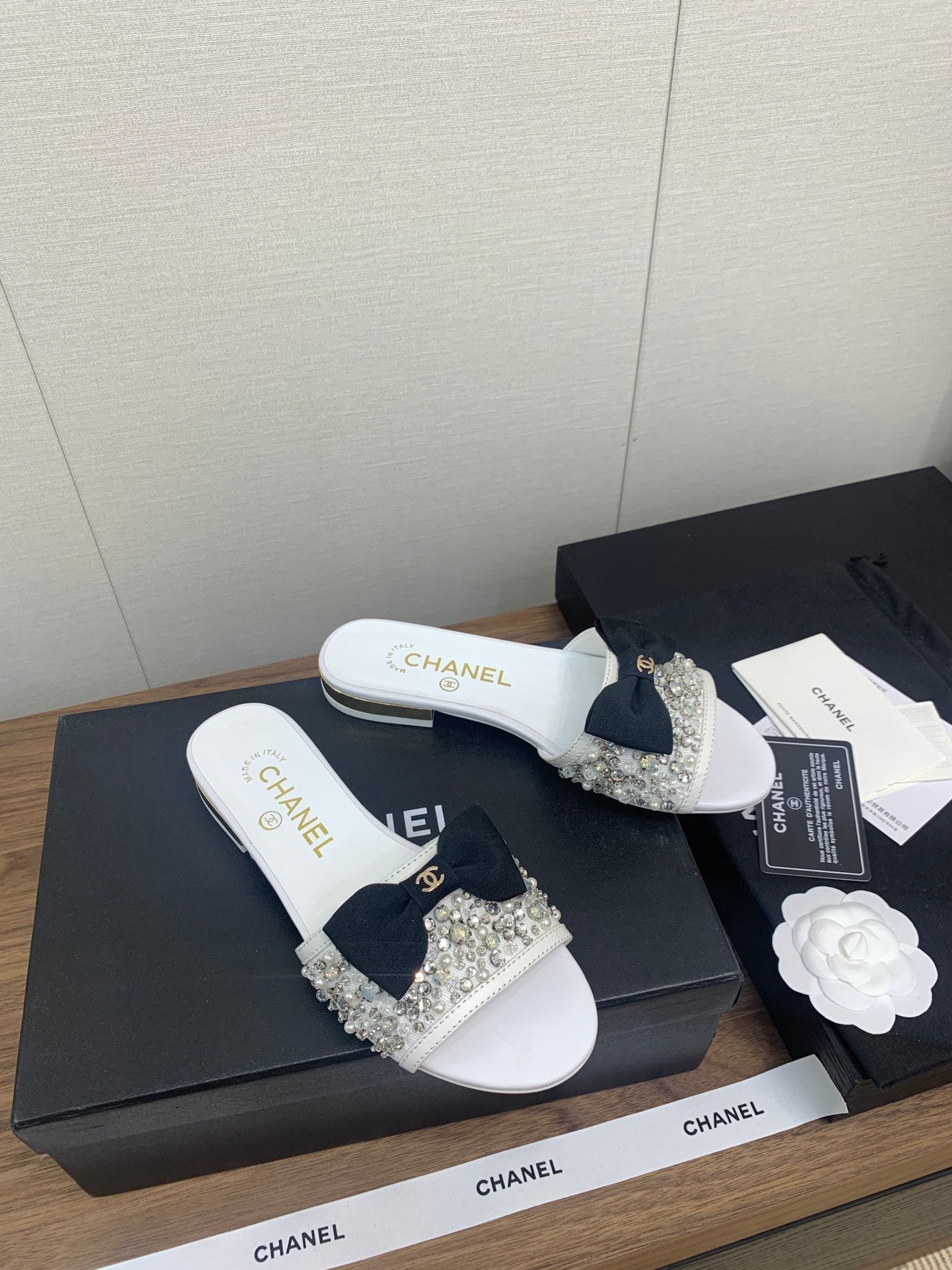 BOW SLIPPERS IN WHITE LAMBSKIN WITH RHINESTONES