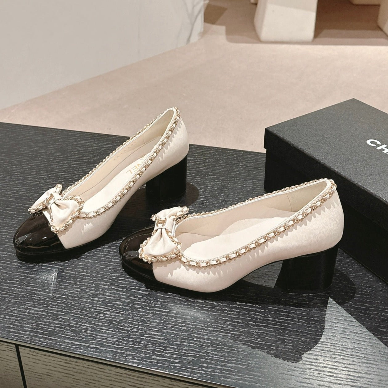 BOWKNOT HIGH HEELS IN WHITE MIX BLACK SHEEPSKIN