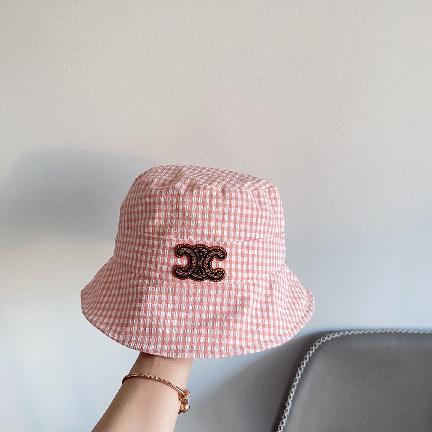 BUCKET HAT MODEL 652075 IN PINK & WHITE GINGHAM FABRIC