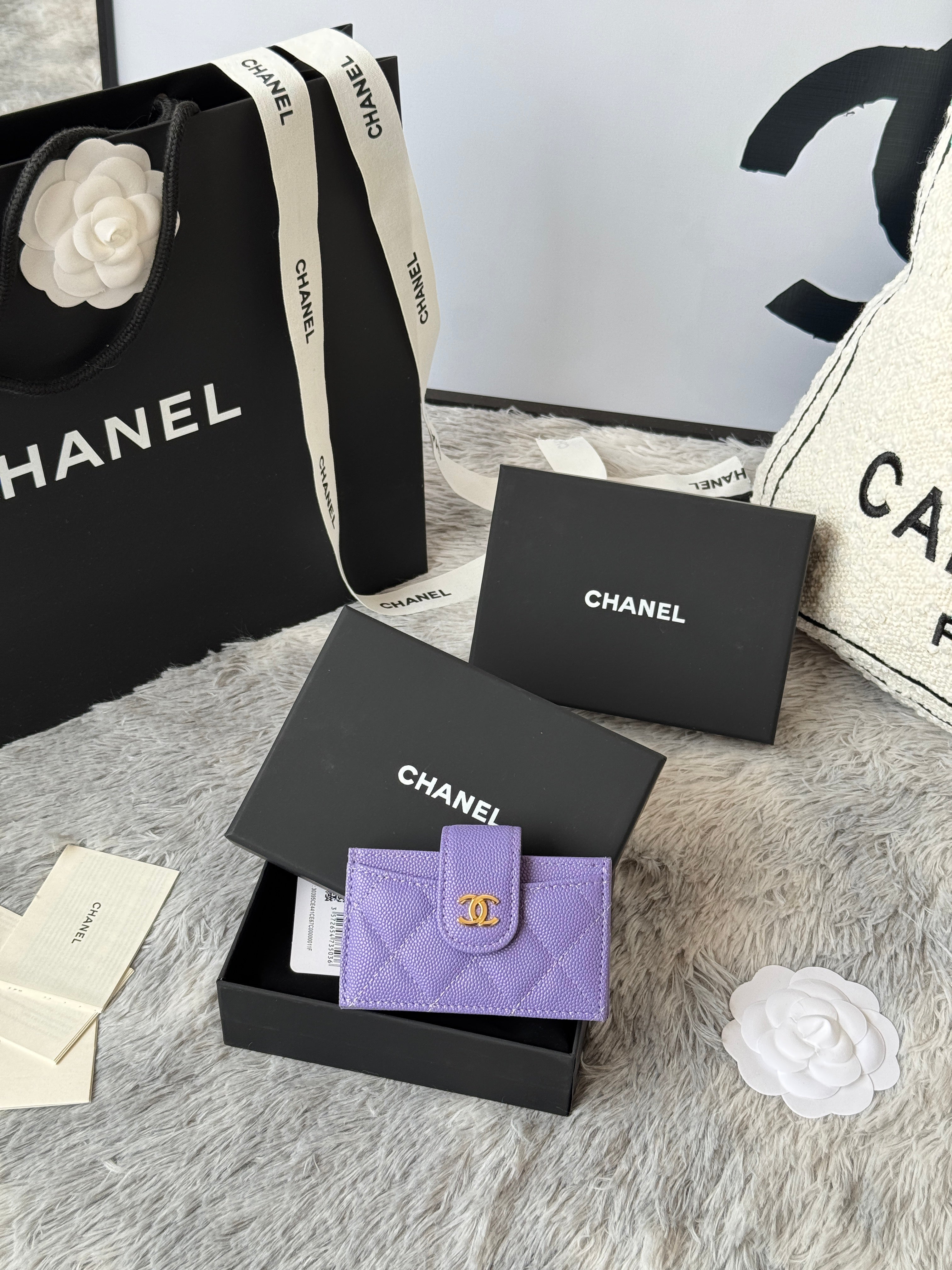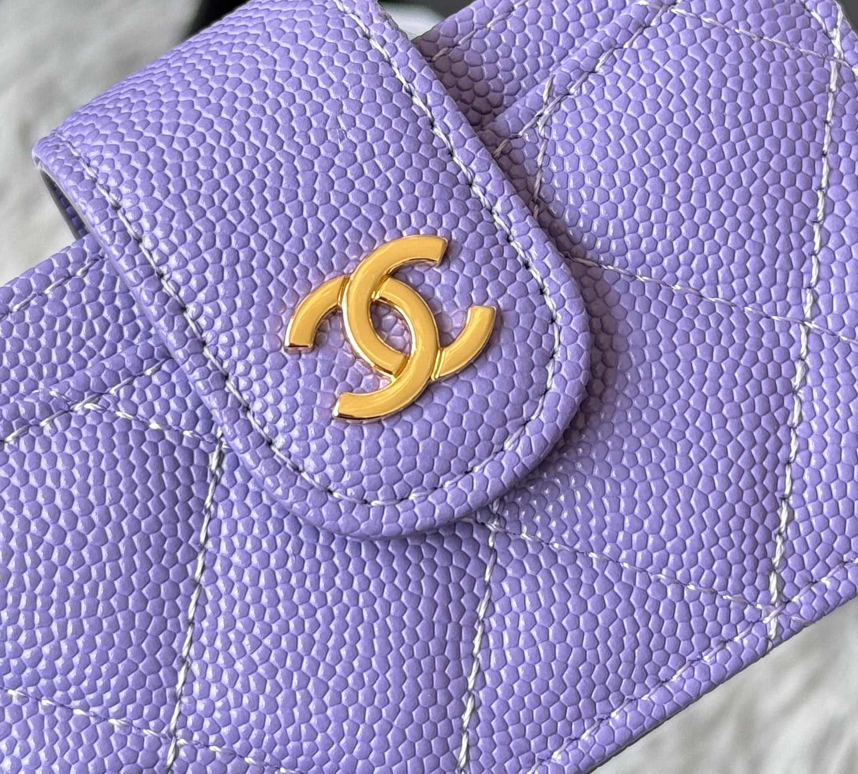 CARD HOLDER 10 CIRCLE CLASP IN BABY PURPLE CAVIAR LEATHER GOLD-TONE METALLIC