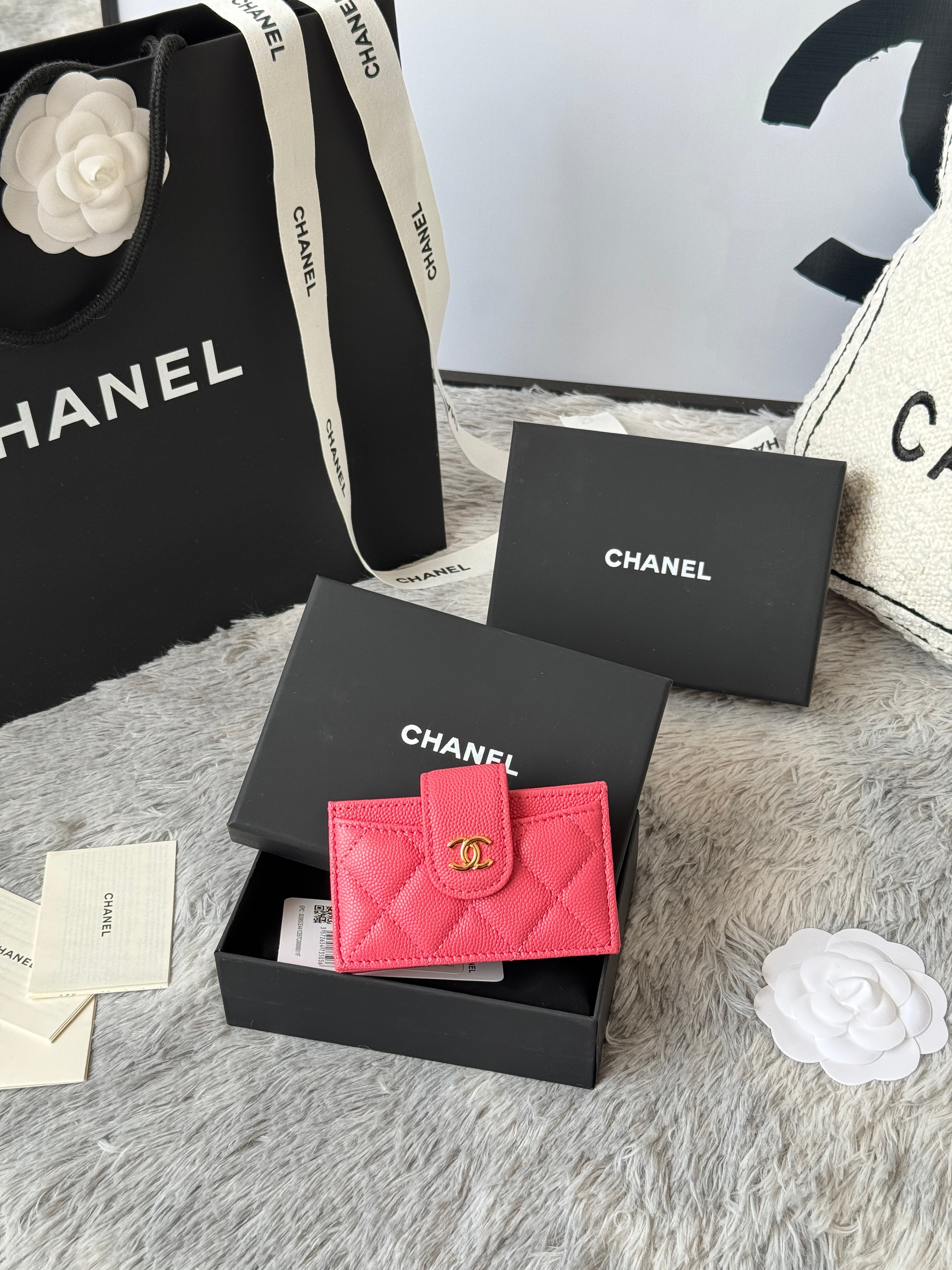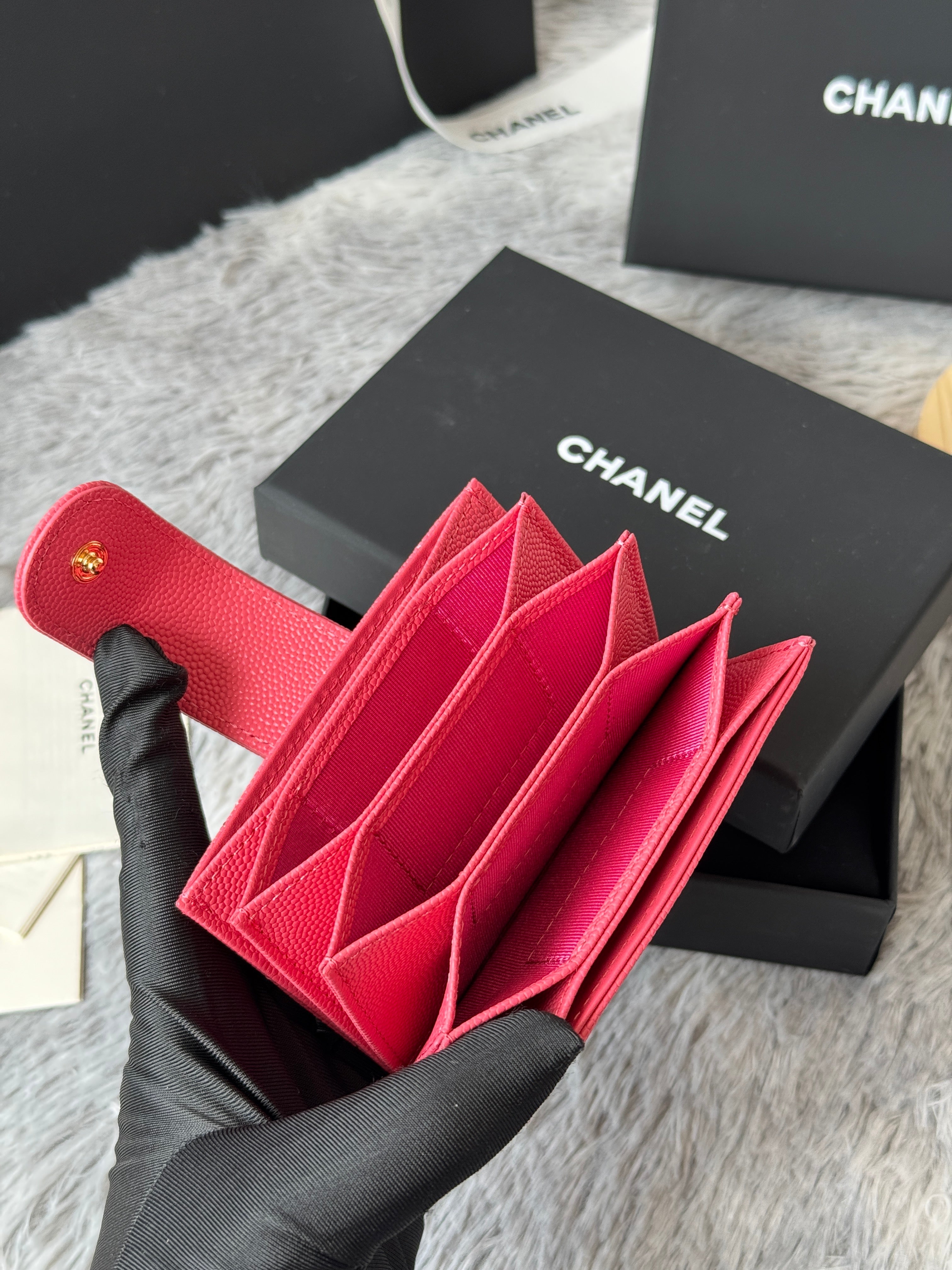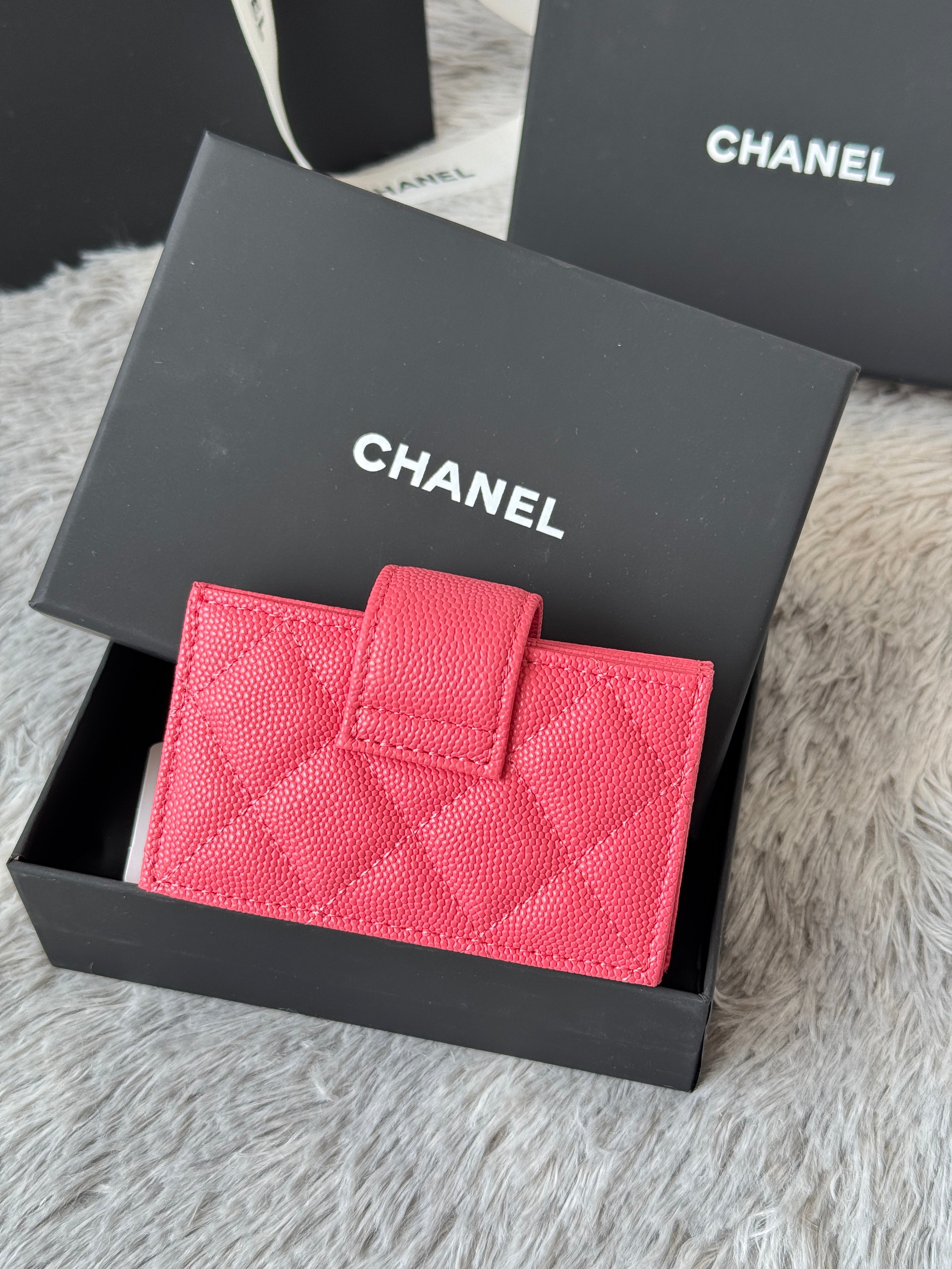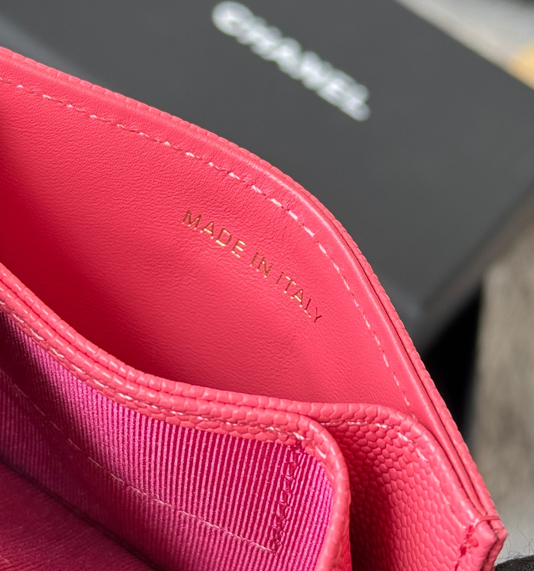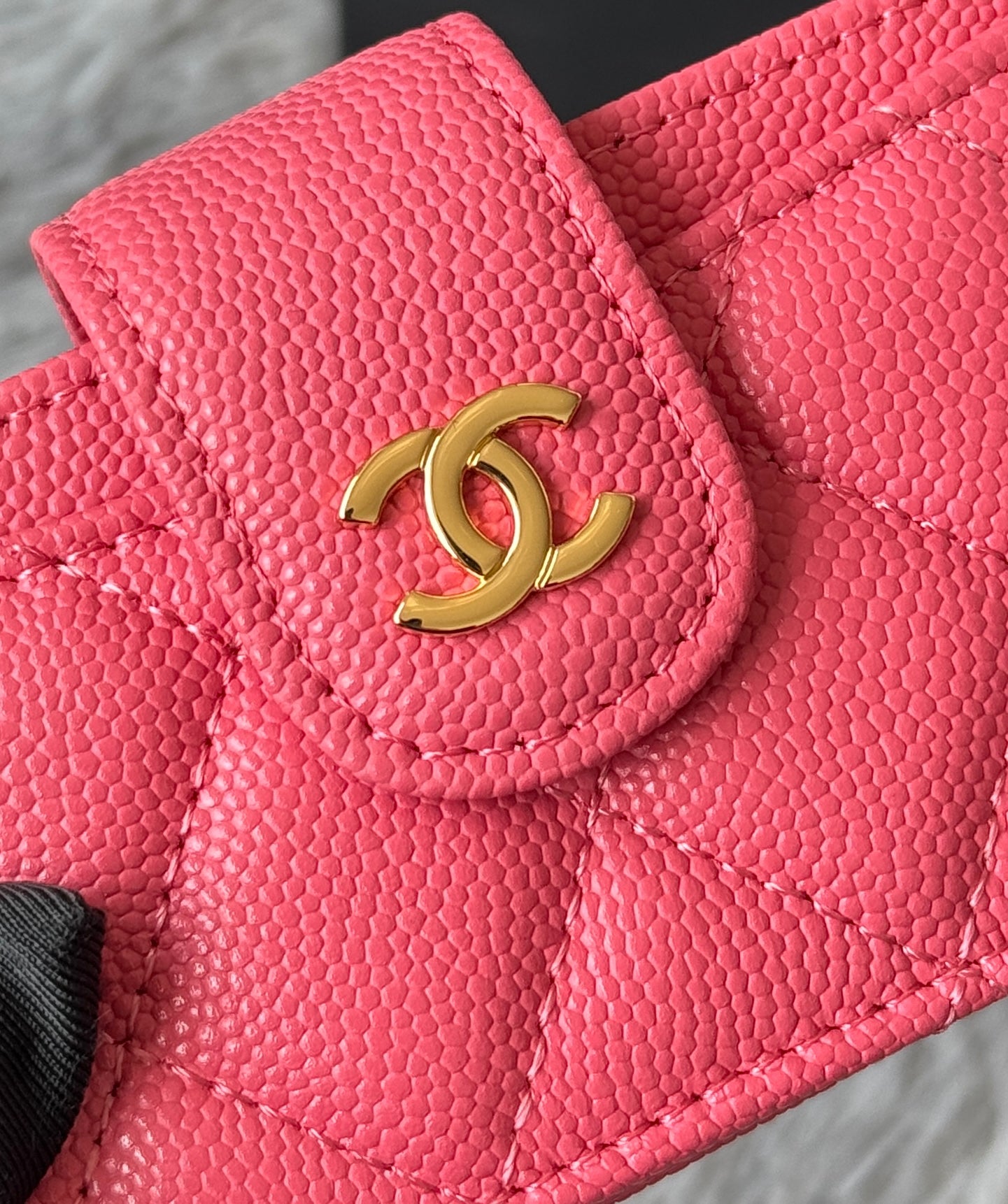 CARD HOLDER 10 CIRCLE CLASP IN MANDY PINK CAVIAR LEATHER GOLD-TONE METALLIC