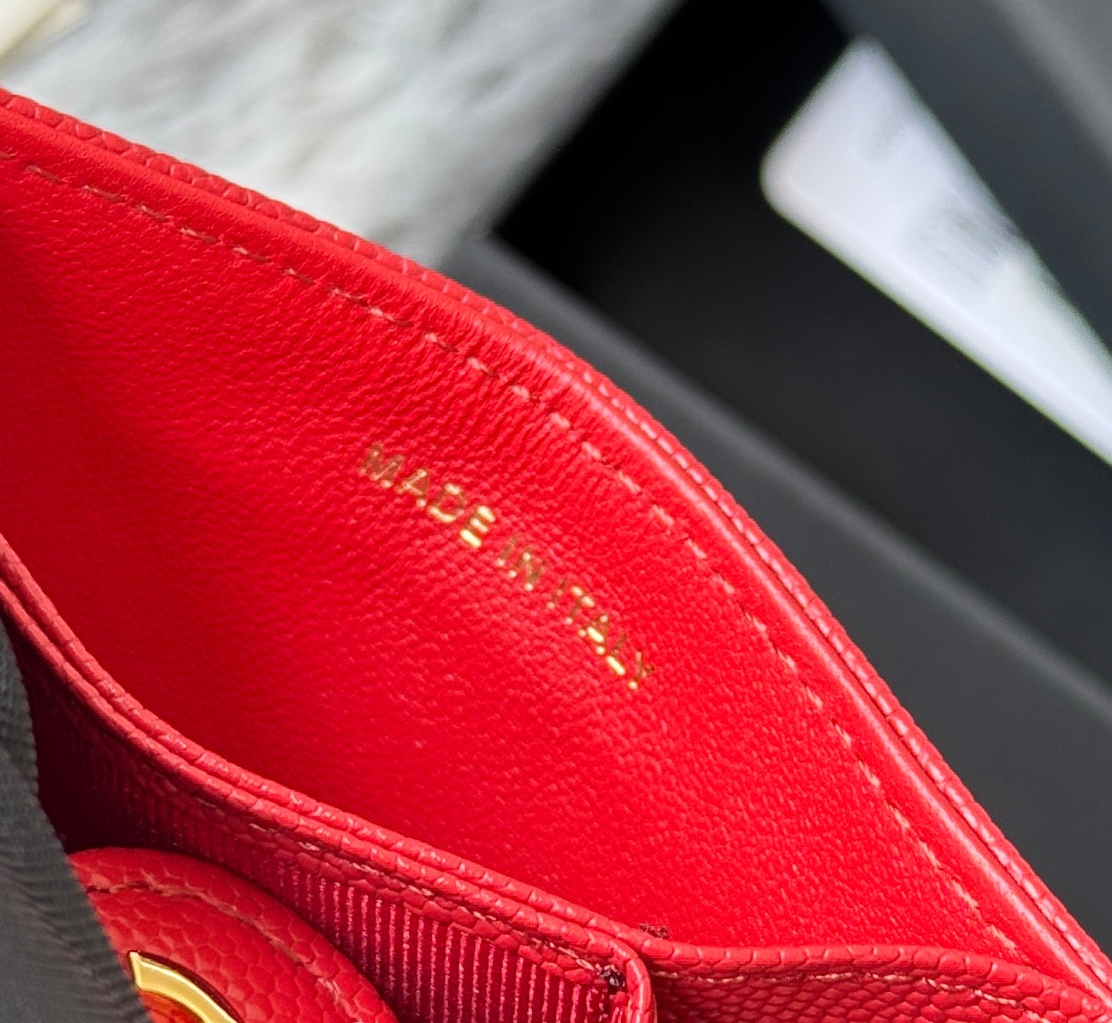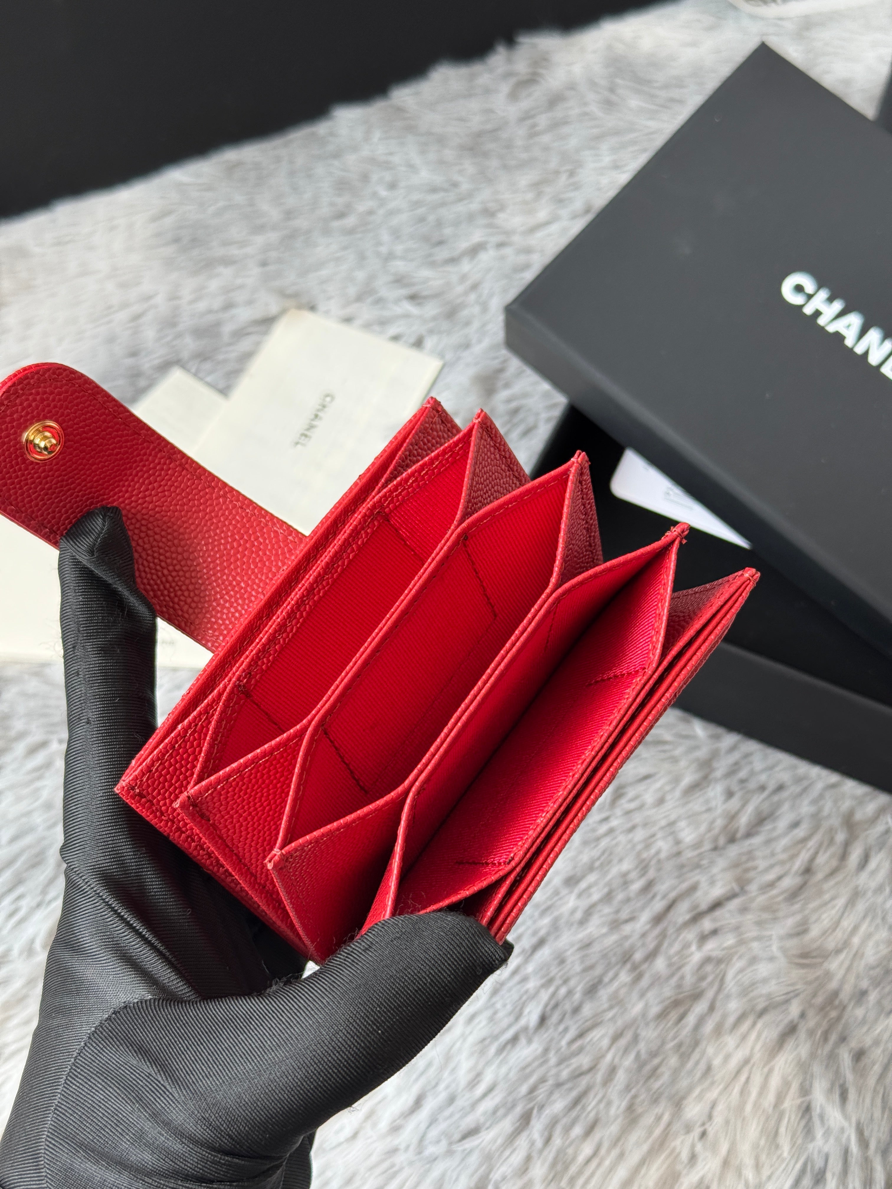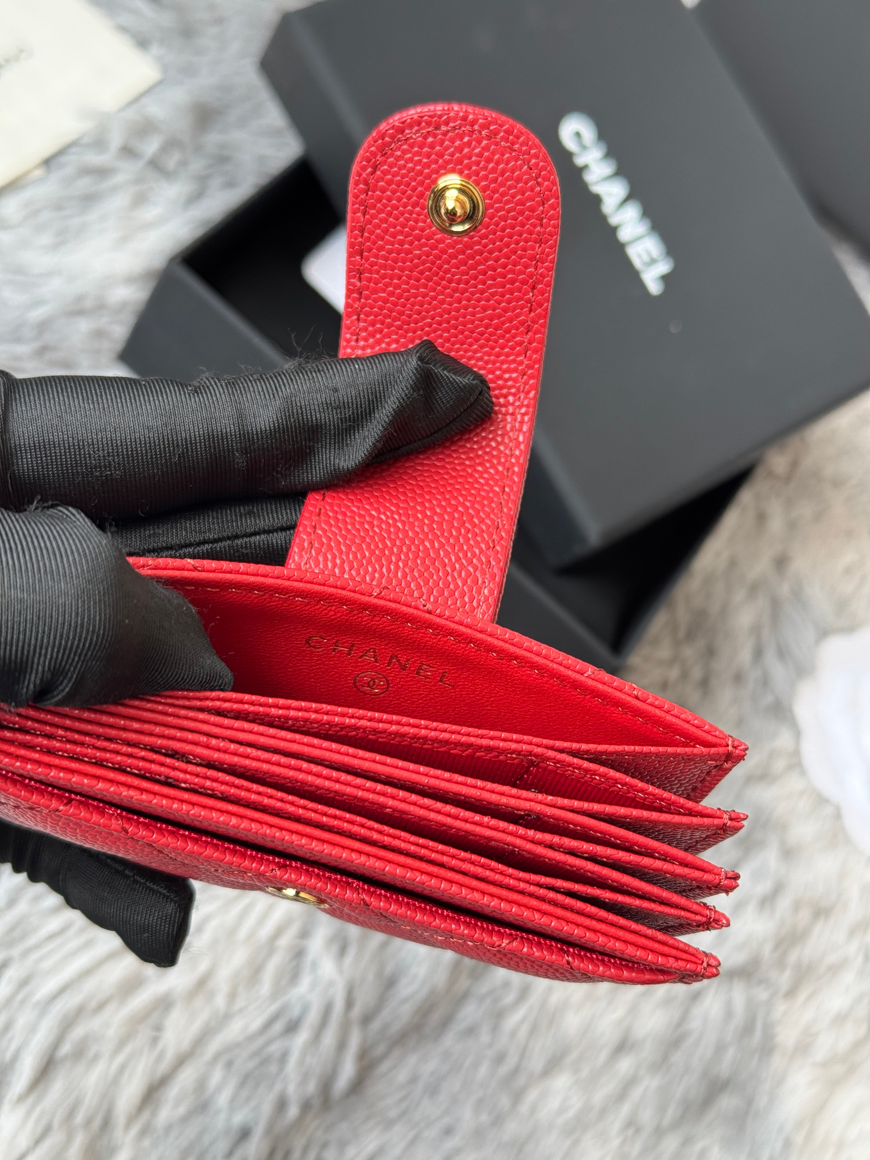 CARD HOLDER 10 CIRCLE CLASP IN RED CAVIAR LEATHER GOLD-TONE METALLIC