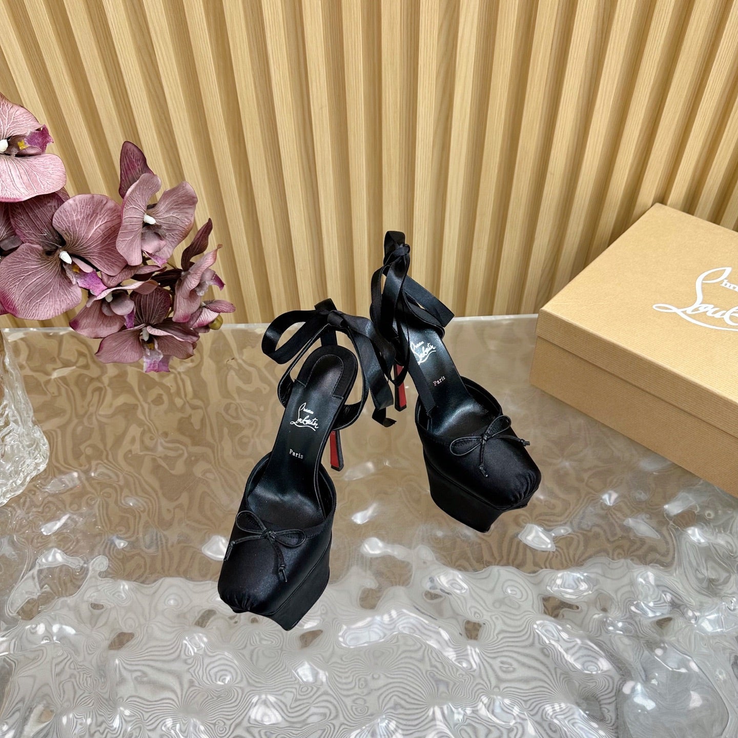 CASSIA LACE UP PLATFORM 155MM IN BLACK SATIN