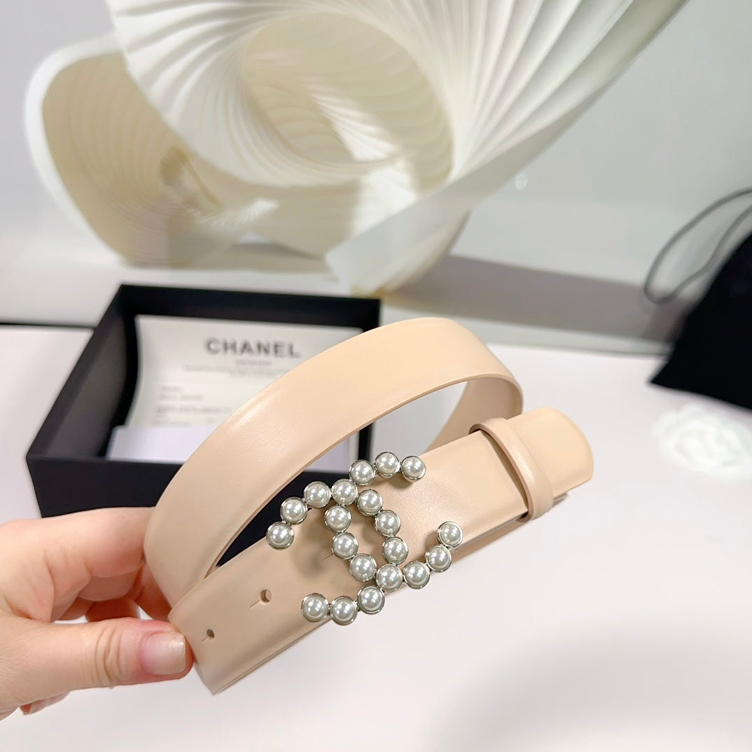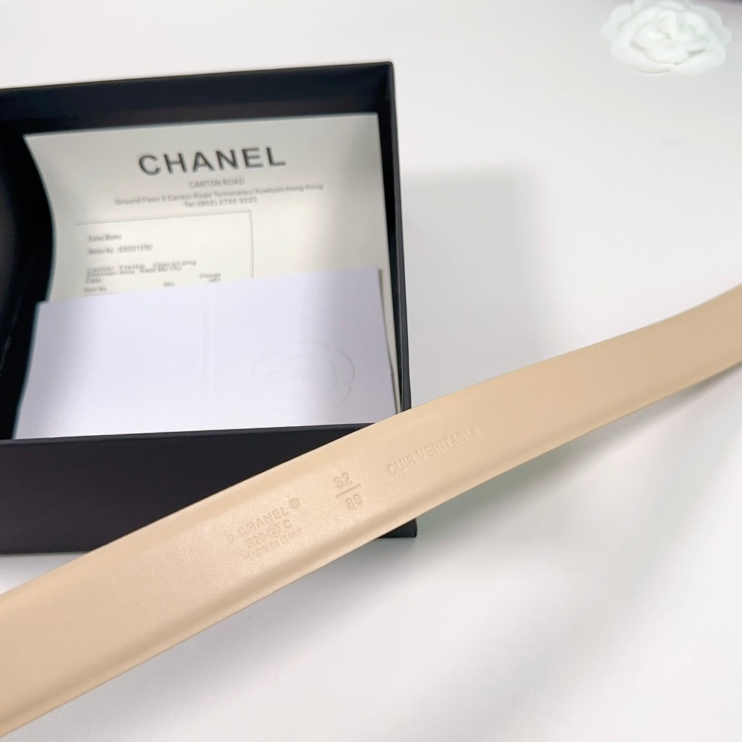 CC BELT 30 MM IN BISQUE BEIGE SMOOTH CALFSKIN WITH SILVER HARDWARE ATTACH PEARL