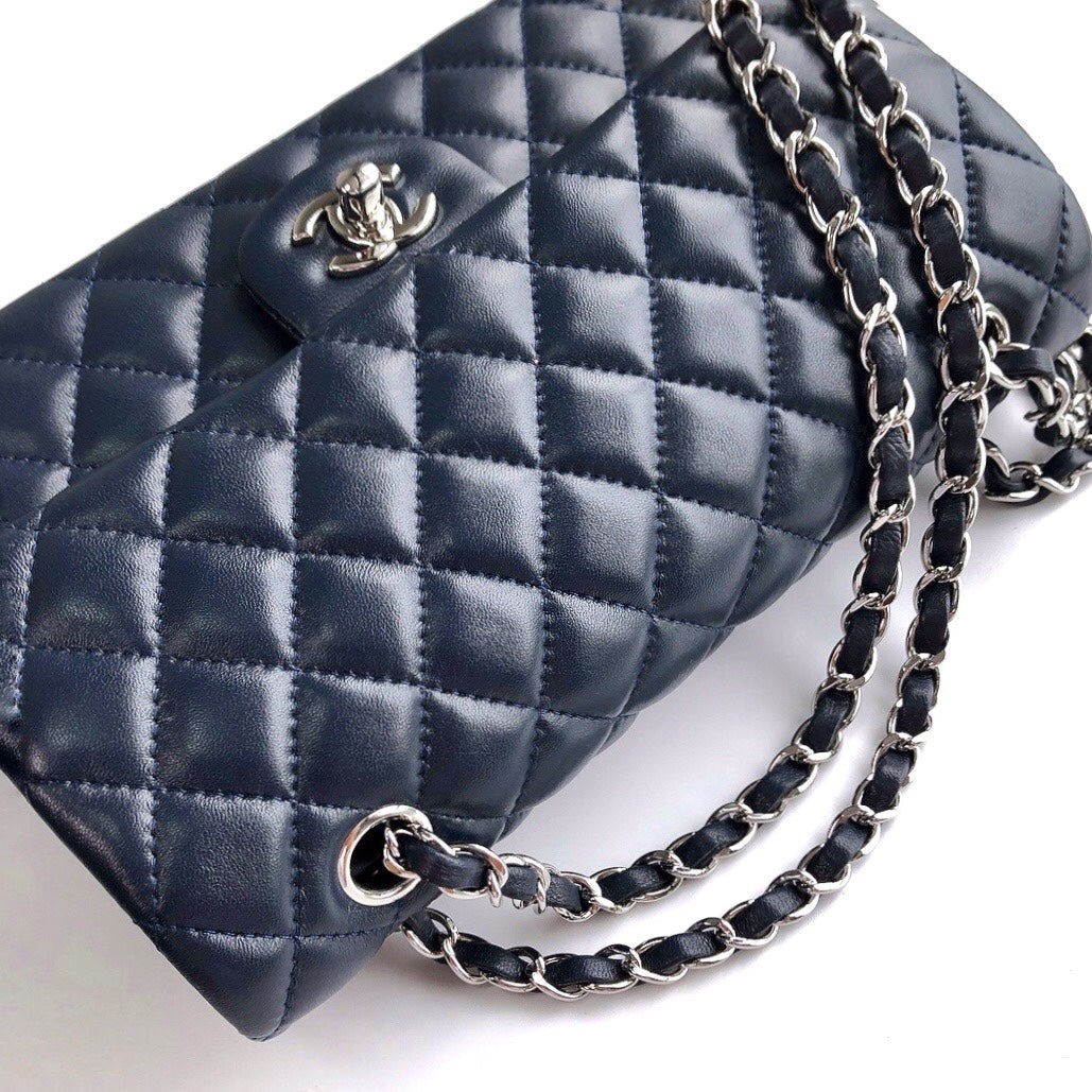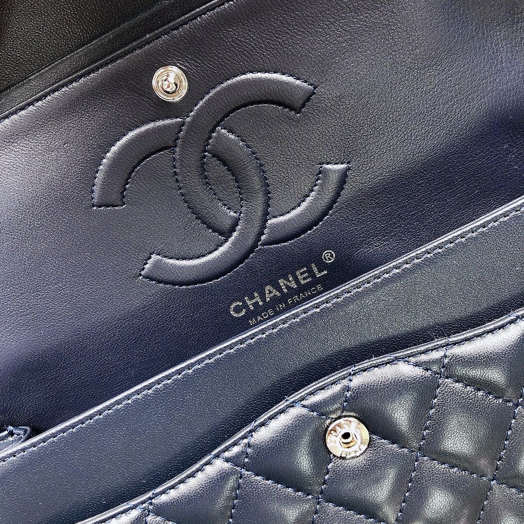 CC CLASSIC FLAP BAG 25 IN NAVY BLUE LAMBSKIN SILVER HARDWARE