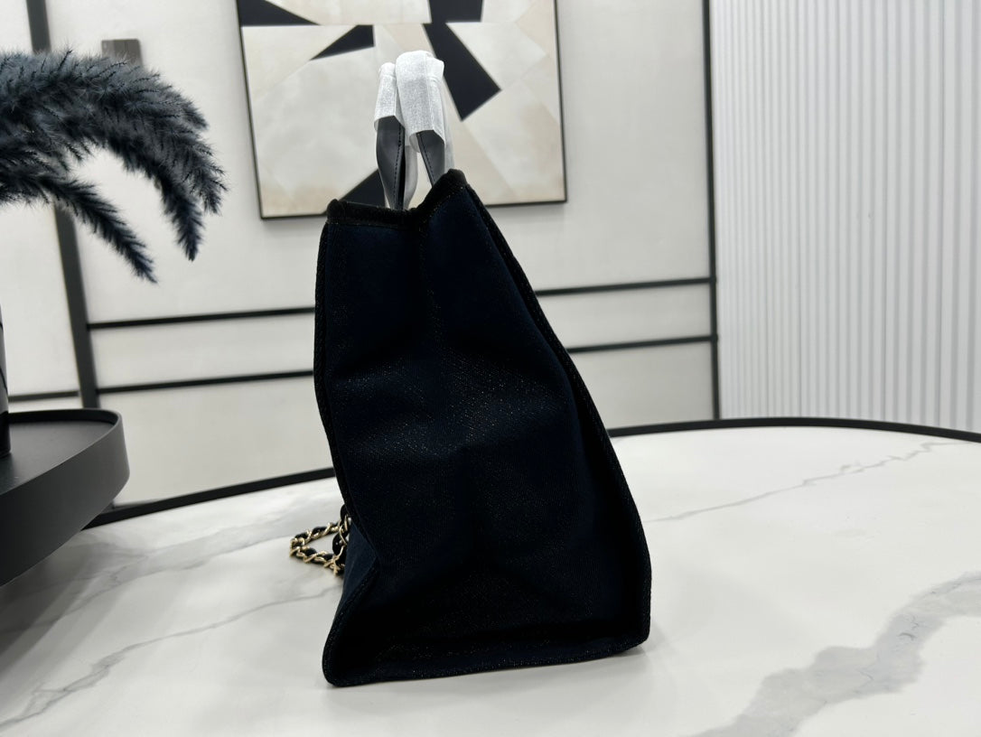 CC DEAUVILLE LARGE 38 TOTE BAG IN BLACK CANVAS WITH GOLD EMBROIDERED LOGO