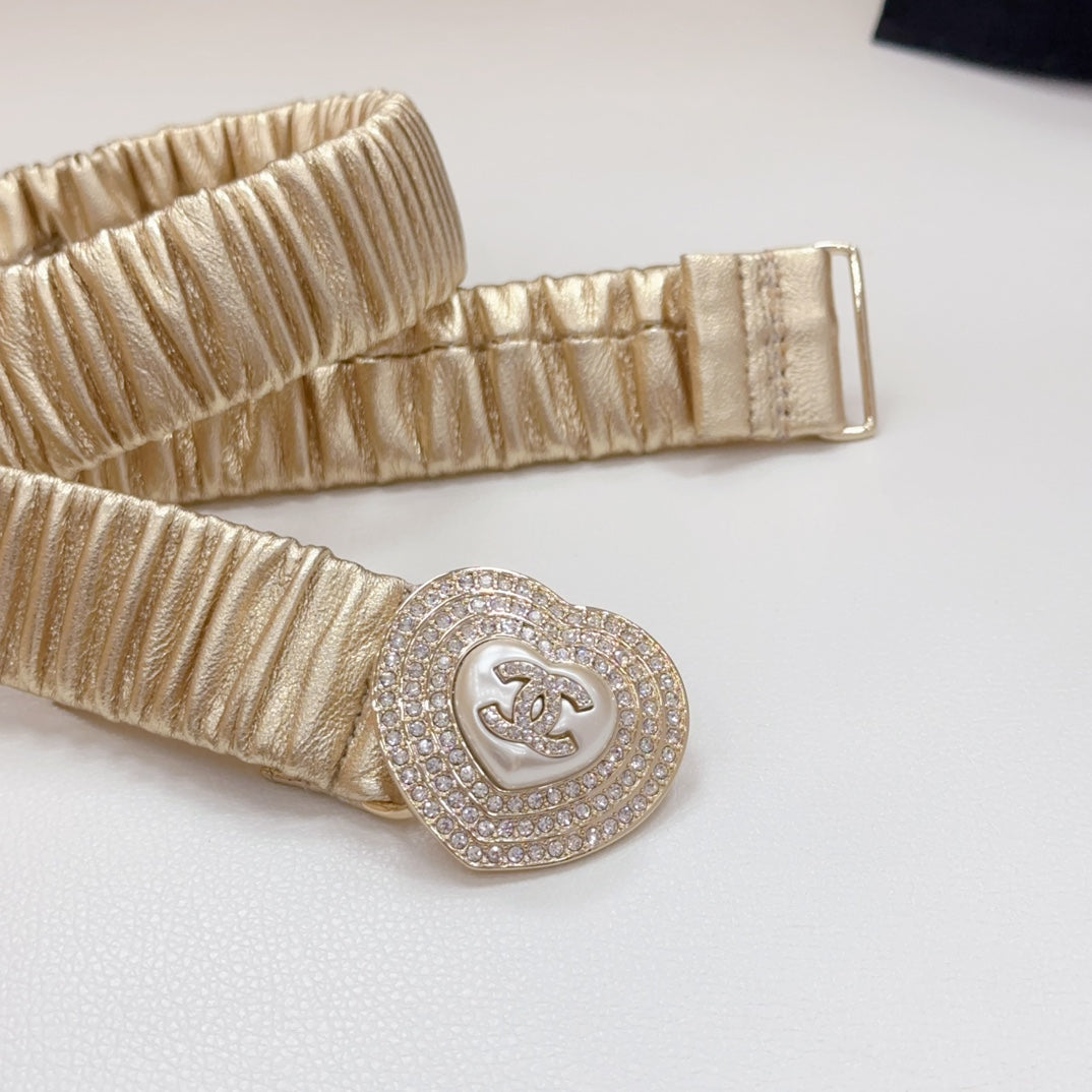 CC ELASTIC 30 MM BELT HEART BUCKLE IN GOLDEN CHIFFON CALFSKIN GOLD HARDWARE ATTACH RHINSTONES