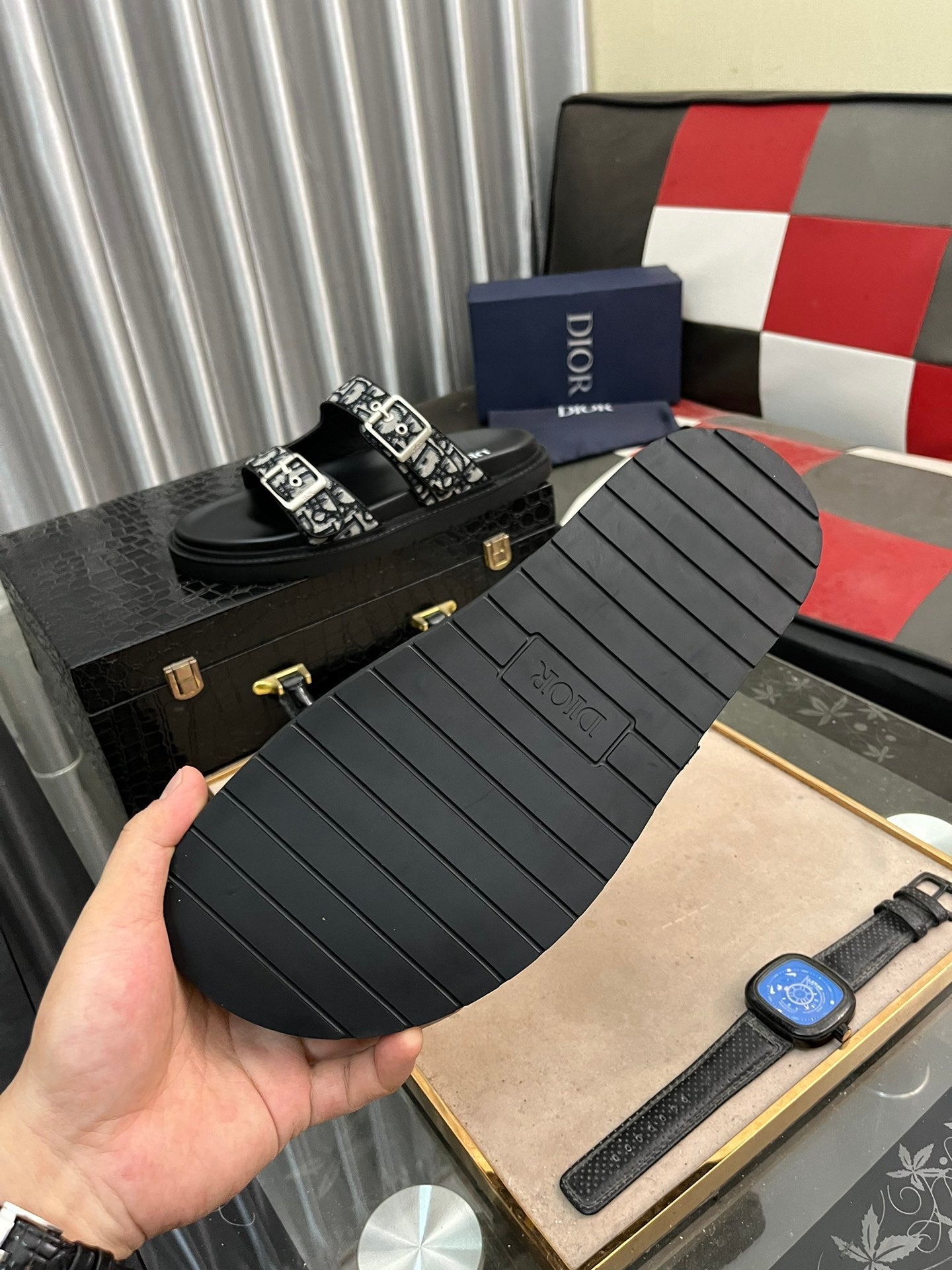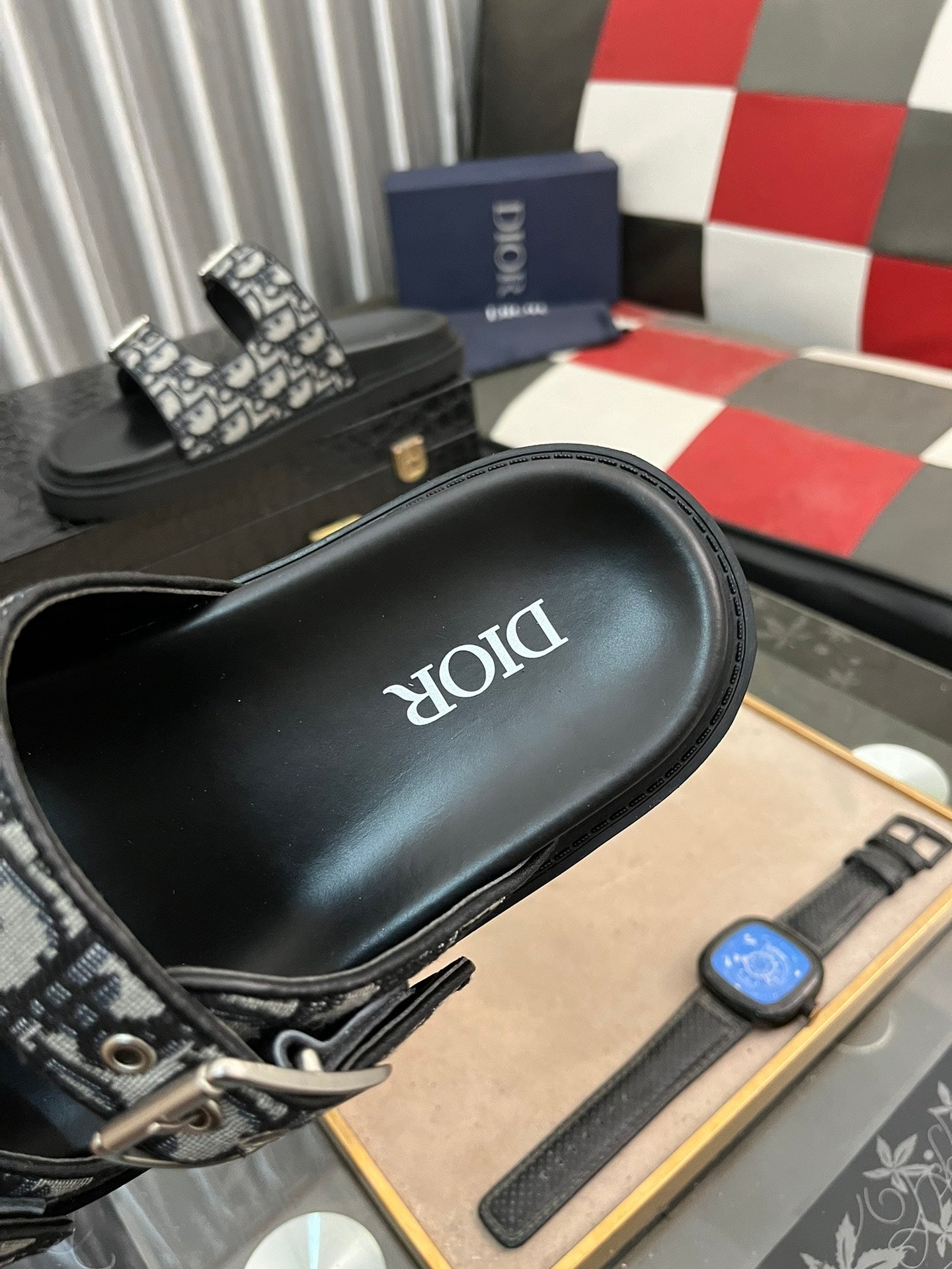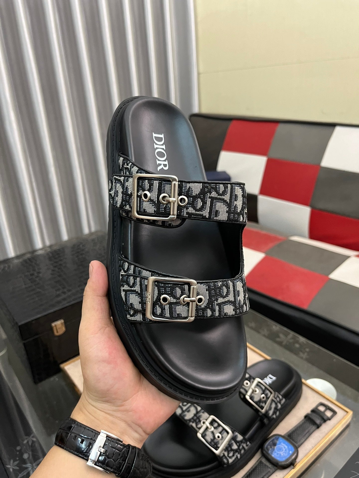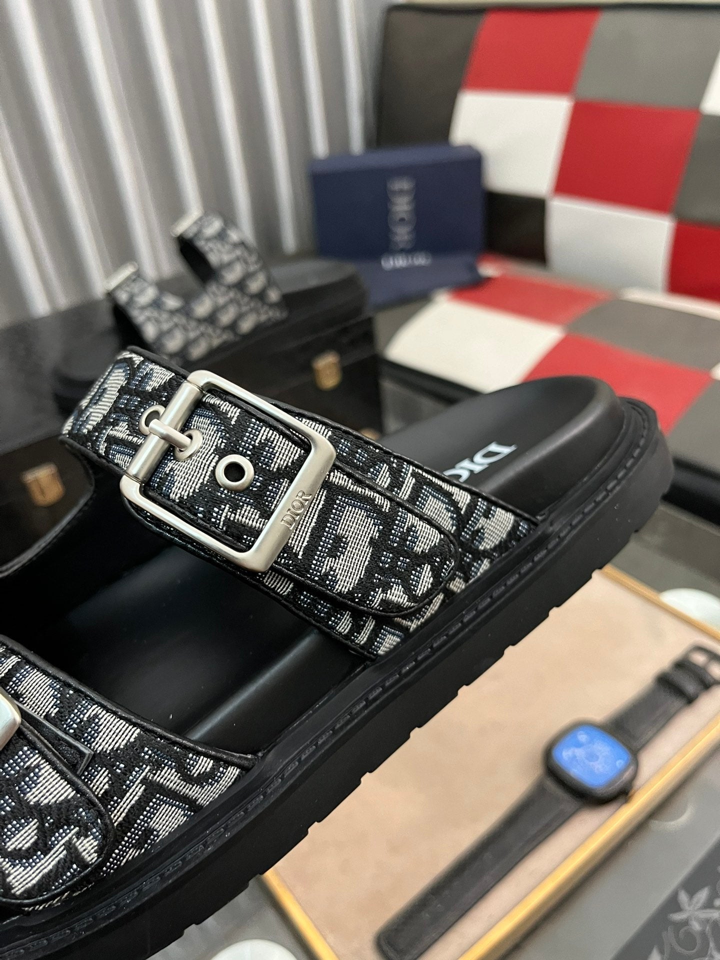 CD AQUA BUCKLE SANDAL BLACK AND GRAY JACQUARD