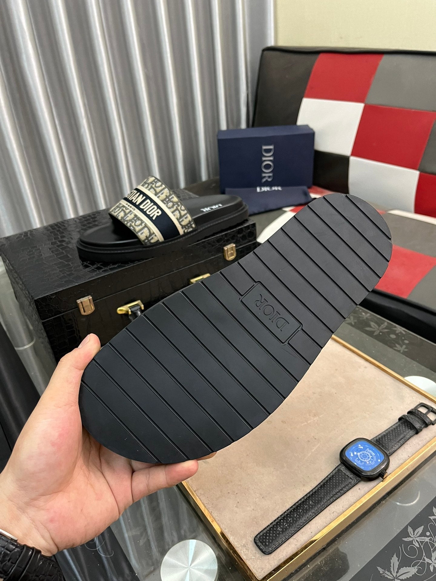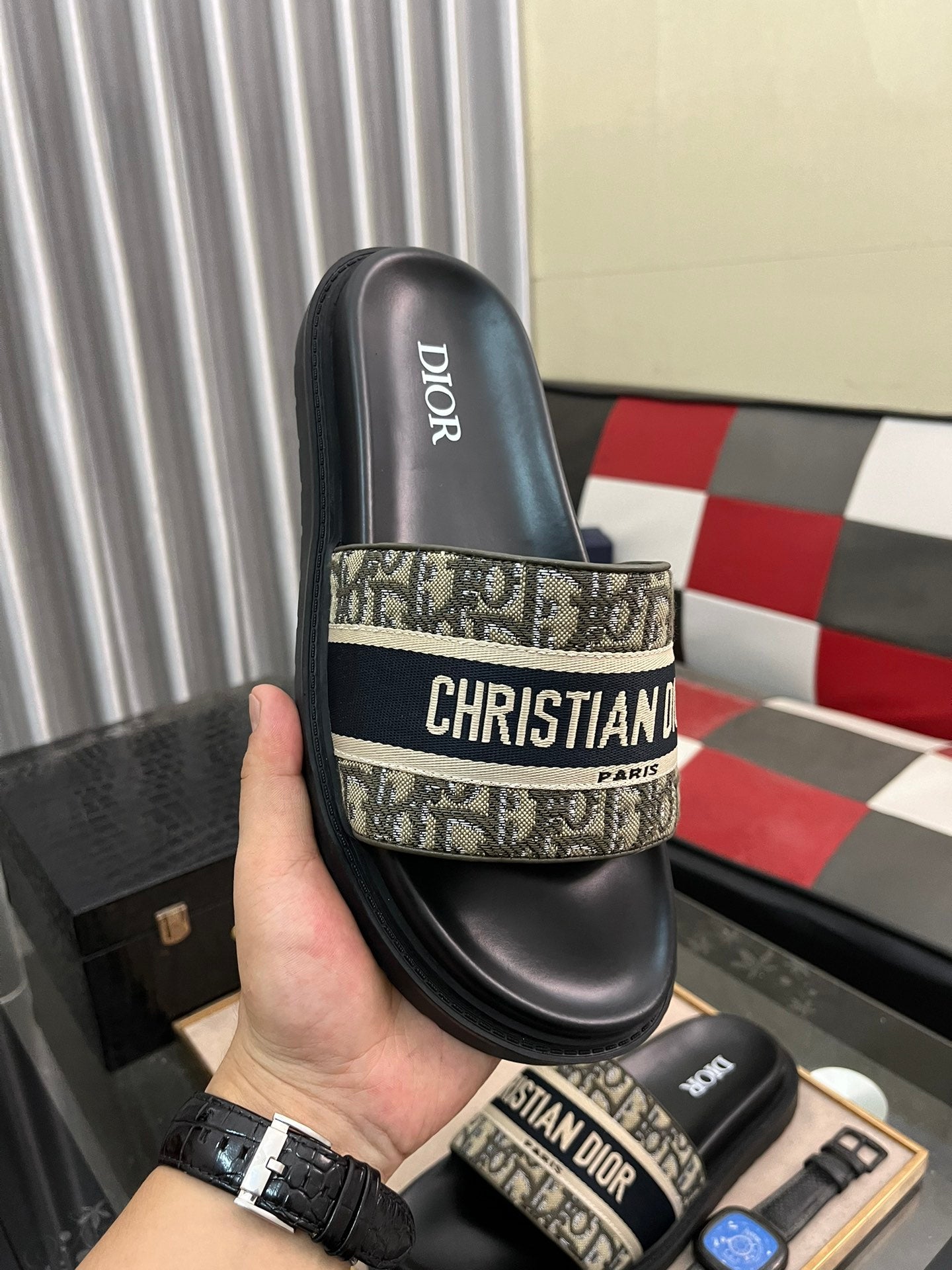 CD SLIDE LETTER SLIPPER BLACK AND SAGE CALFSKIN