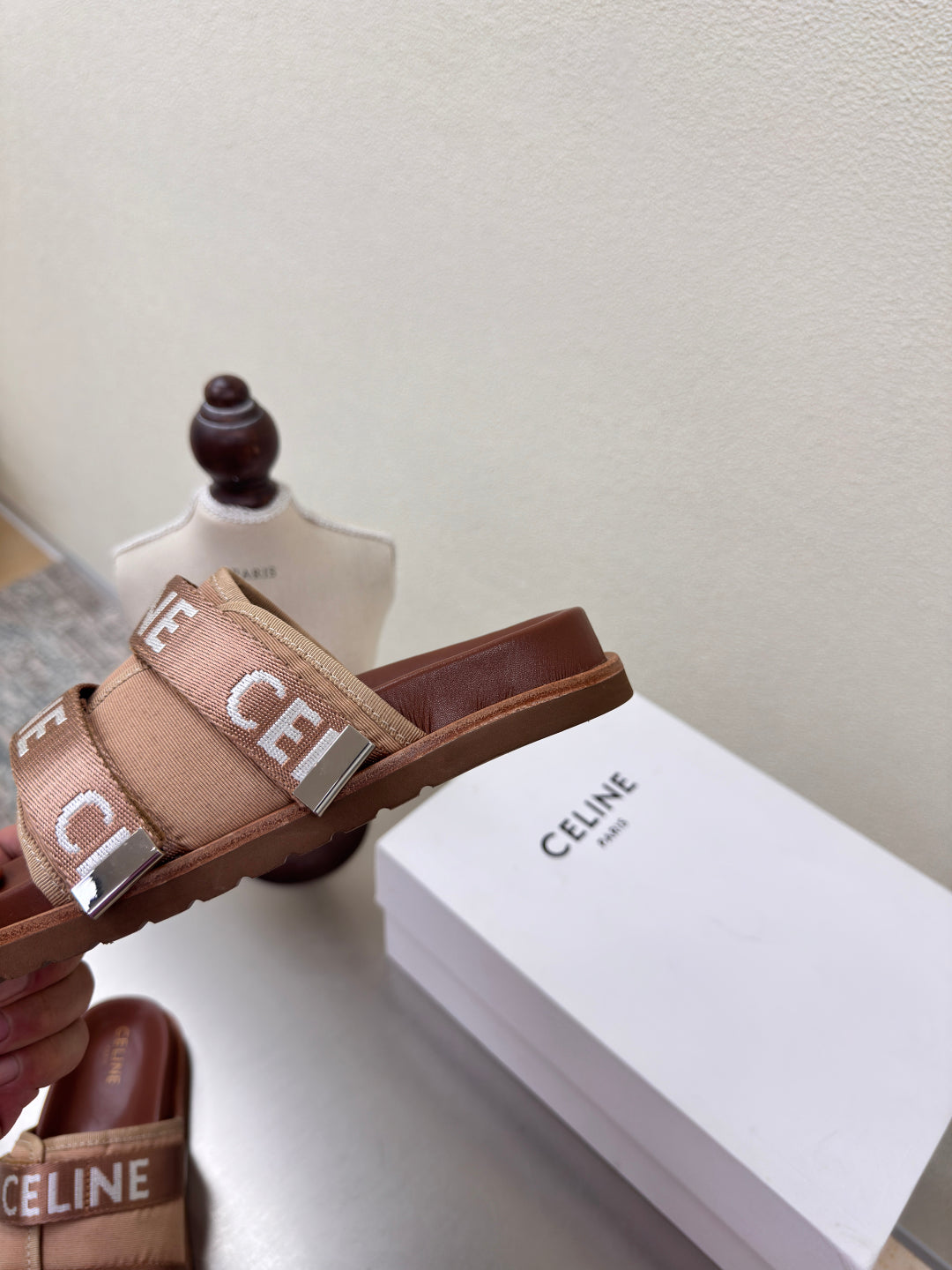 CELINE 25S FLAT SANDALS ARC DE TRIOMPHE IN BROWN CALFSKIN AND CANVAS