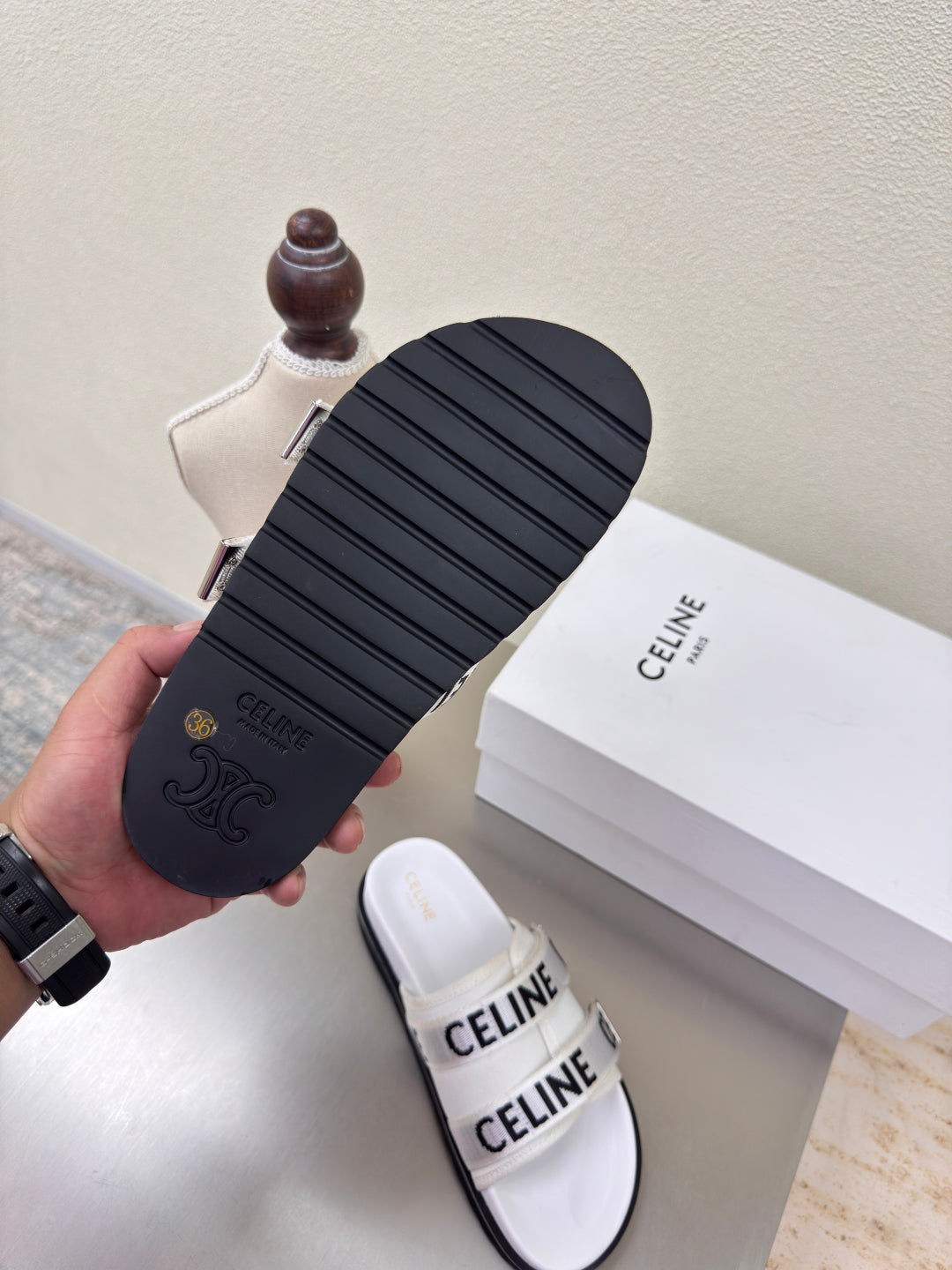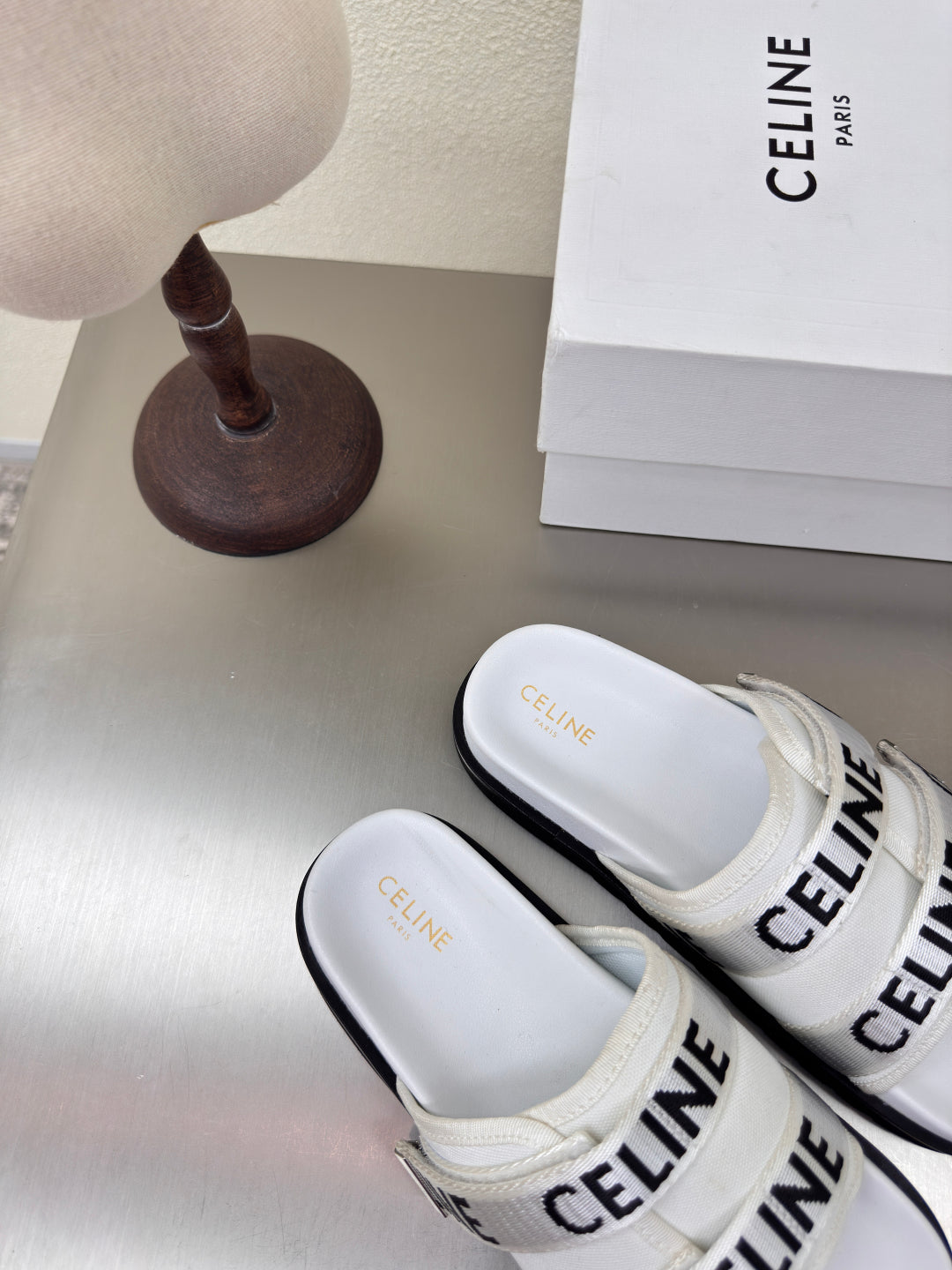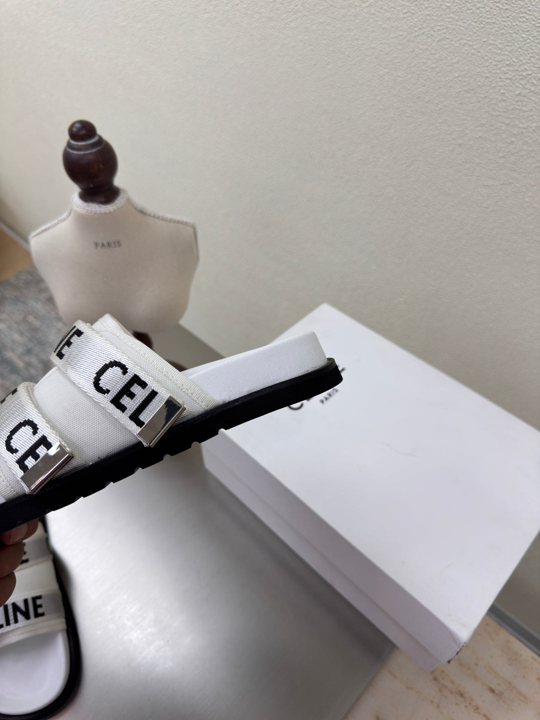CELINE 25S FLAT SANDALS ARC DE TRIOMPHE IN WHITE CALFSKIN AND CANVAS