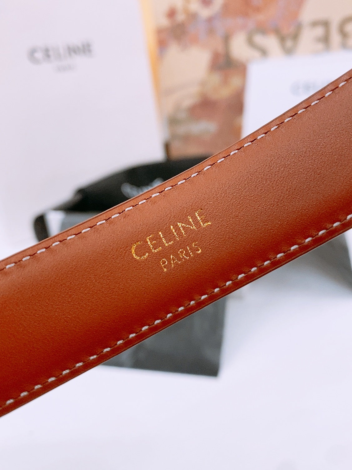 CELINE 25S TRIOMPHE BELT 25MM IN DARK CARAMEL CALFSKIN GOLD HARDWARE 570967