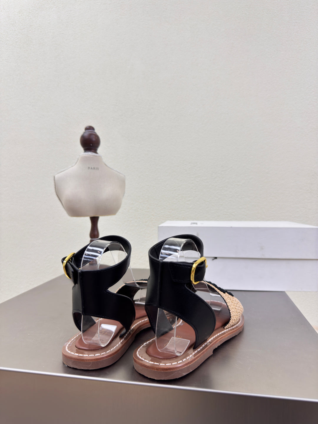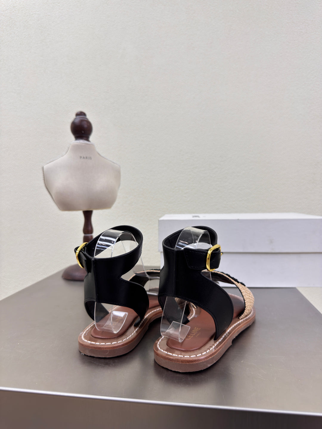 CELINE 25S TRIOMPHE SANDALS BEIGE RAFFIA BLACK WOOL